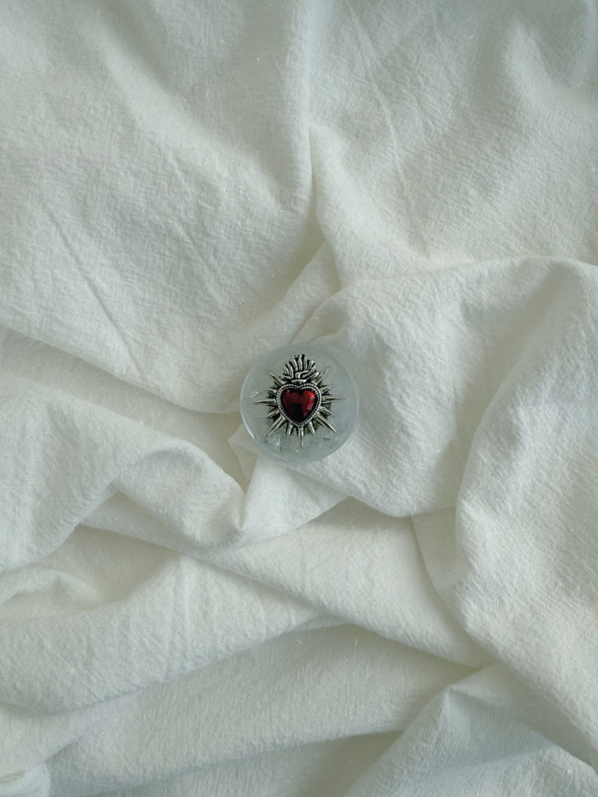 This pebble is a marbled white, silver and sparkly base with a silver framed sacred heart on top.