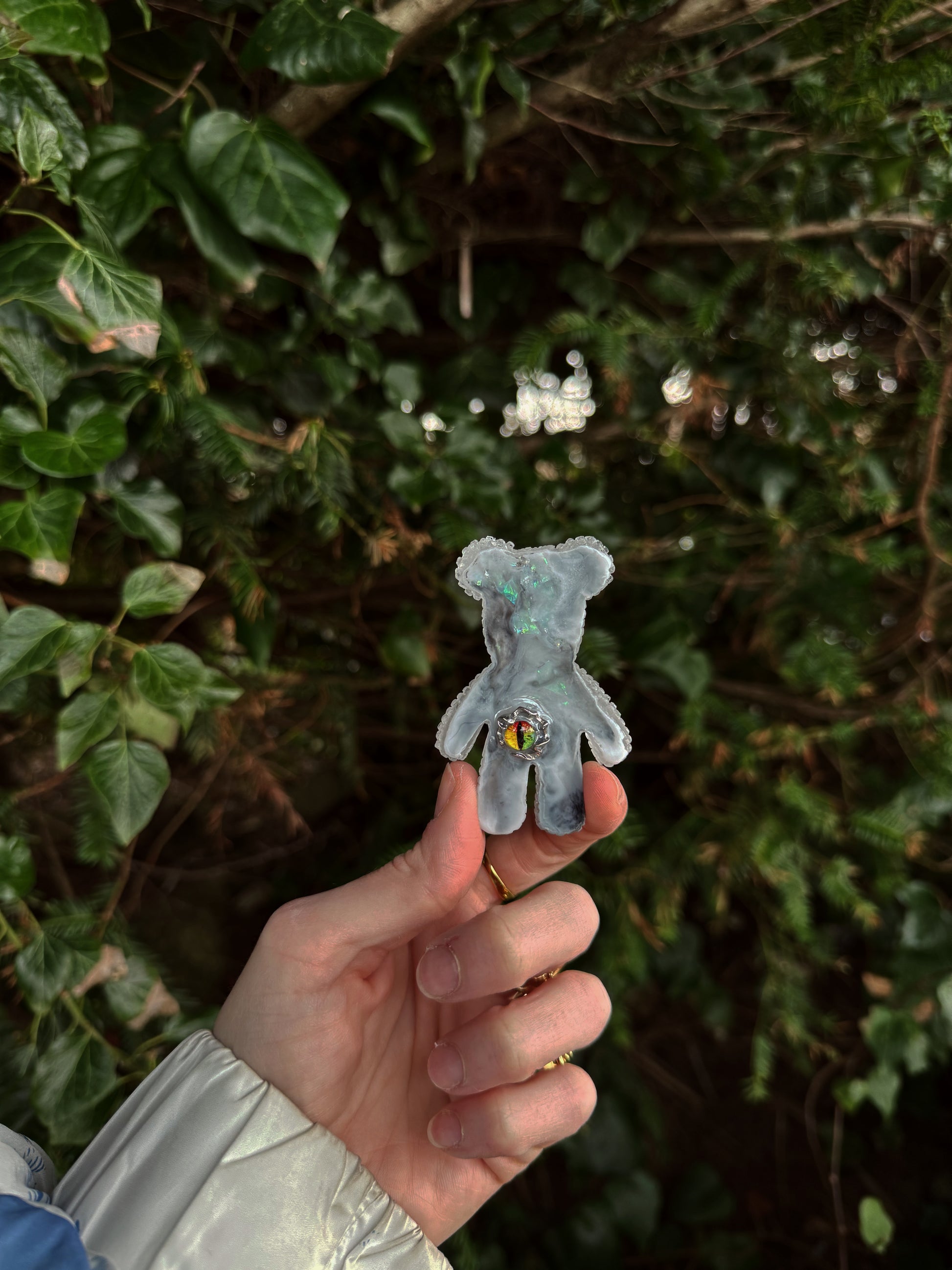 This double sided Jagger bear is layered beauty, we have a clear base, then a layer of grey smokey marble sprinkled with iridescent chunky glitter, the iridescent glitter shines through both sides and can be seen from the front, on the back there is one single dragon eye, a silver frame and a yellow / red / green eye inside stands out off of the bear. This bear heros a smooth back with only one singular point of texture.