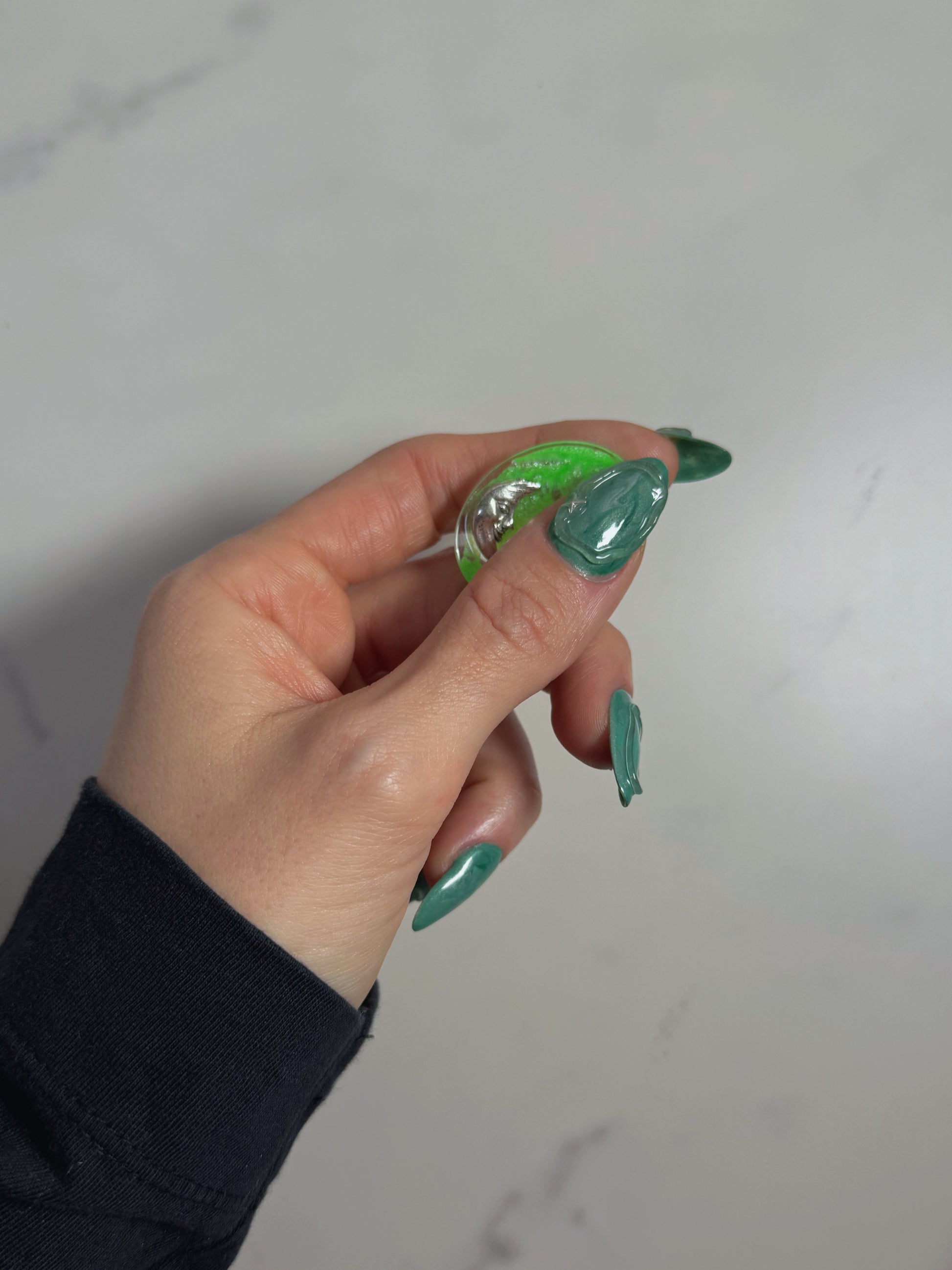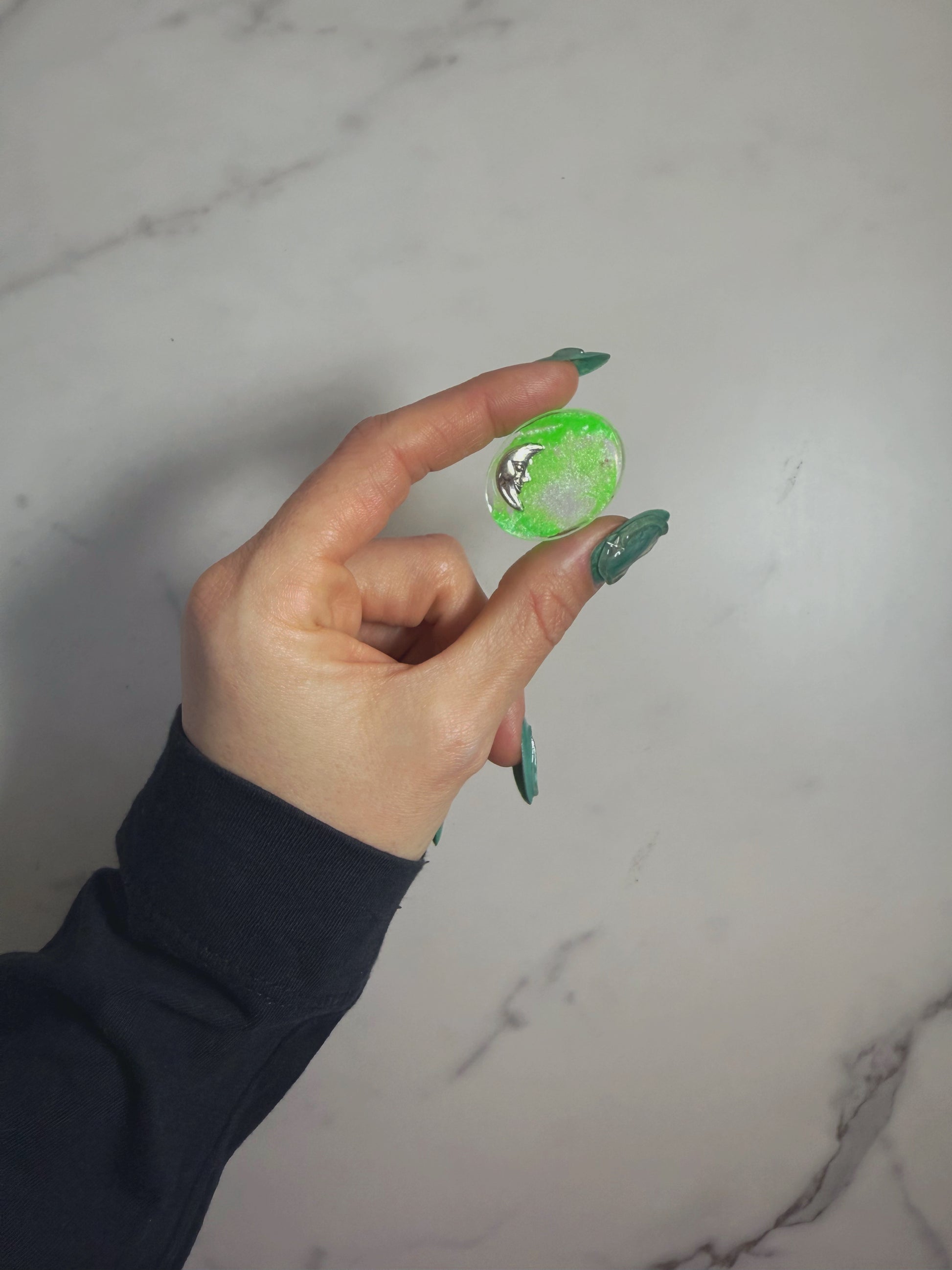 Hello new baby, fresh for November 2025 this tiny oval girl is the perfect addition to your pocket. This gorgeous oval is a neon green shimmer base with a silver moon face to one side.