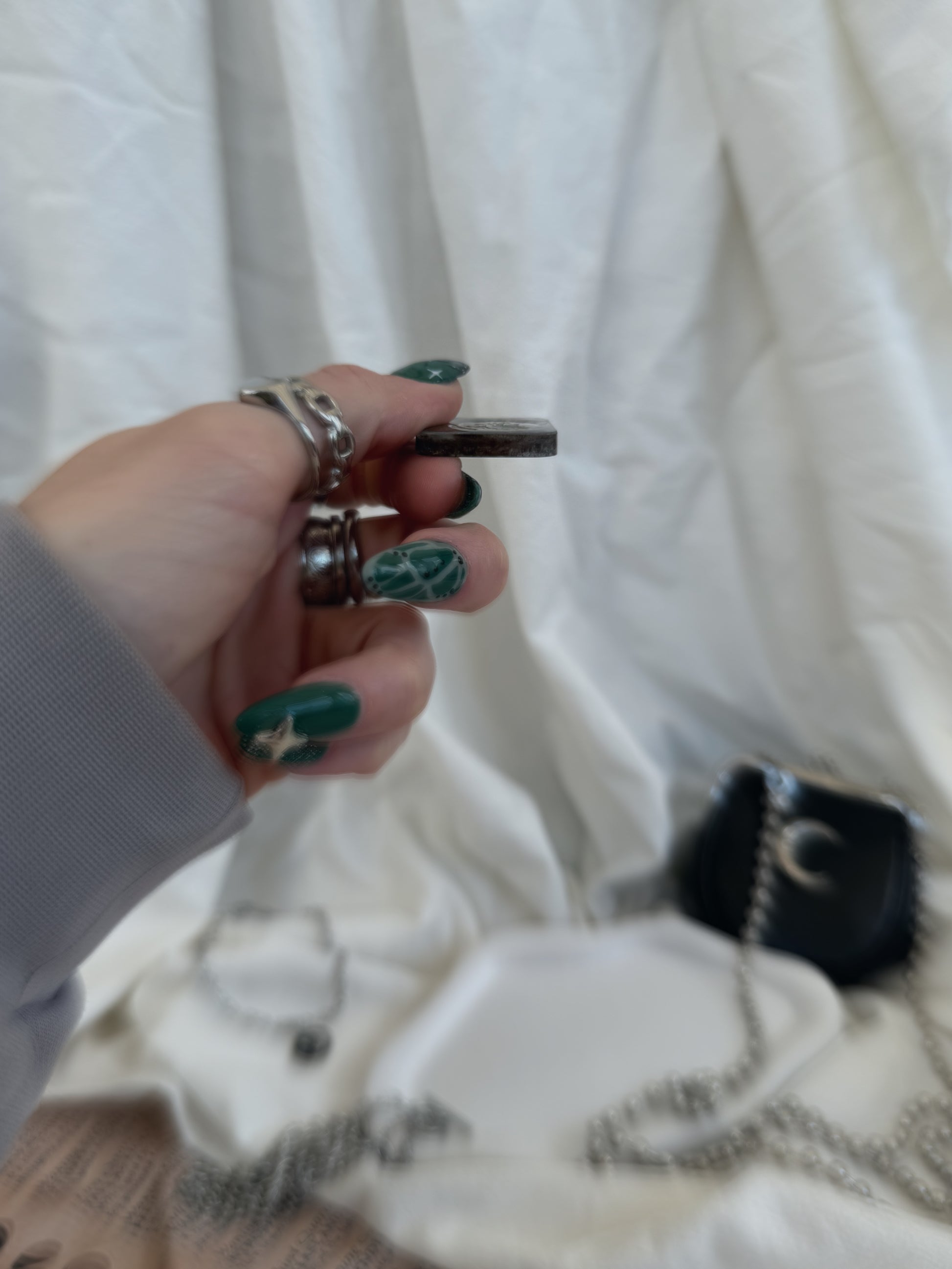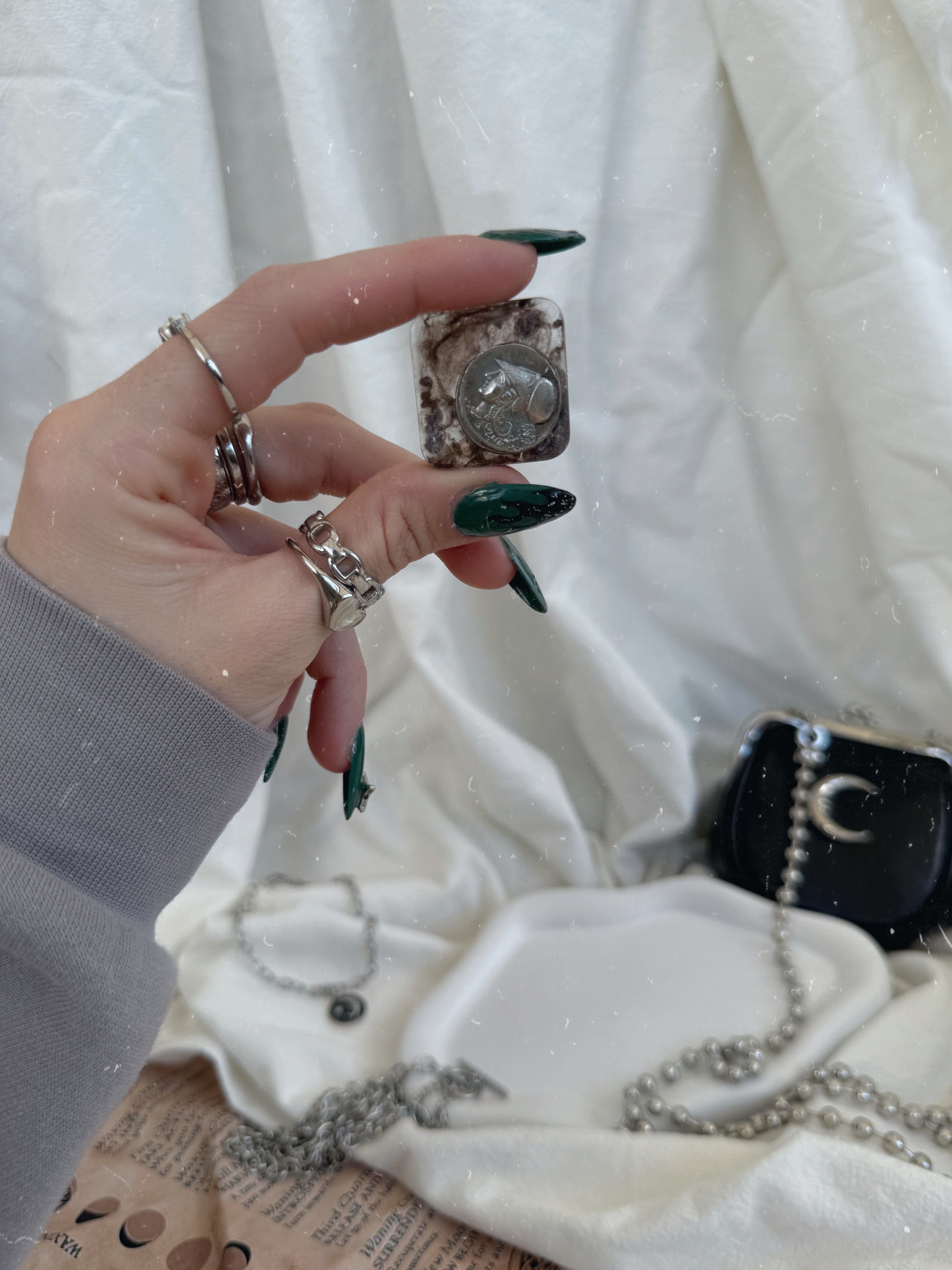 Hello new baby, fresh for November 2025 our mini square is a tiny pocket piece, it’s transparent and shiny brown neutral themed base, on top of the base there is a metal silver faux roman coin, the coin has a 3d pattern on the top to give you two textures under your finger tips.