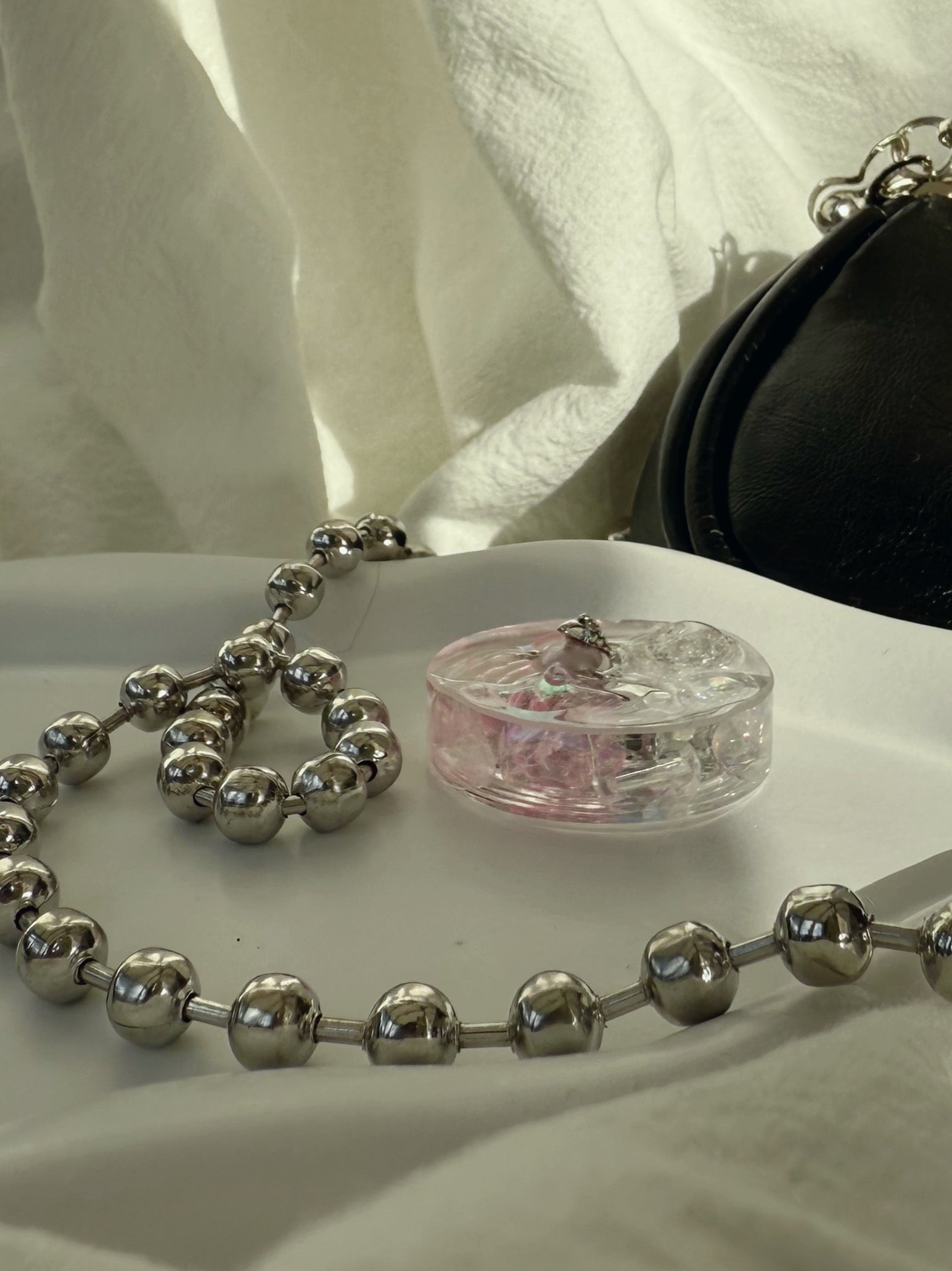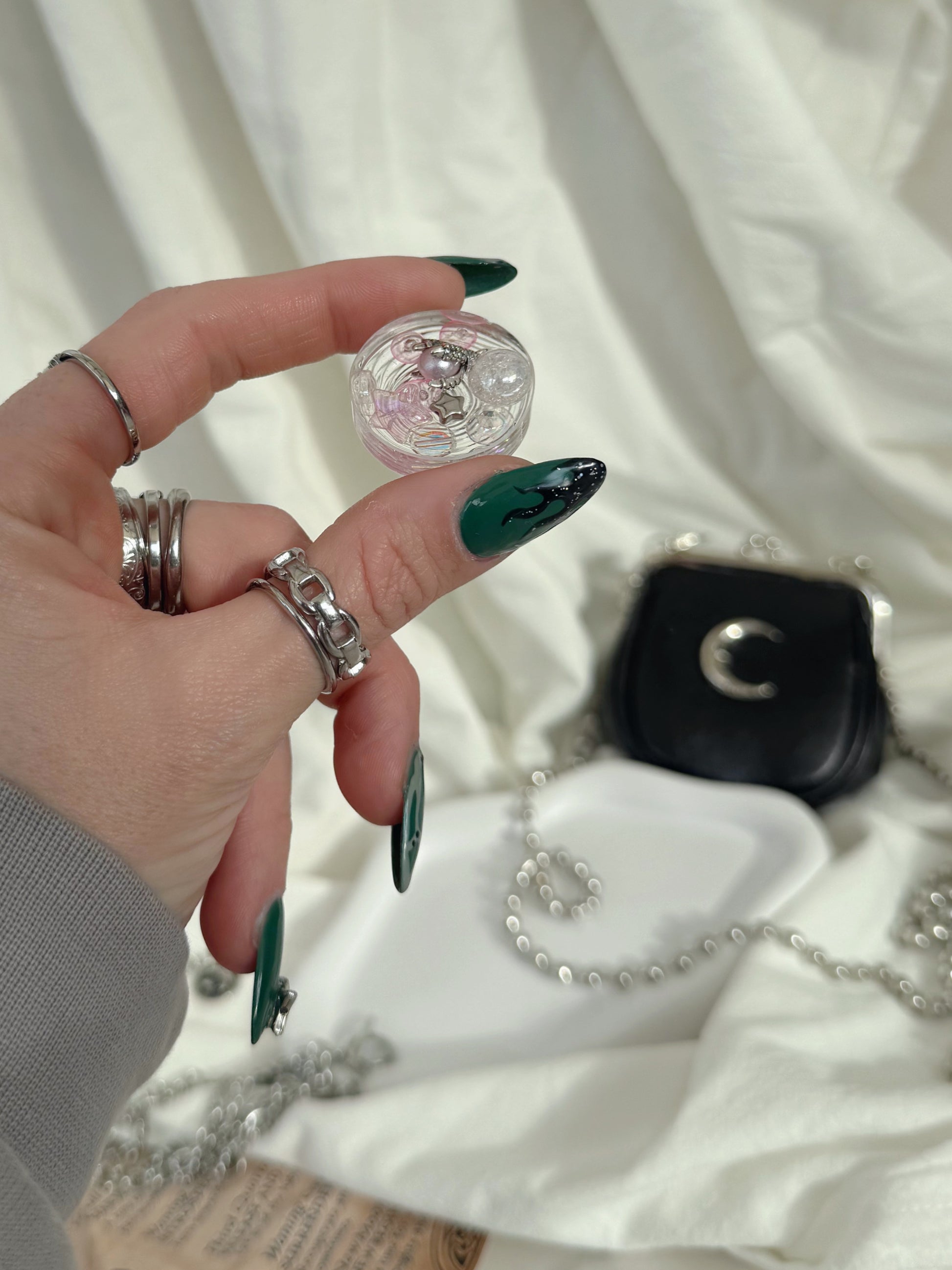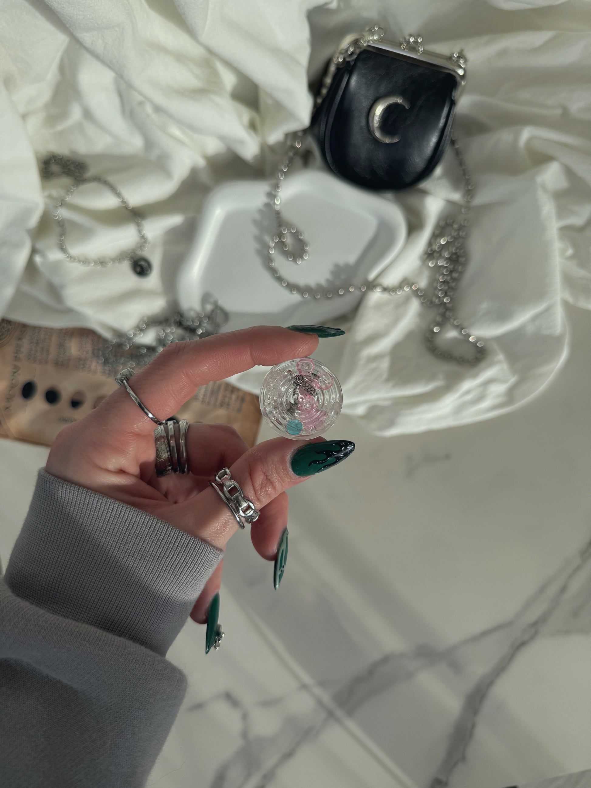 This little fidget is a transparent base with clear, pink, silver and white pieces inside, the main component of this piece is a silver coloured dragon claw holding a pink gem.