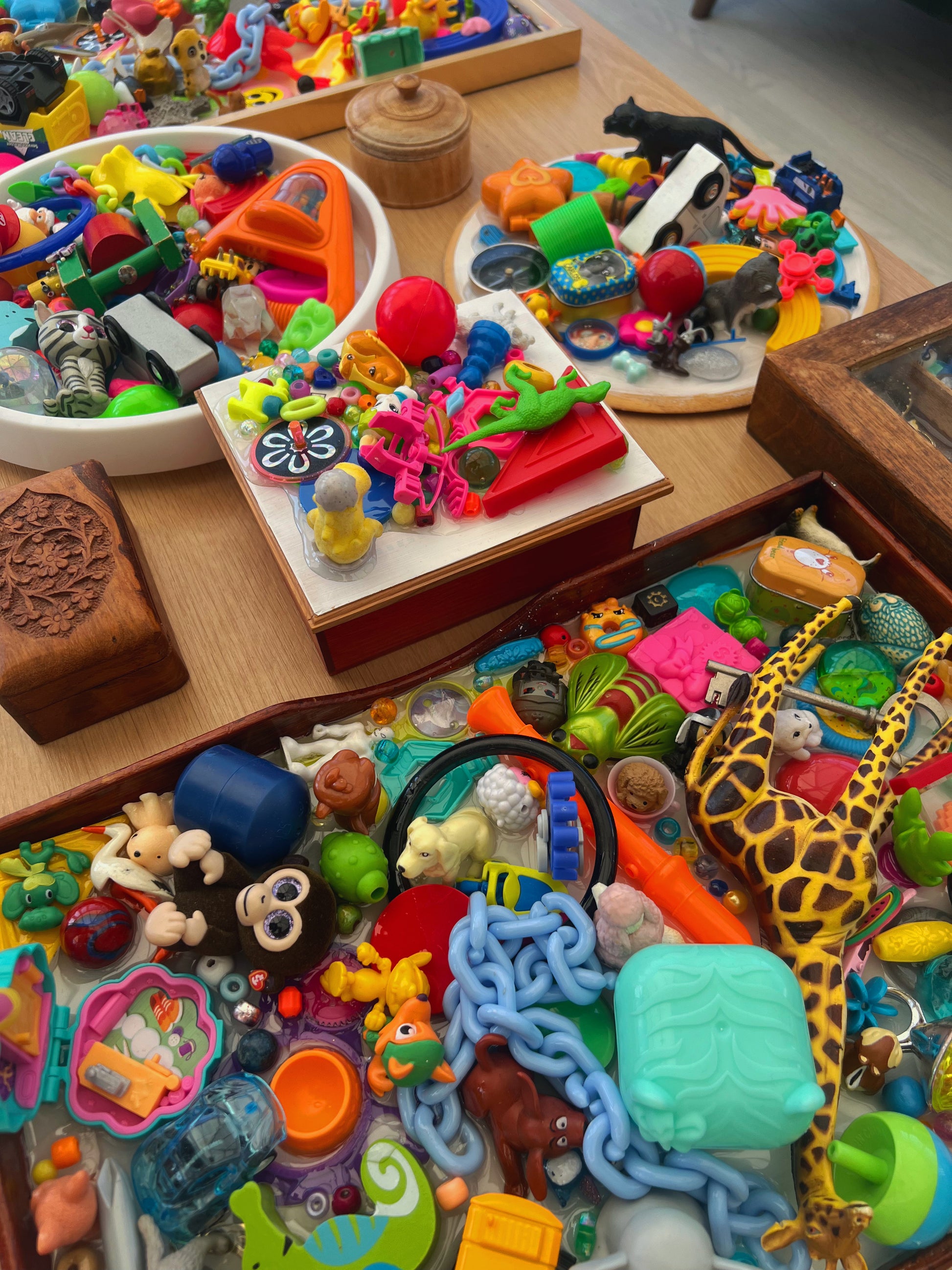 This is a recycled base, its a walnut coloured wooden tea tray, she is FULL to the brim of recycled toys and plastic pieces. Everything in this tray has been saved from landfill to create a multi moving, multi textured huge piece. This tray can not be carried around in your bag, it needs to be used on a flat surface.
