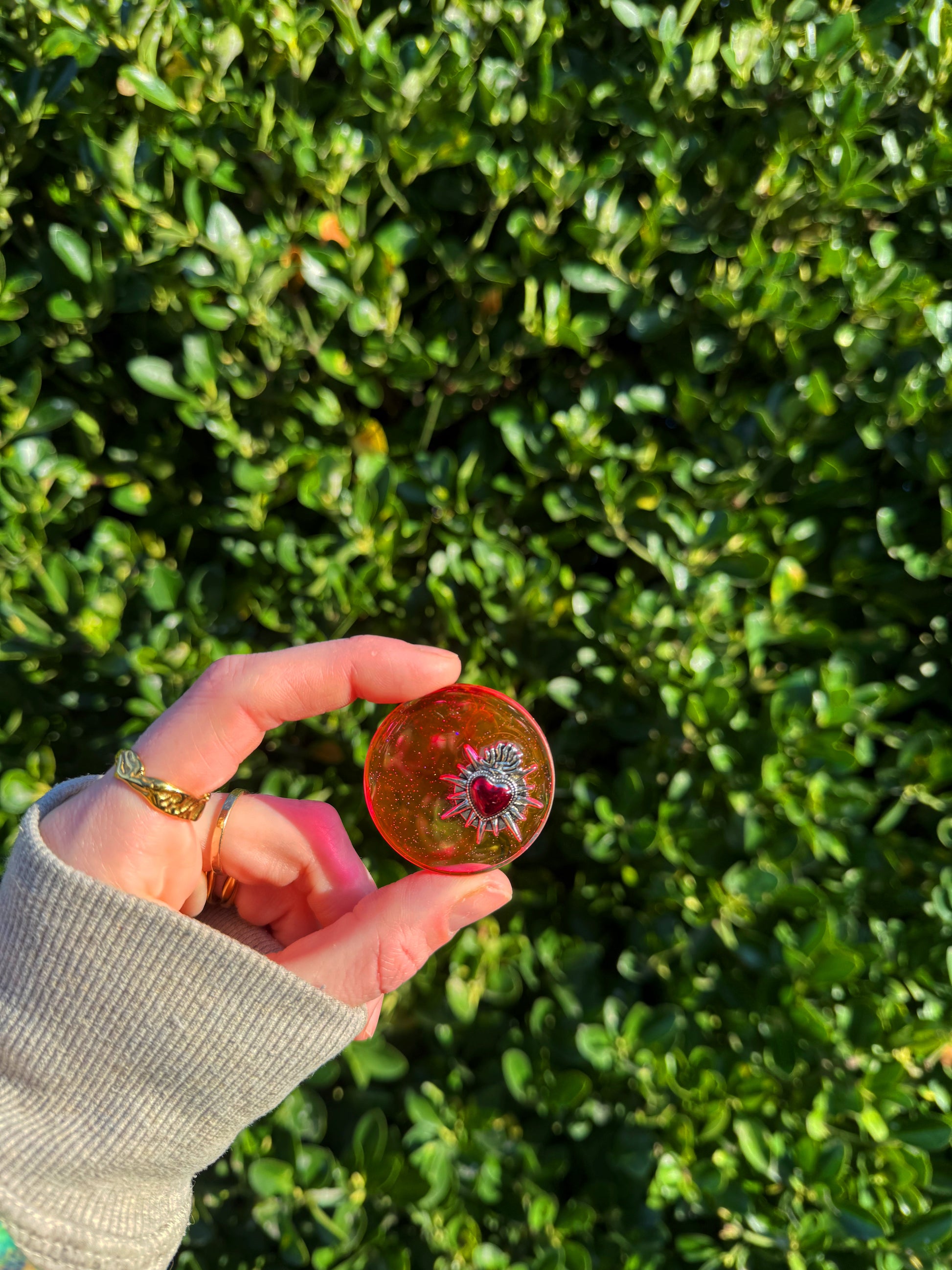 This orb is a transparent hot pink base with a silver holographic glitter through out, on top is a red sacred heart, its set to one side so that when you make a circle shape with your thumb you are getting part texture part smooth.