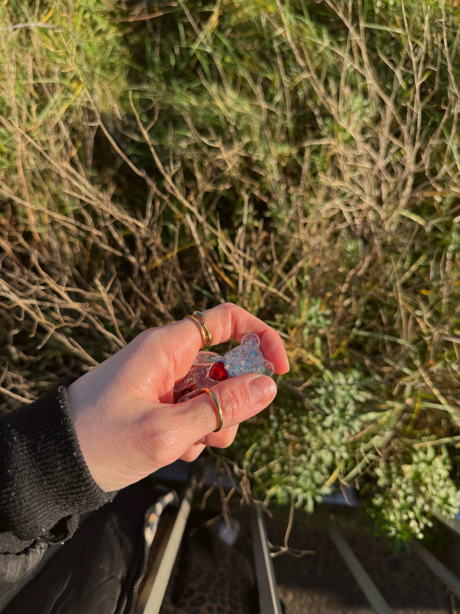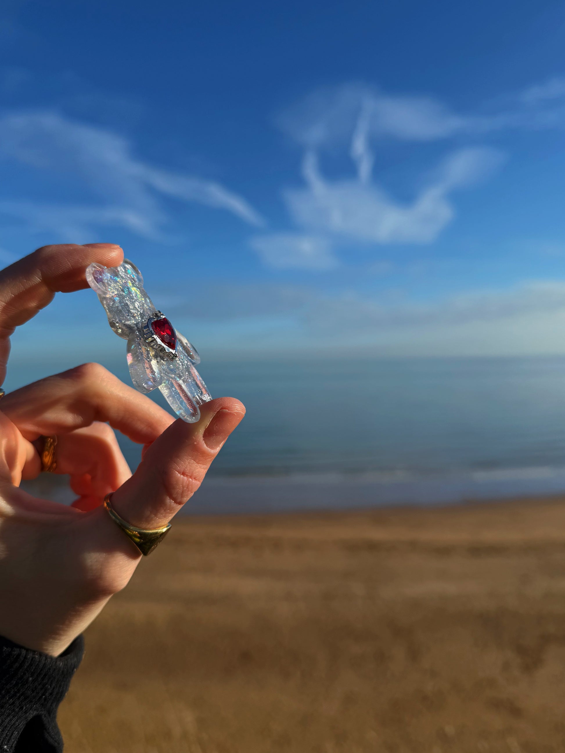 This worry bear is a shiny silver white iridescent mixed base with a large red gem on his back, the gem is our most textured worry bear yet, he is strong, however if you are someone who likes to throw items (we get it no stress) this isn’t the item for you.