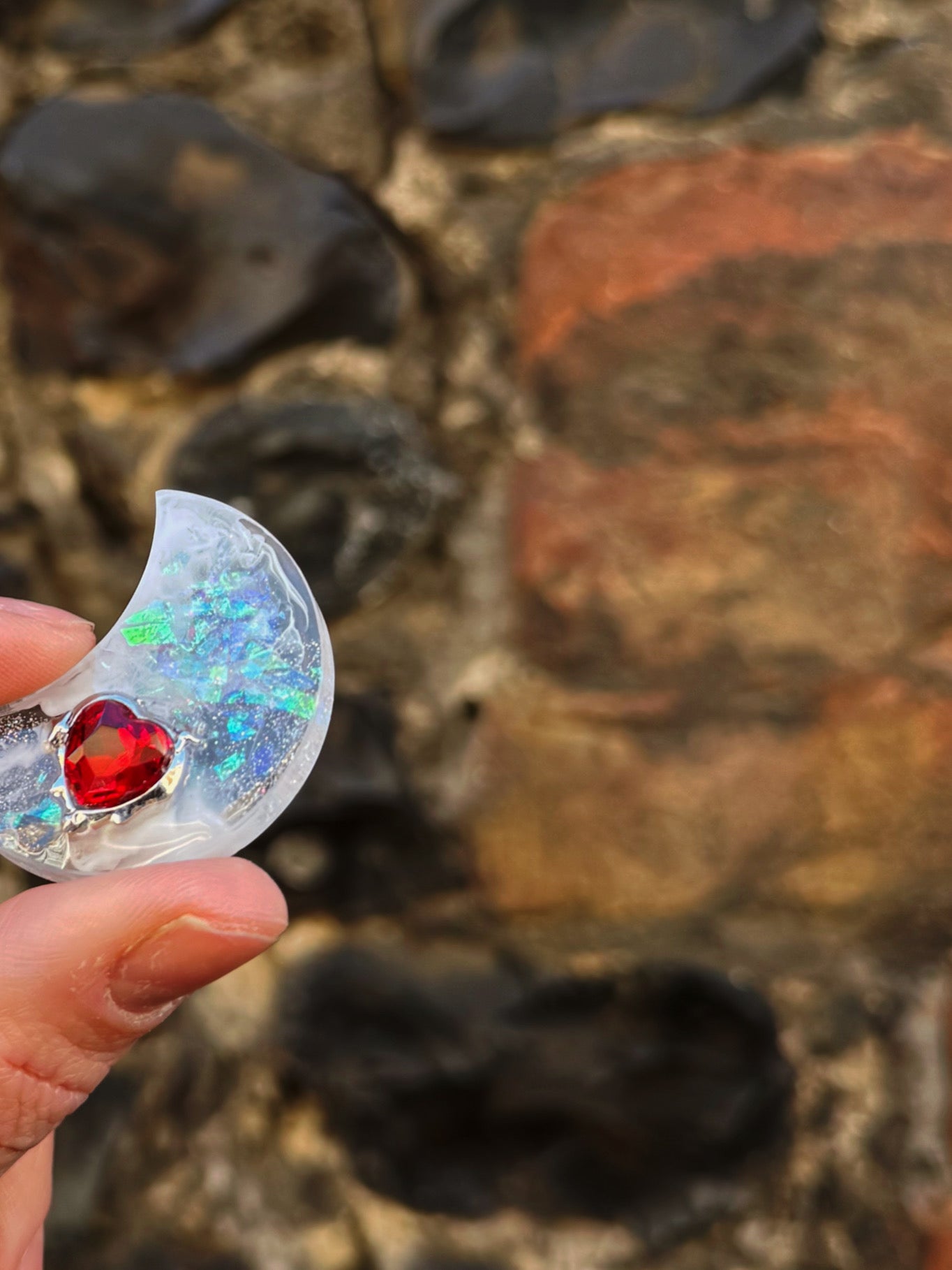 This worry moon is a transparent, faux silver leaf, holographic silver glitter and white marbled base, on top is a small red gem heart with a small silver frame that appears to be dripping downwards.