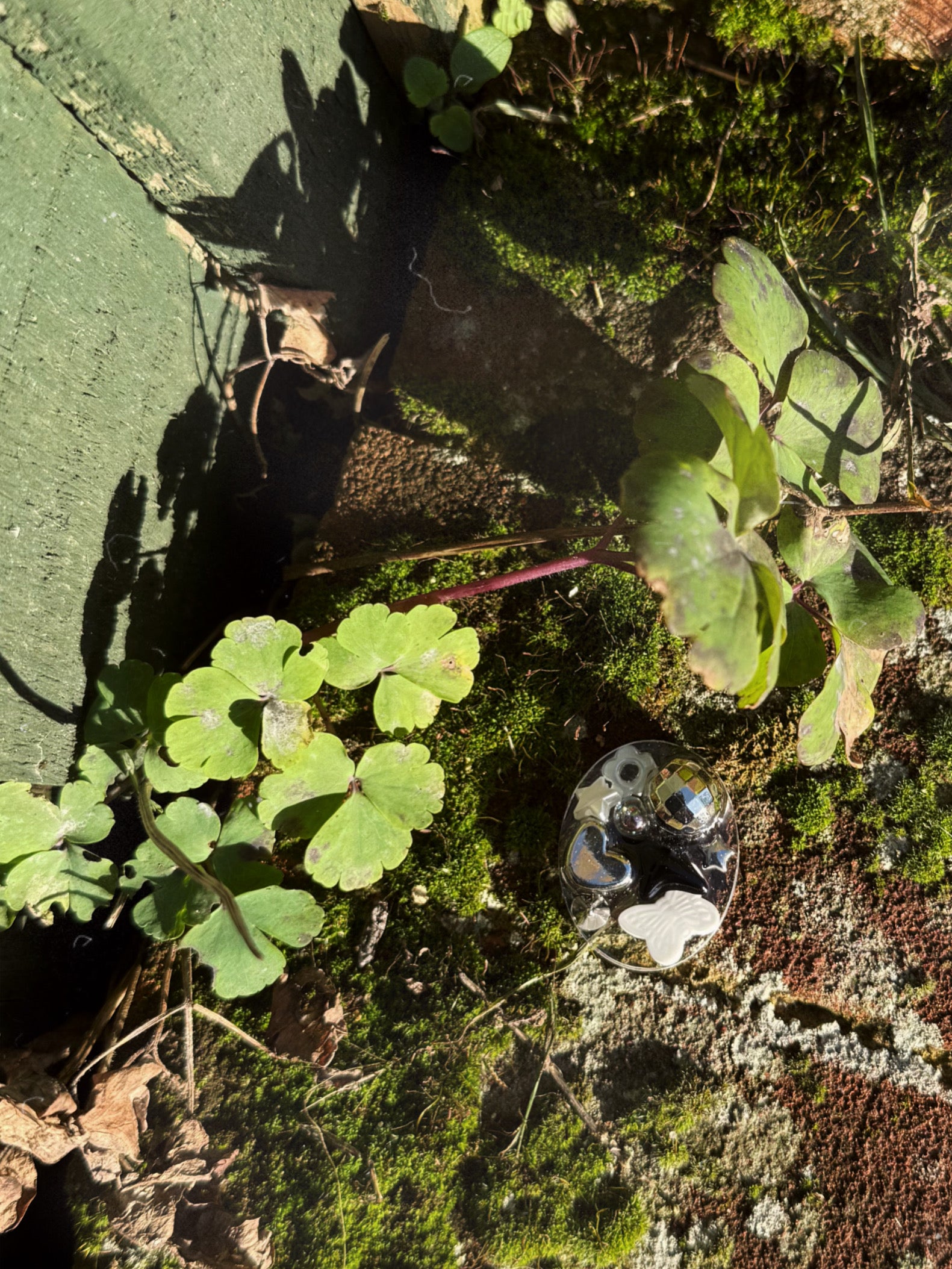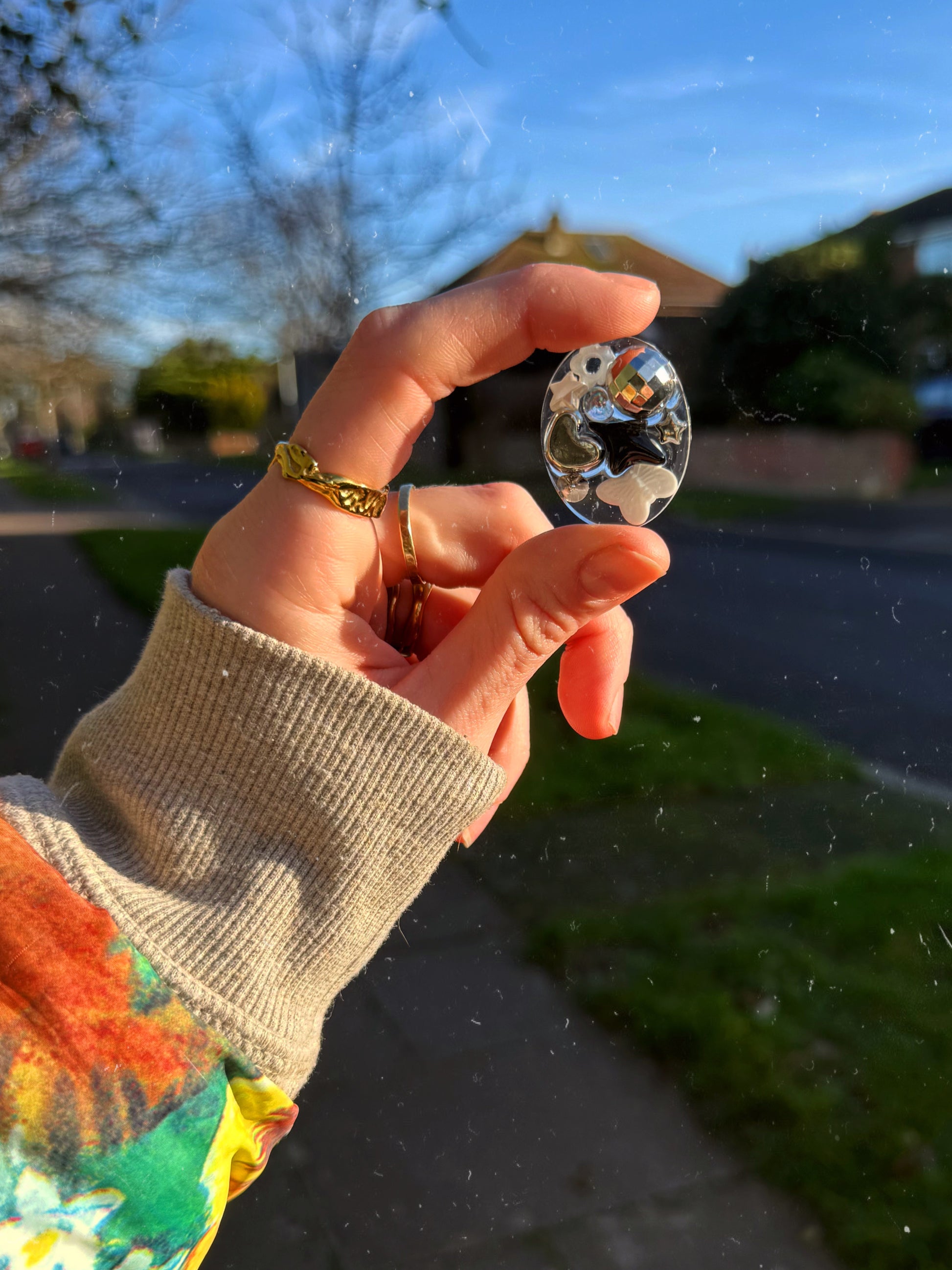 This tiny oval girl is the perfect addition to your pocket. This gorgeous oval is a transparent base with black and white treasure on top and silver disco ball to one side.