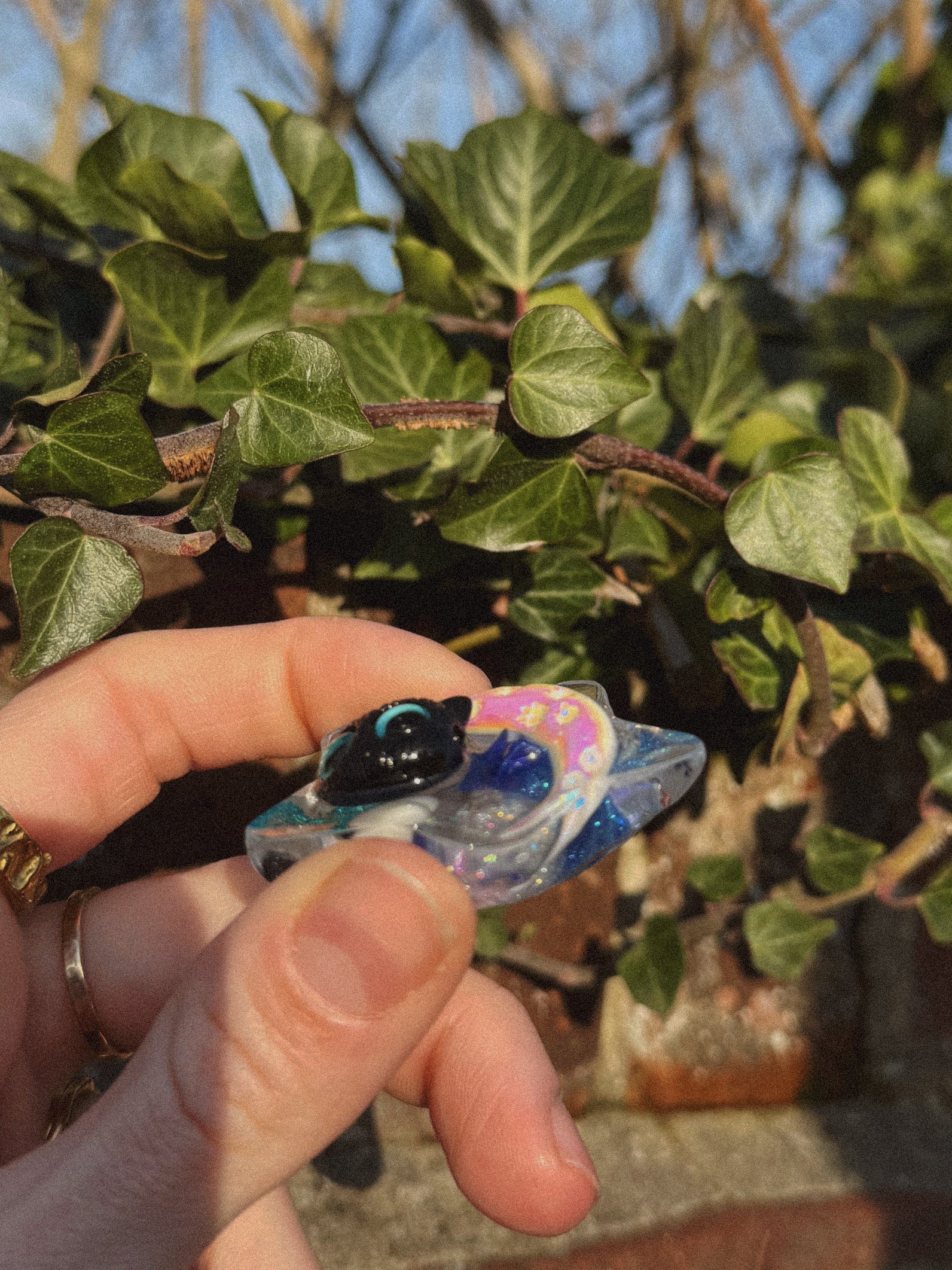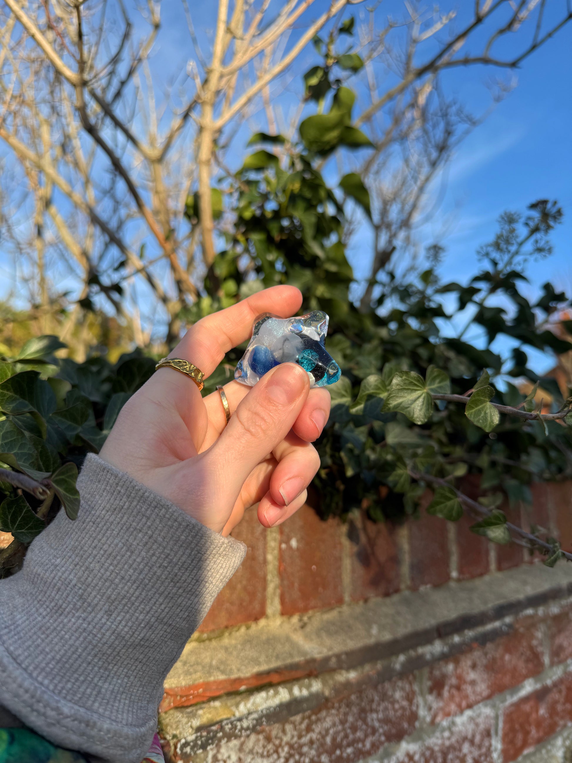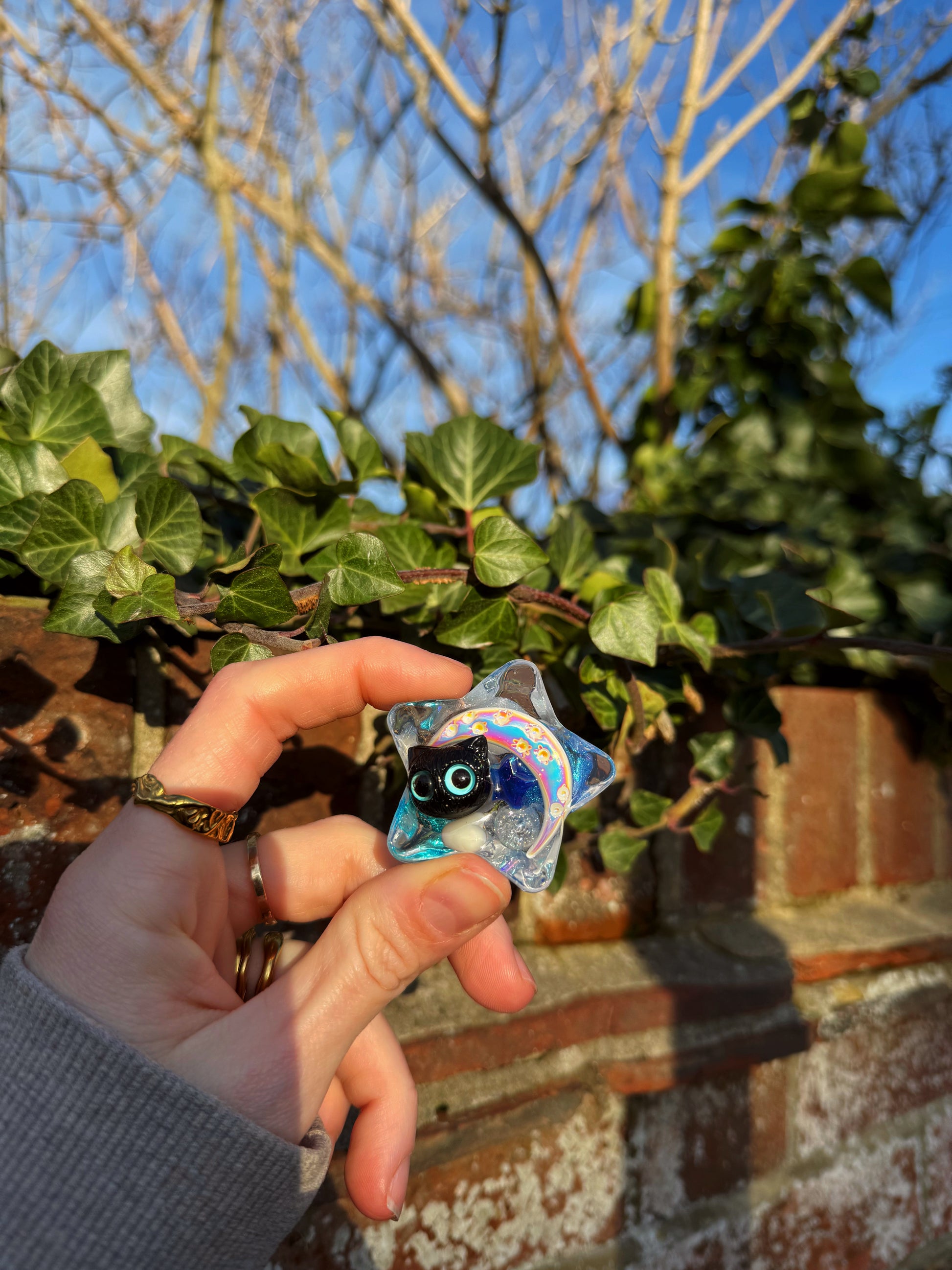 This transparent water star is full of blue and white themed treasure inside and has a pearlescent crescent moon on top with a black magic cats head leant to one side.