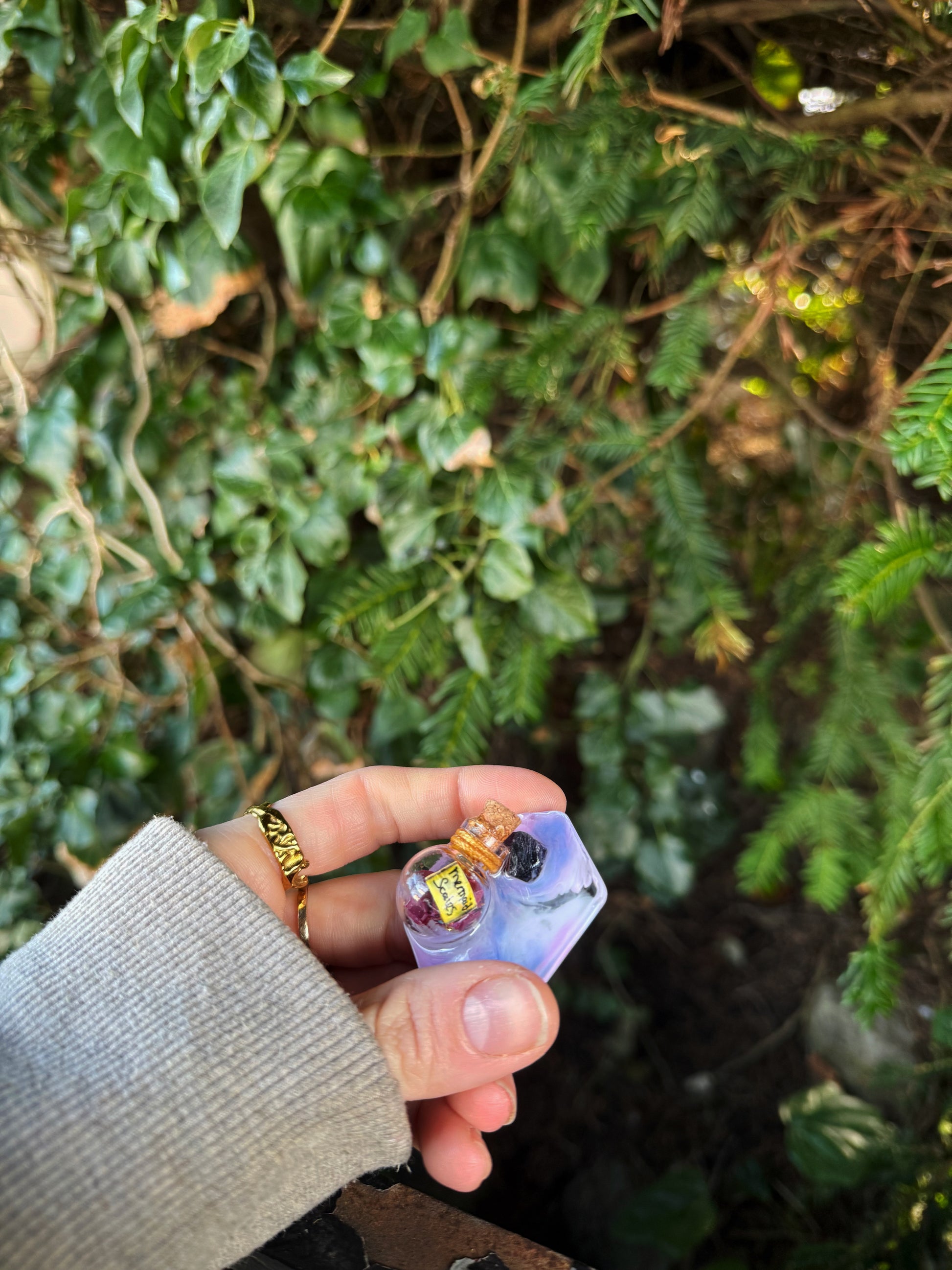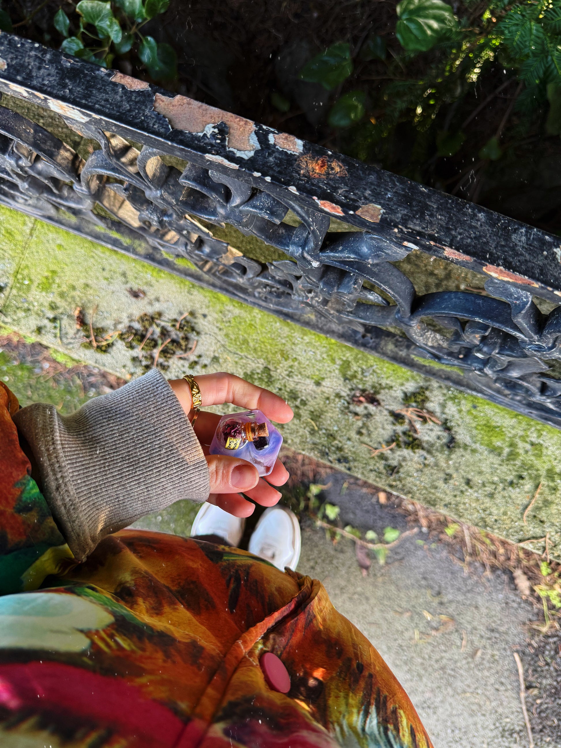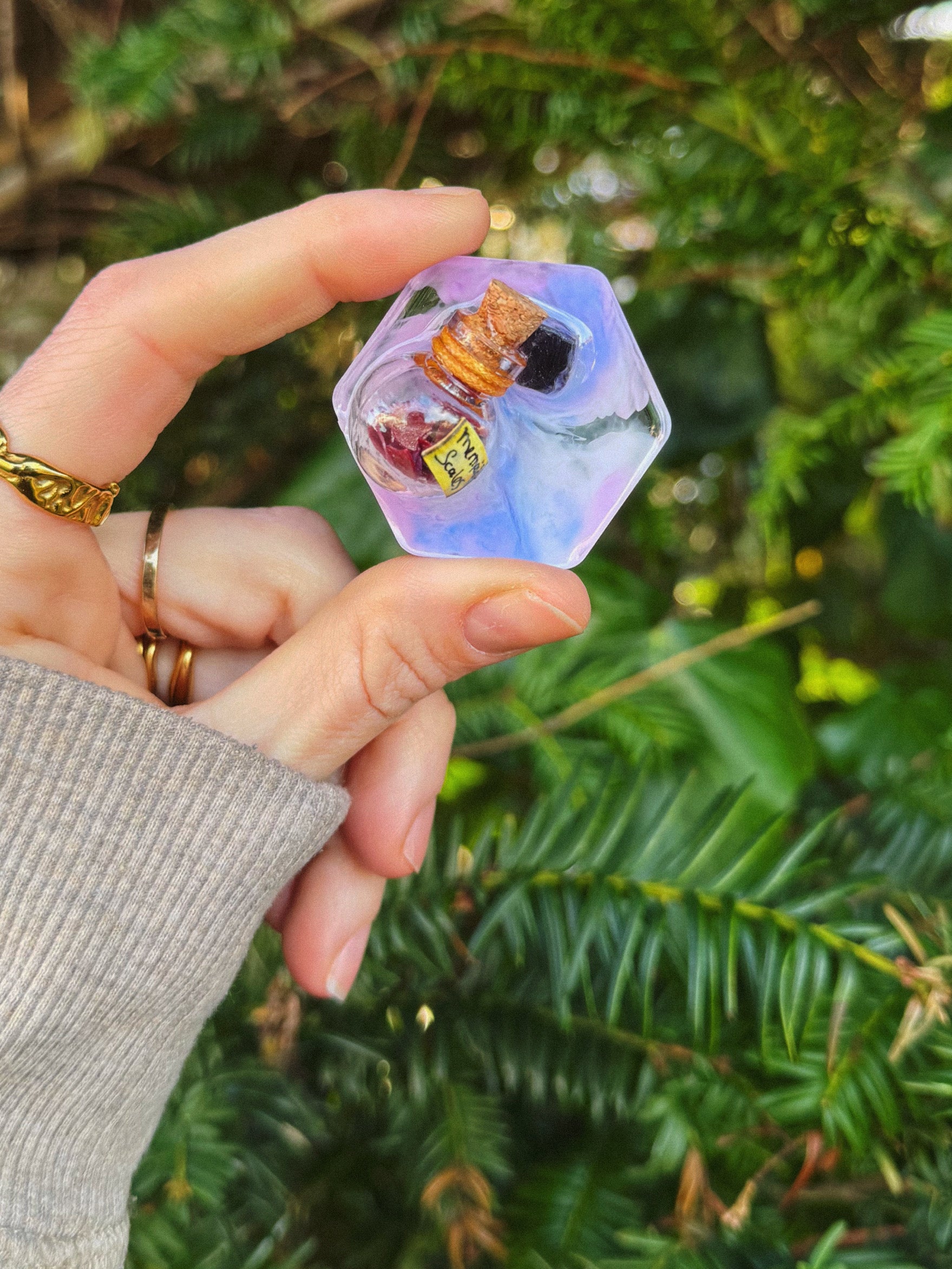 This is our second largest small hexagon, i know, jaz be clearer. Out of all our new pocket hexagons she’s quite big but she still fits in the palm of your hand. This lilac marbled base has a small glass bottle on top with hand made mermaid scales inside.