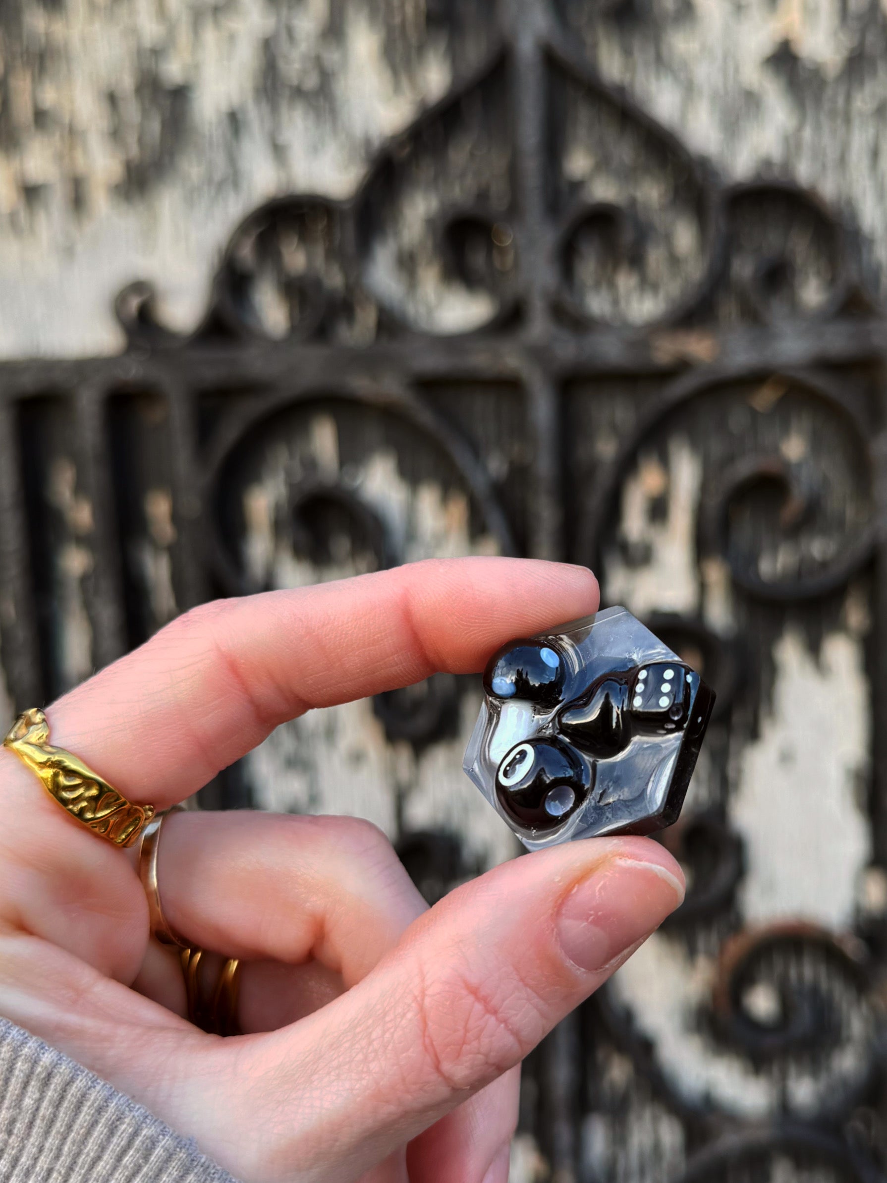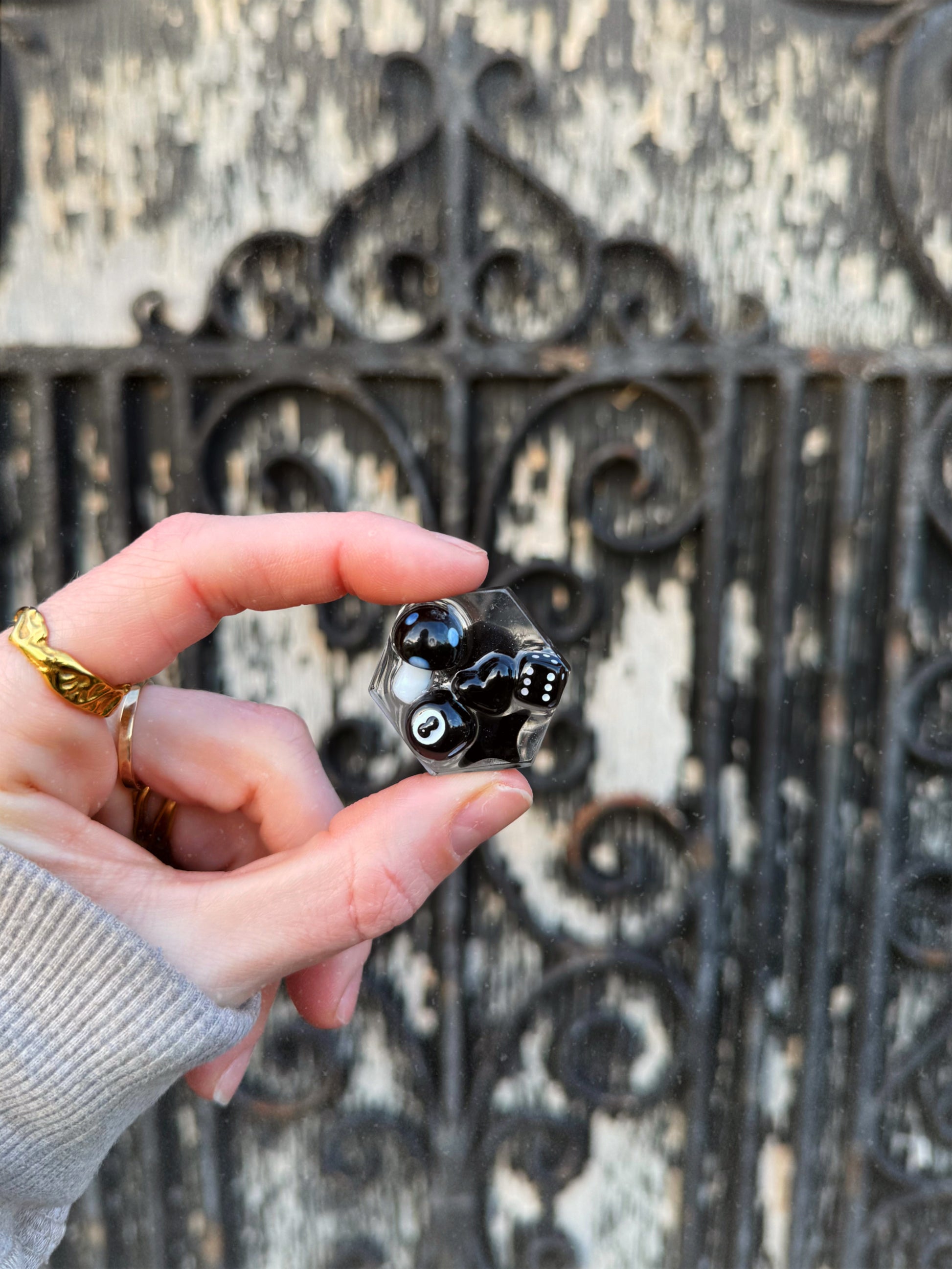 One of our mini hexagon shapes she’s most similar to our micro orb, this transparent base has a mix of black and white treasure on top.
