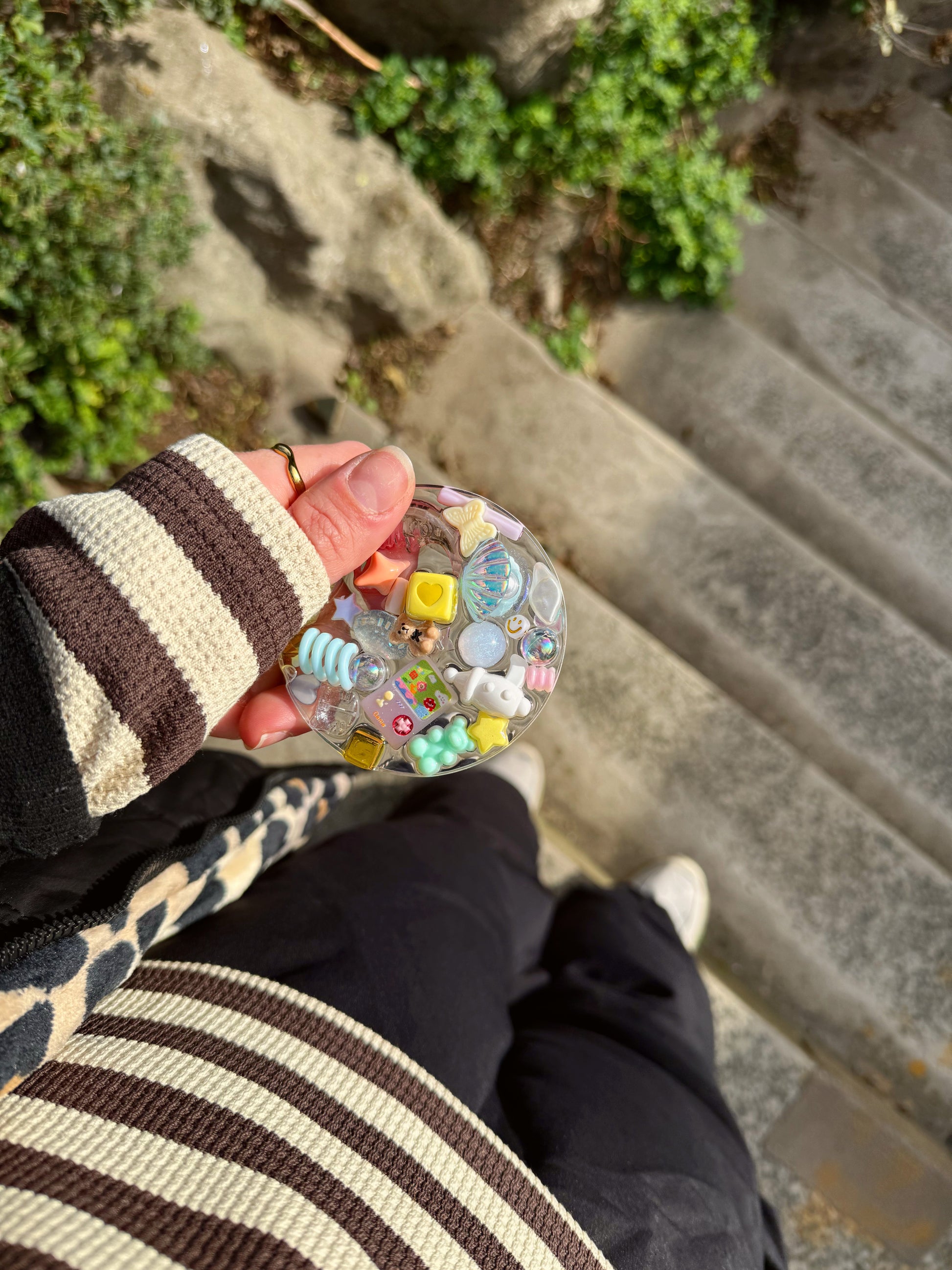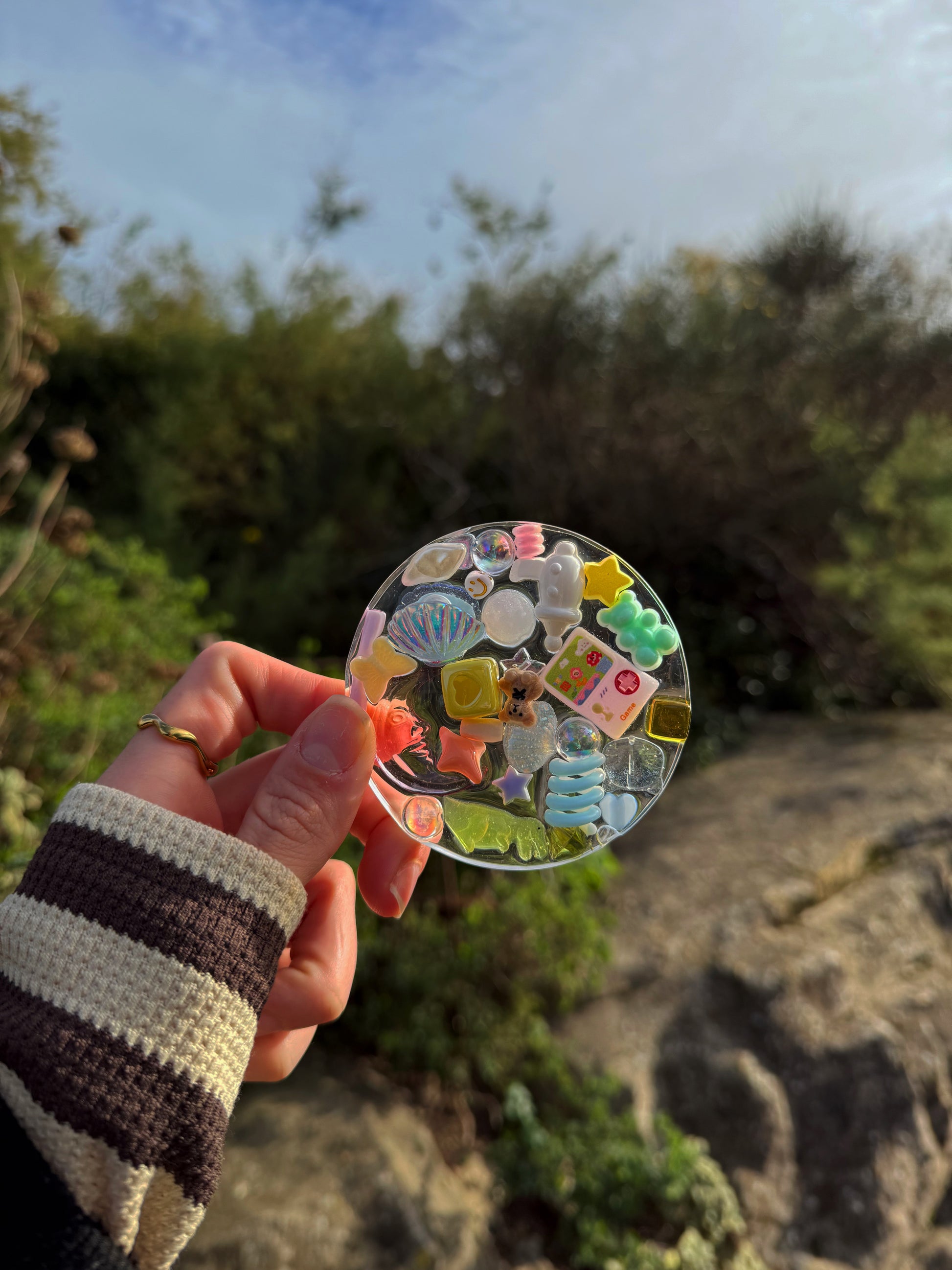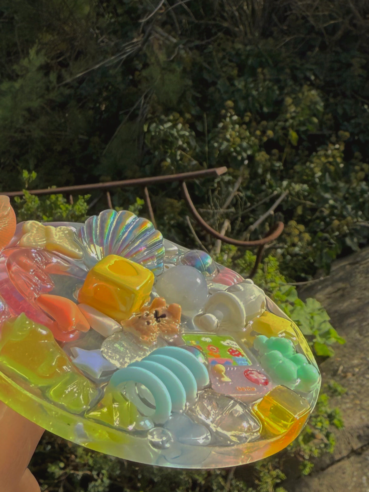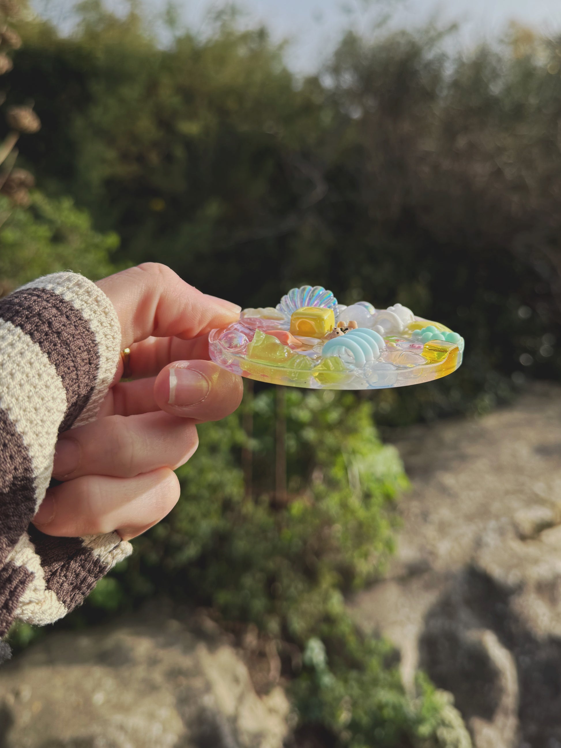This circle tinker is a chunky base full of pastel rainbow themed treasure on top, this circle tinker has a scattered design where me hero the negative space between the pieces.