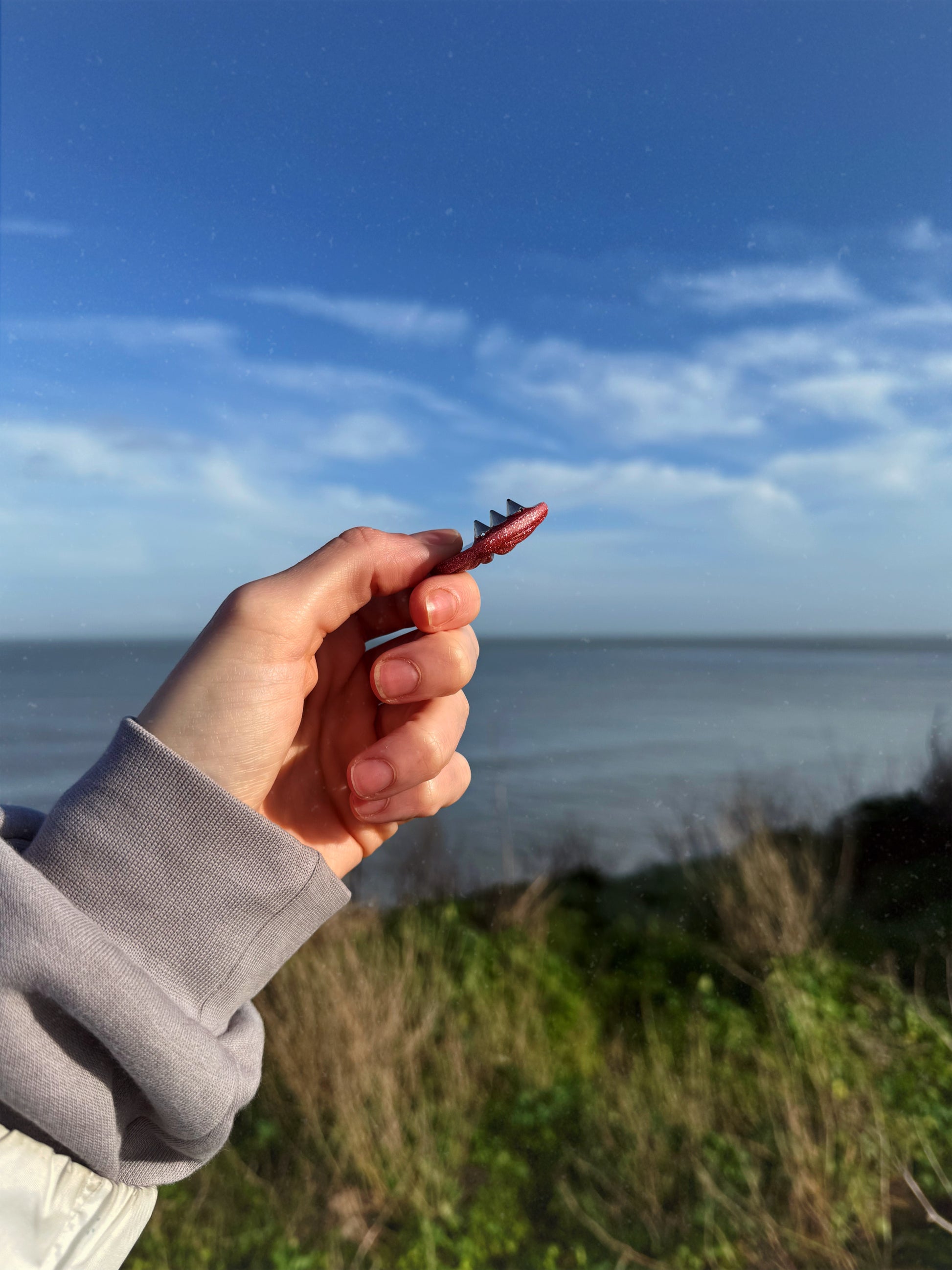 Our pocket shell is one of our tiniest Fidgets measuring in at just under 4 cm at the widest part, on the front, she has large ridges in the shape of a scallop shell, they provide a bumpy yet smooth texture, on the back this shell has three individual safe spikes attached (Actually made of a rounded edged metal) giving you a firm and prominent texture under your fingertips and against your skin.