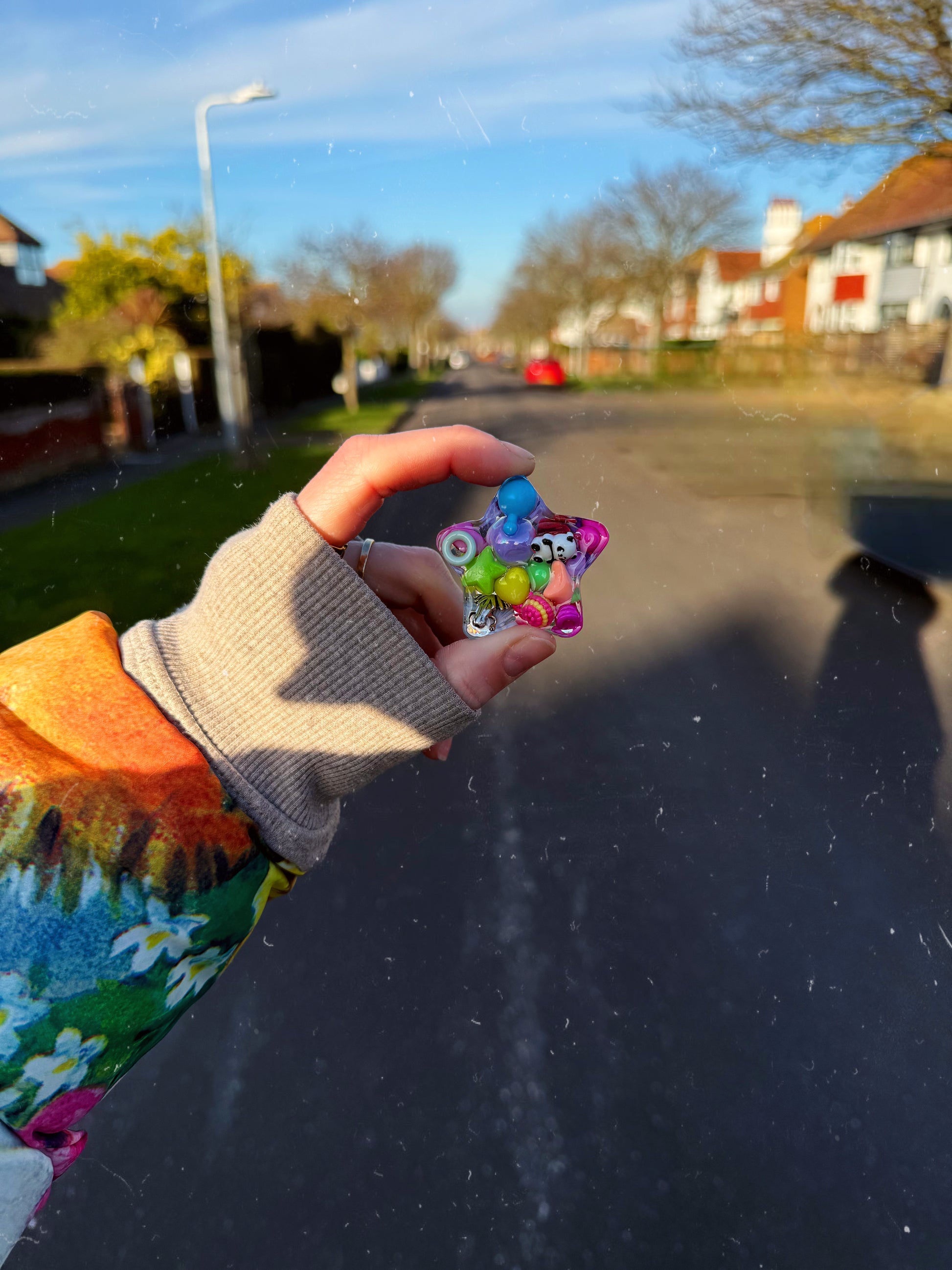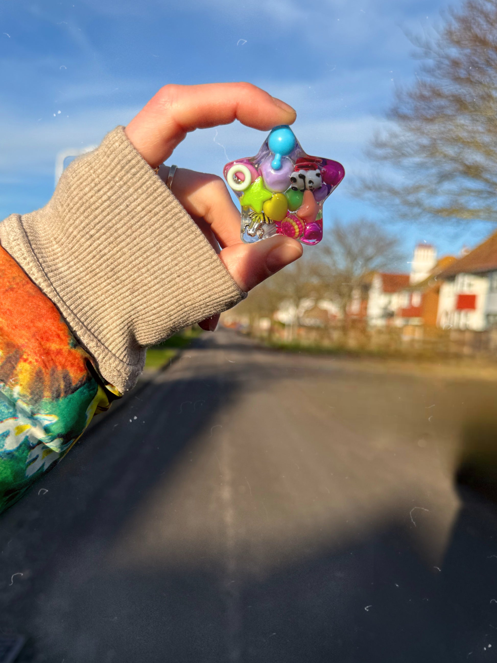 This transparent water star is full of random rainbow pieces inside with our classic jazshouse texture on the back. This batch has a panda on the outside edge.