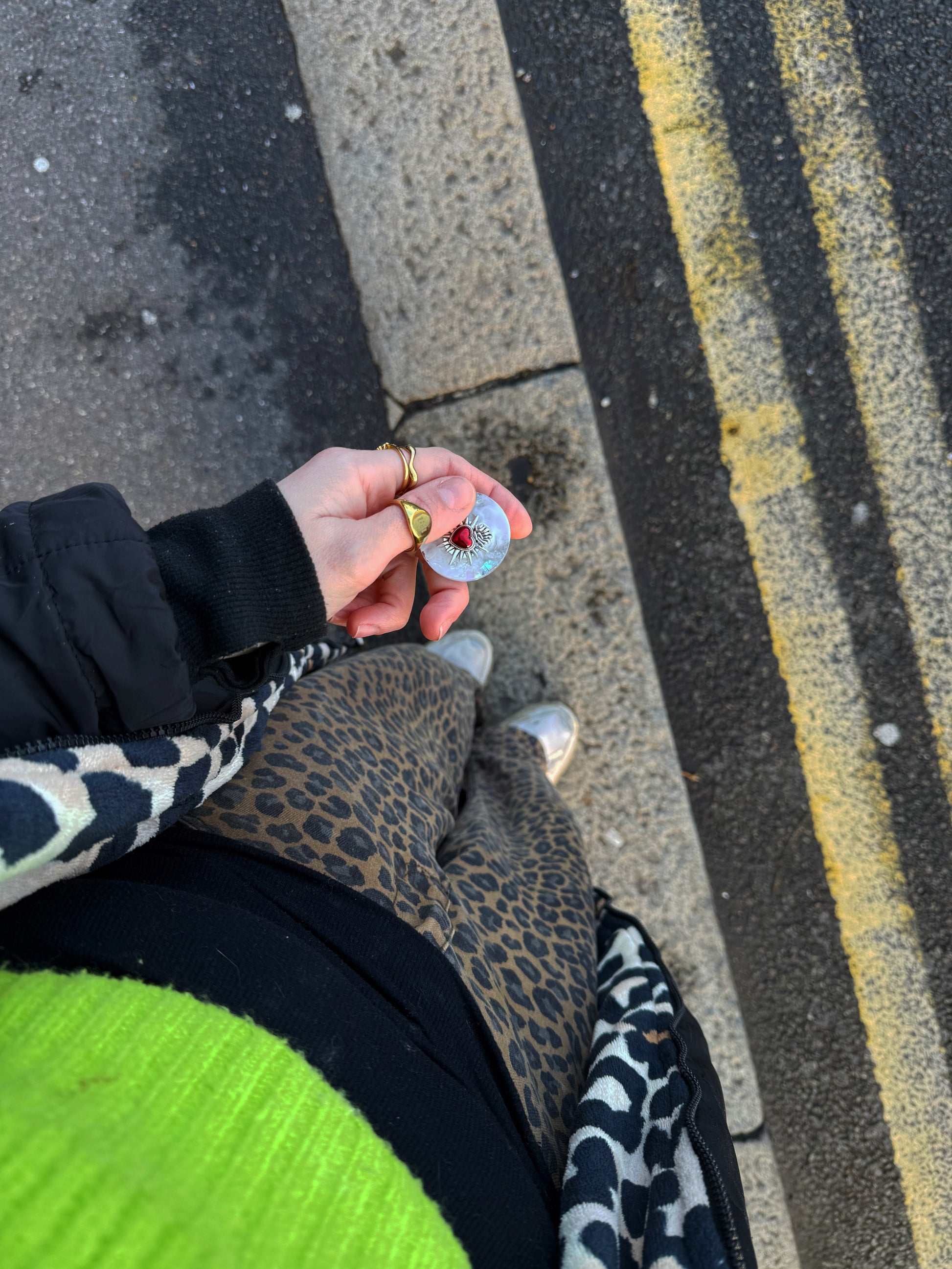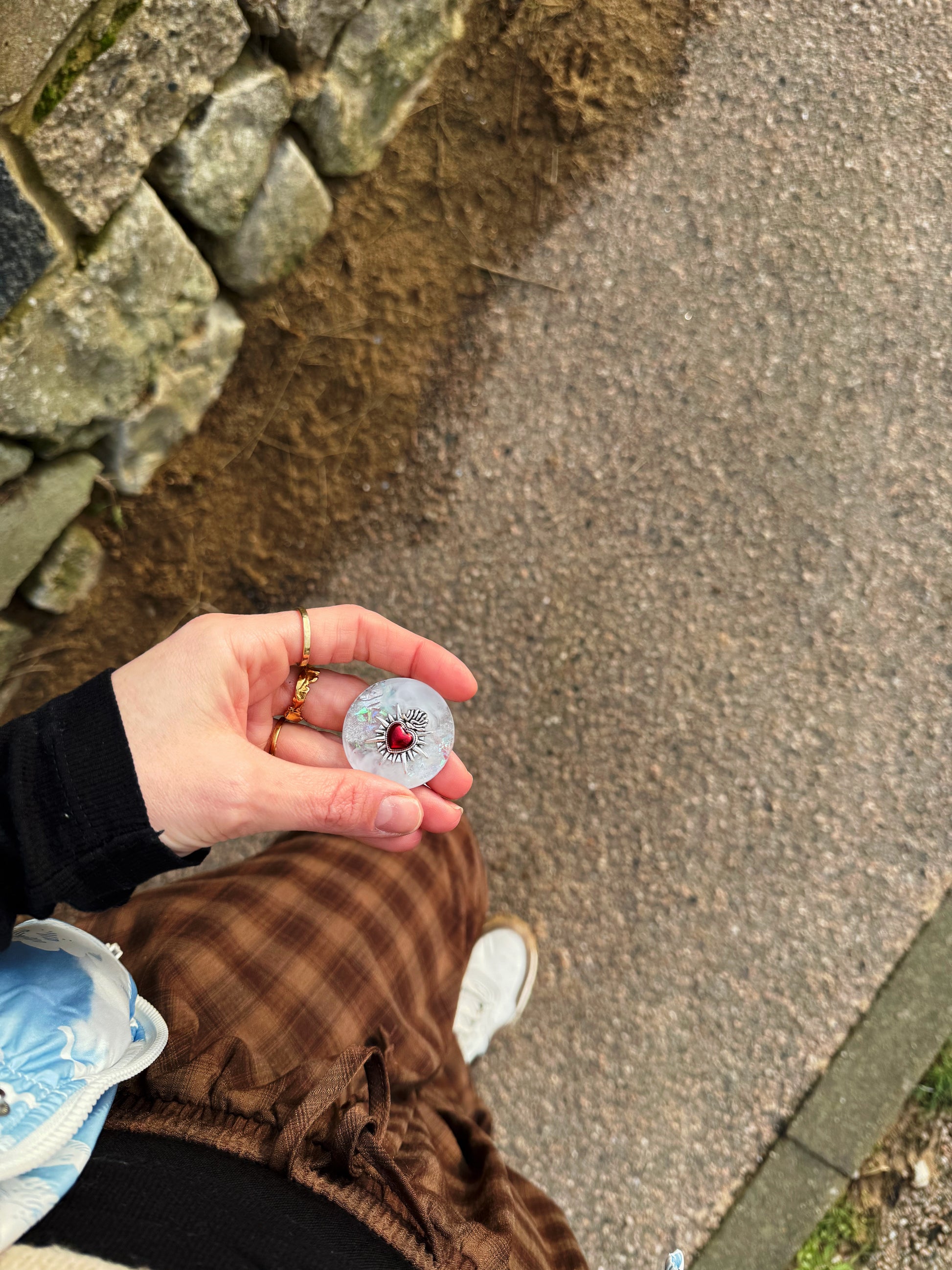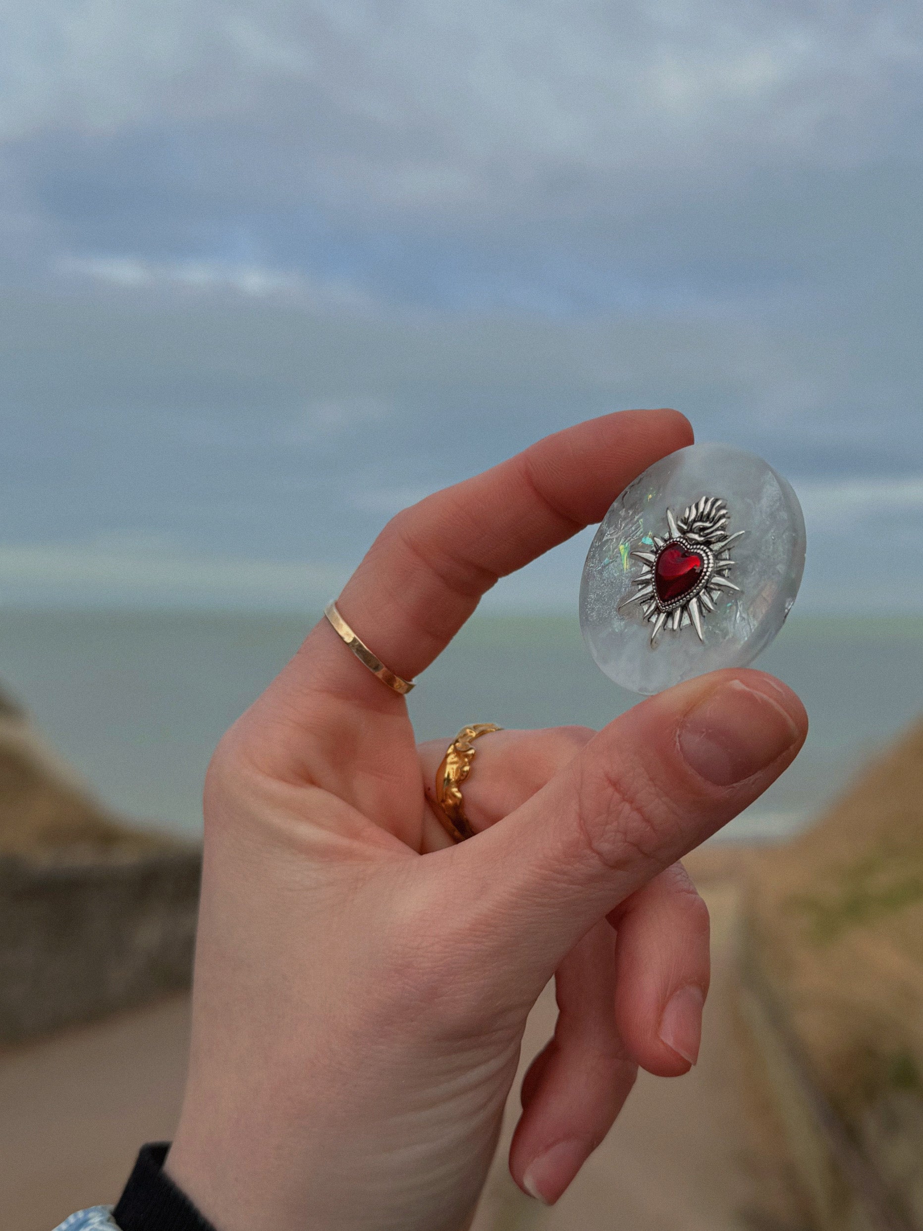 This holographic orb has a faux silver leaf base (a really intense silver colour) with silver holographic glitter, silver colour and white marbled ontop. On top of that is a red sacred heart with a silver frame around the outside, heroing the smooth space around it.