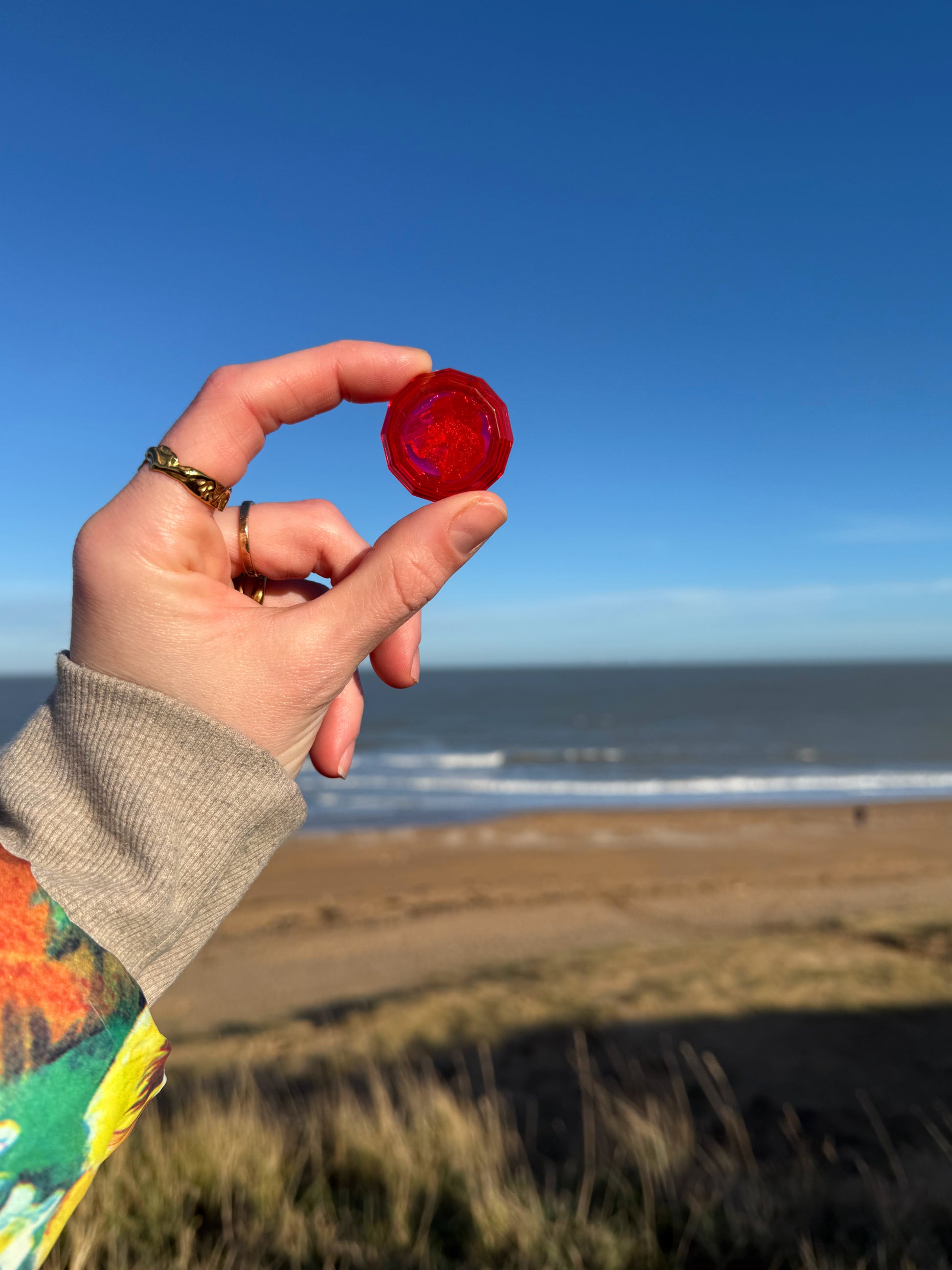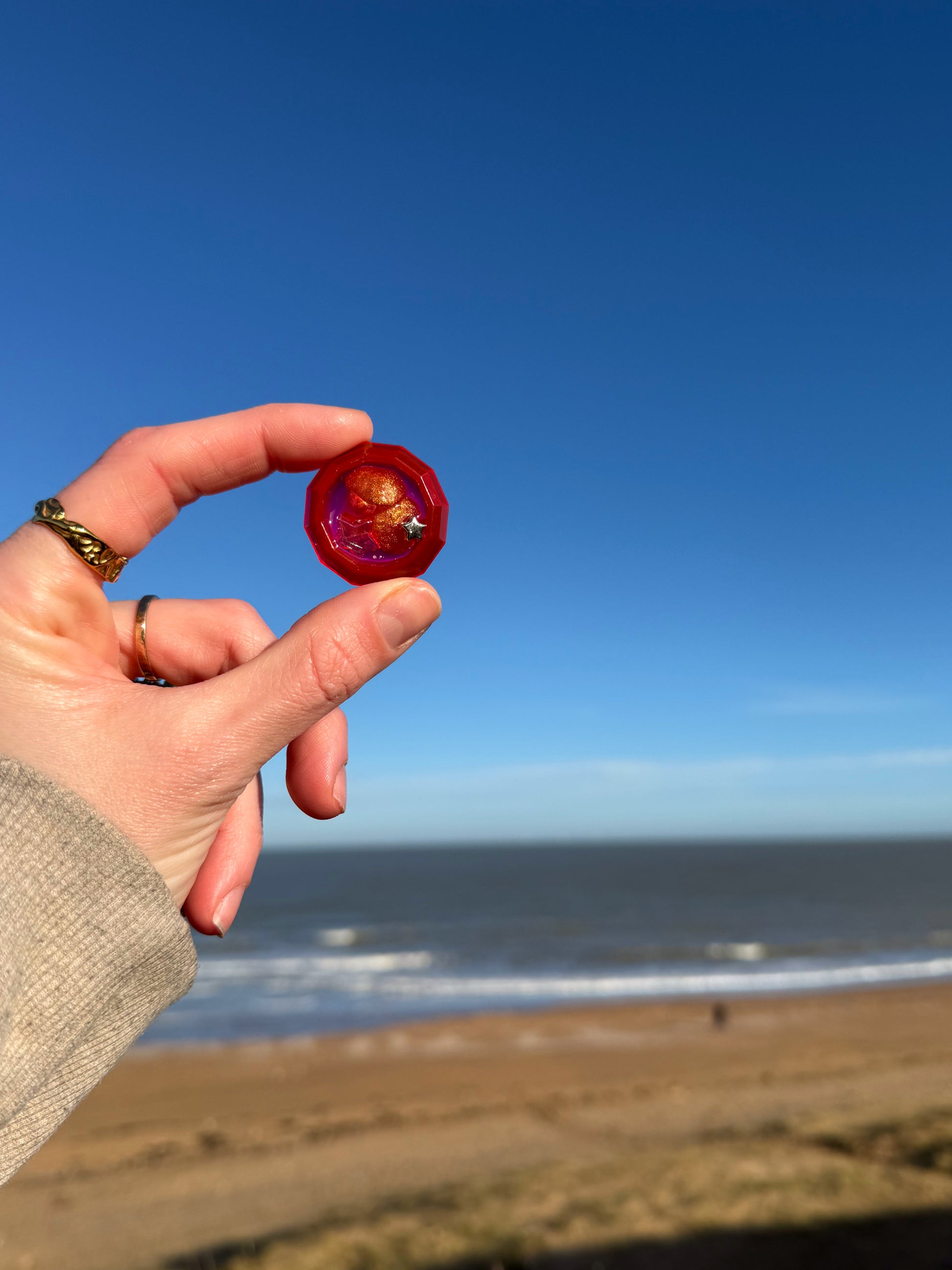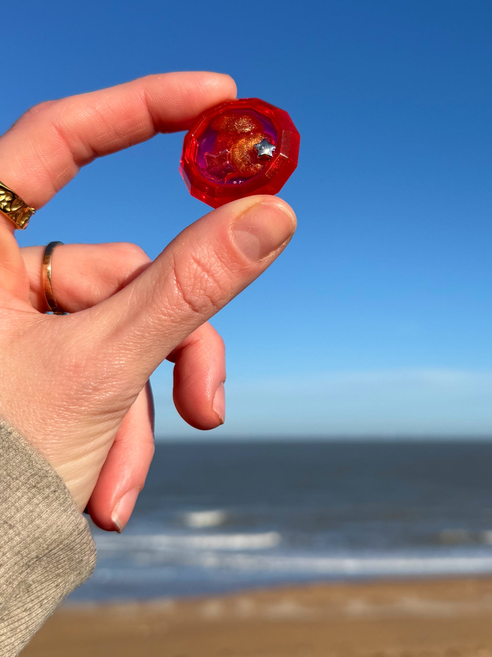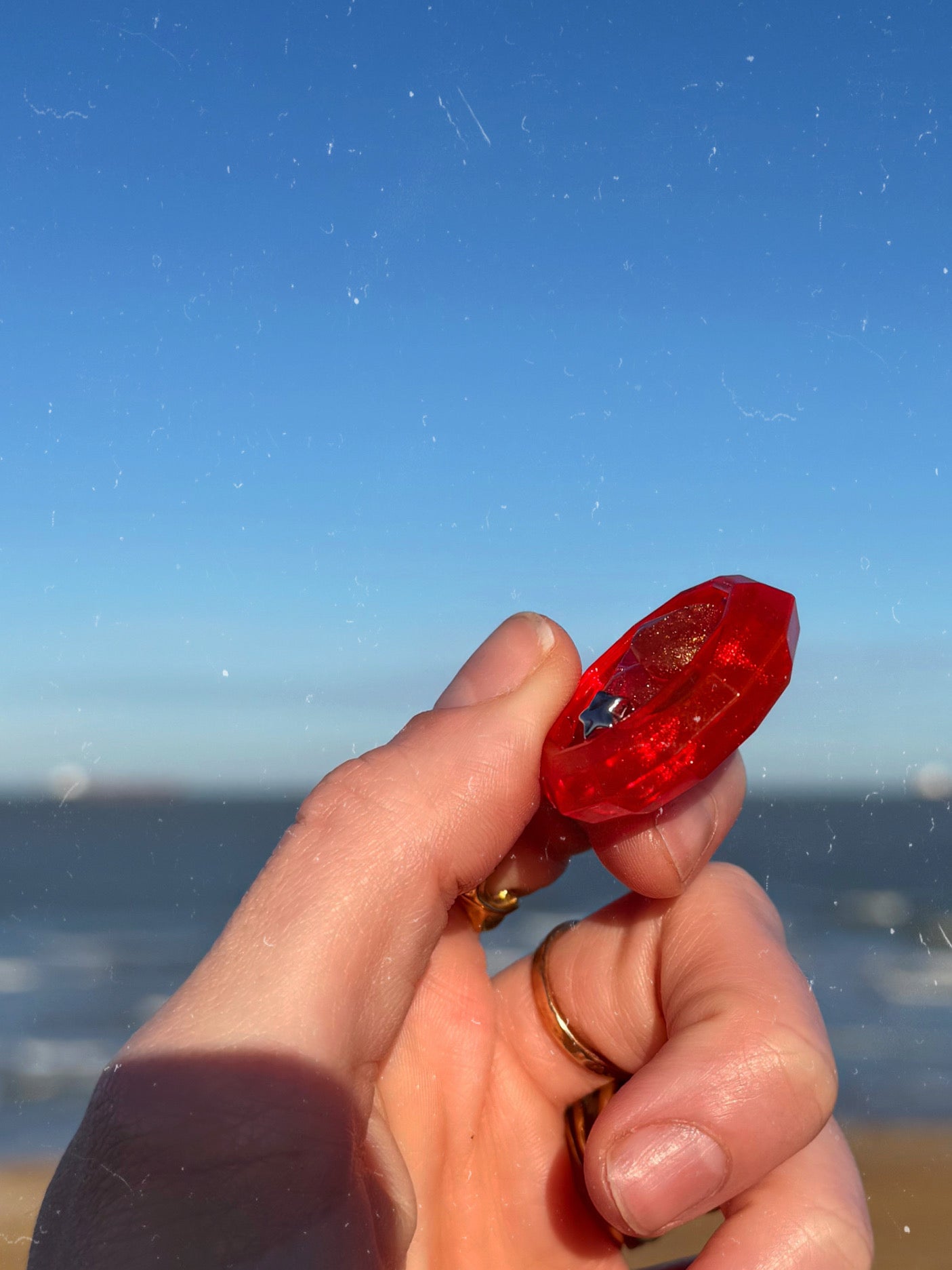 This limited edition giant red gem has mini gems inside, and a shiny star with a micro silver star on top.