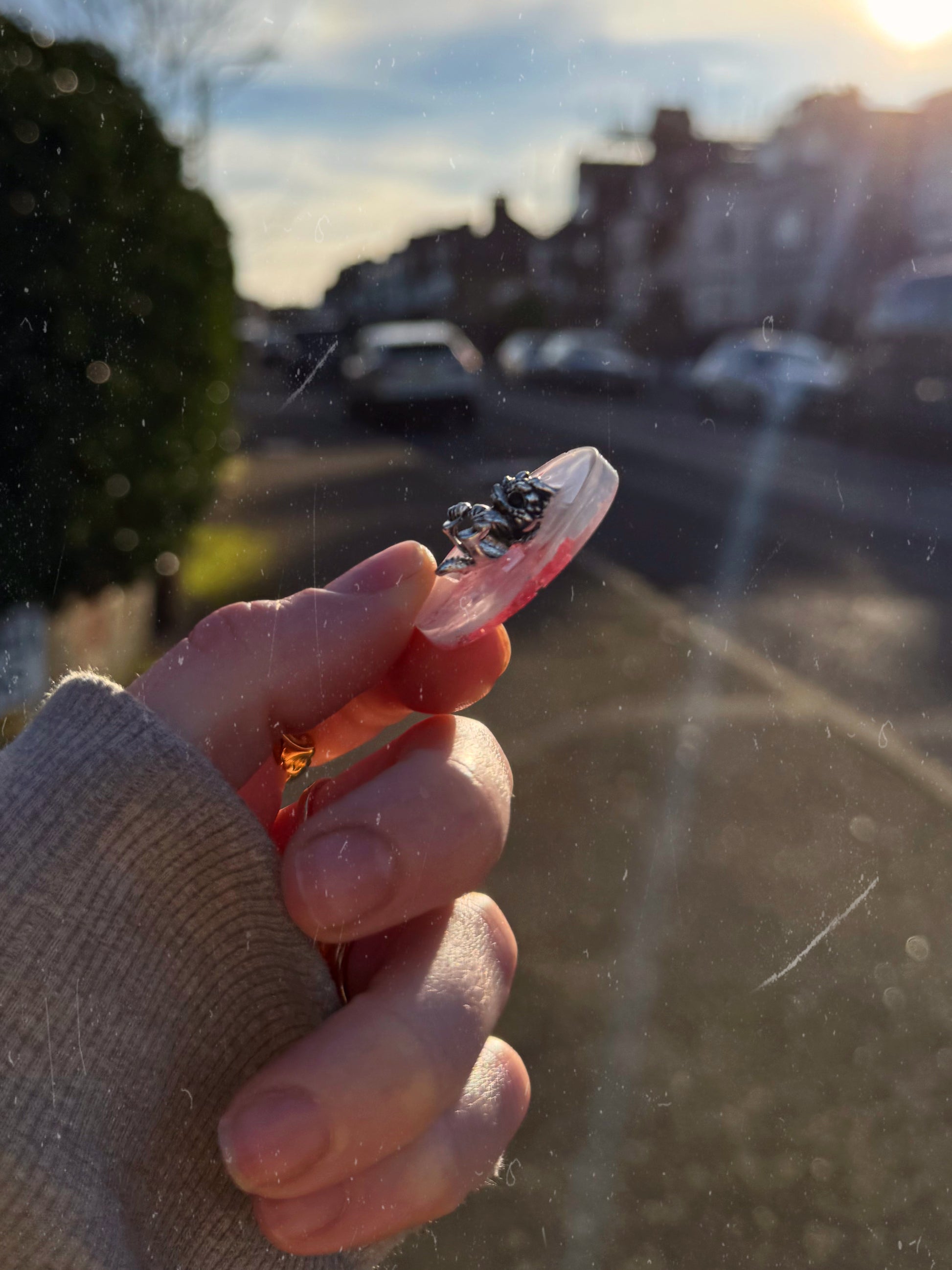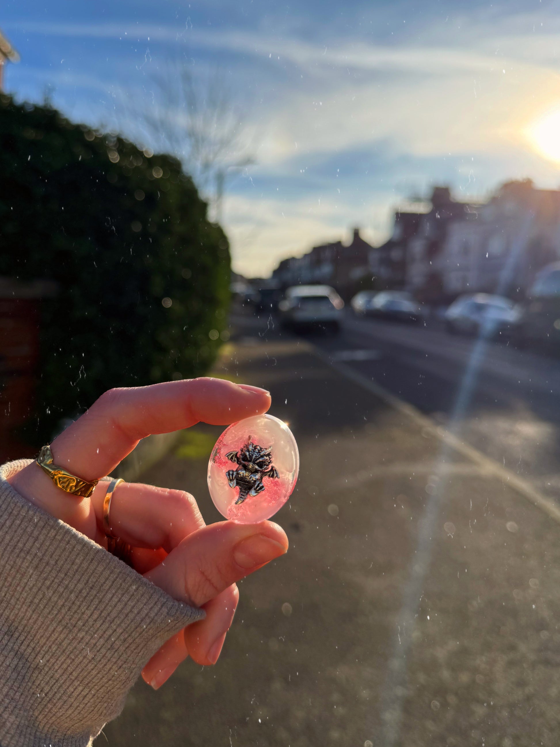 This tiny oval girl is the perfect addition to your pocket. This one has a pink glitter and white marbled base, ontop is a baby dragon on his back, his tummy has a space that we have left, not only does it give you an inverted texture to rub your thumb over, but there’s space for her to protect whatever you want your mind to put in there that day. A little manifesting space for you heart.