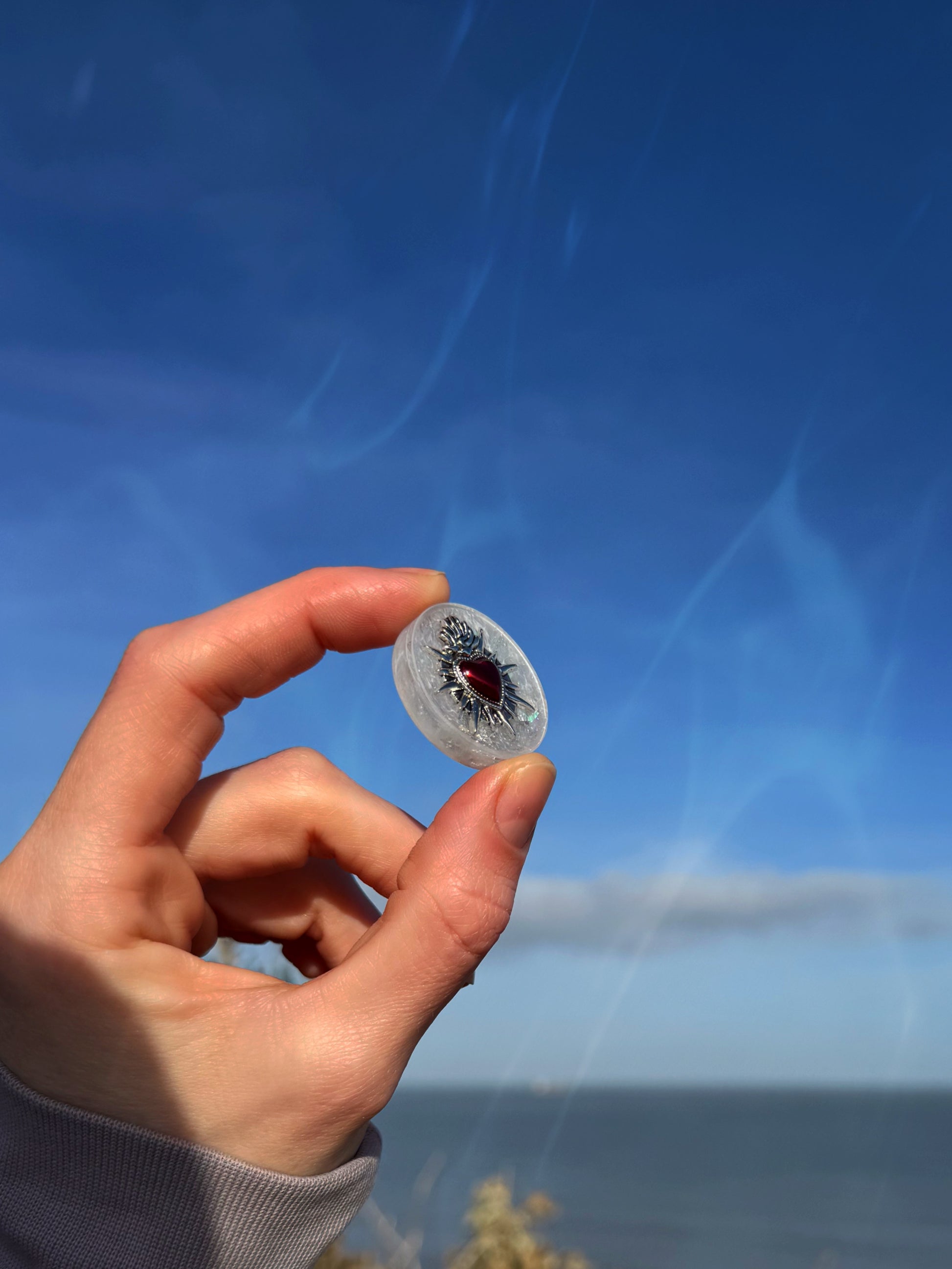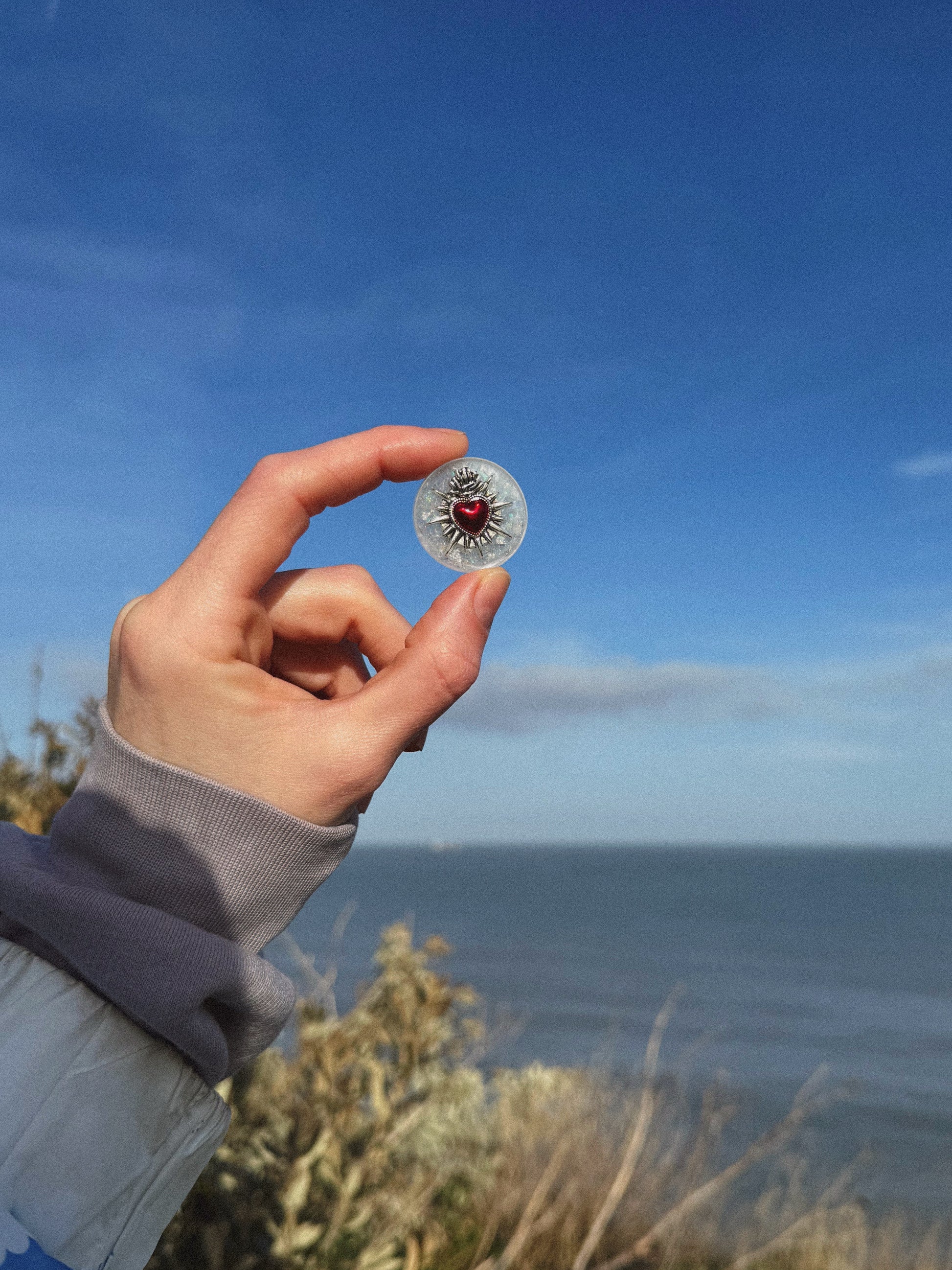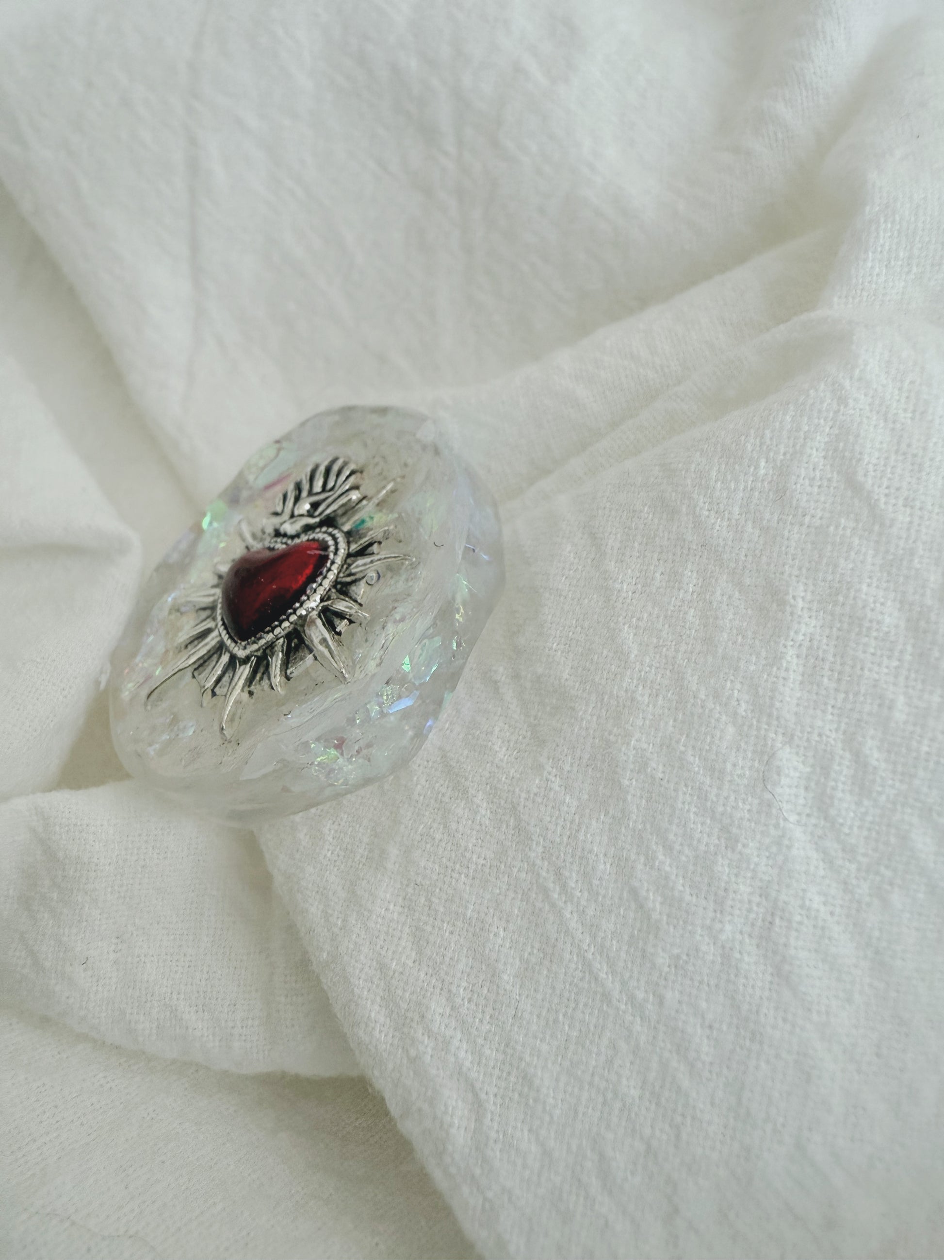 STOP: this wave is scratchy, on purpose scratchy. The edges are scratchy and there is no smooth surface. The classic wave pattern on the bottom provides a softer texture and the red sacred heart and intense glitter provide a rougher texture on the top.