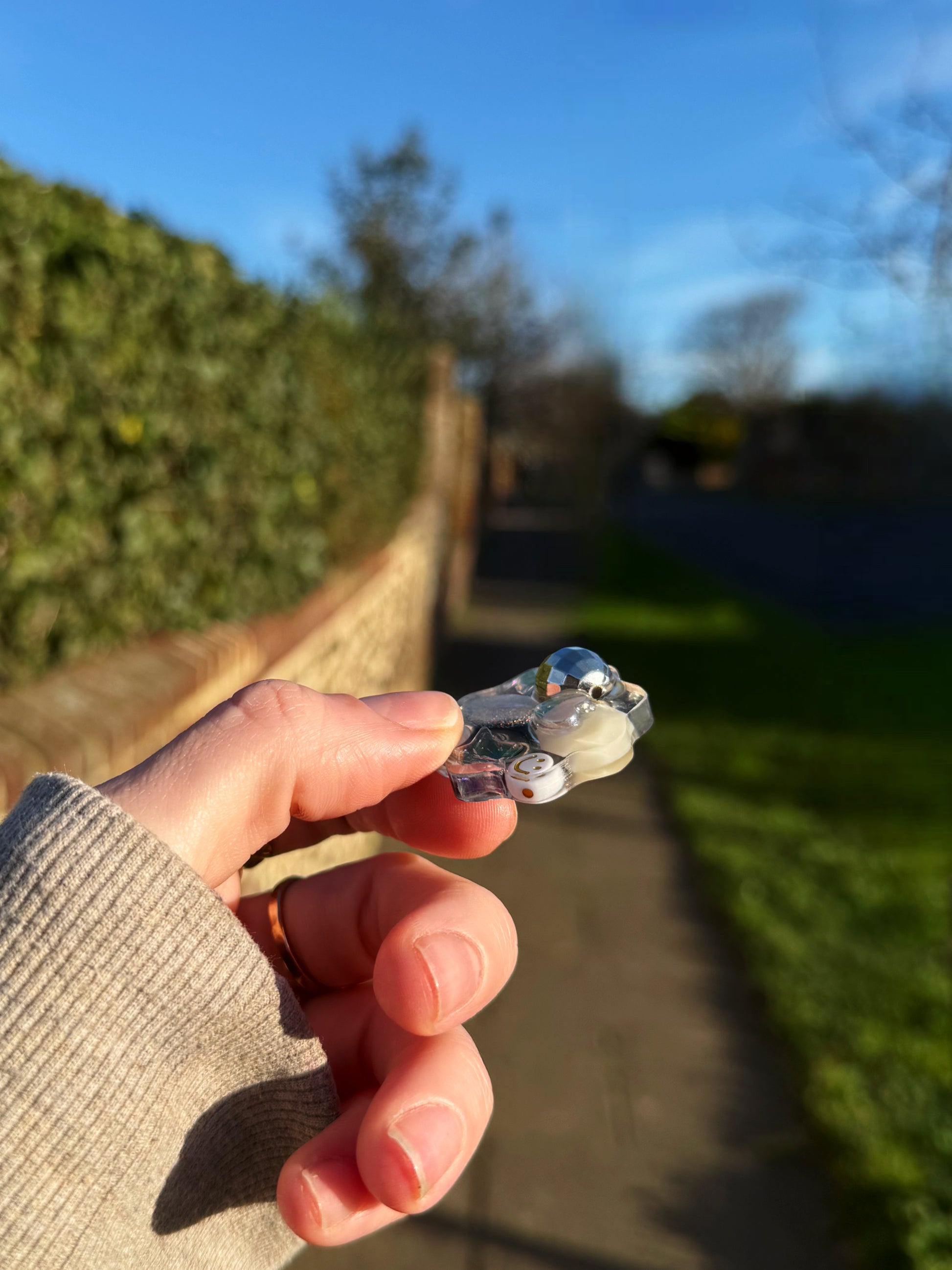 This little pocket piece is a transparent base with cream, white, silver and black treasure on top, the hero of this little item is a silver disco ball. This piece has been designed to reflect light at every angle, using silver, iridescent acrylic shapes, peaks of gold and reflective glass beads under the resin.