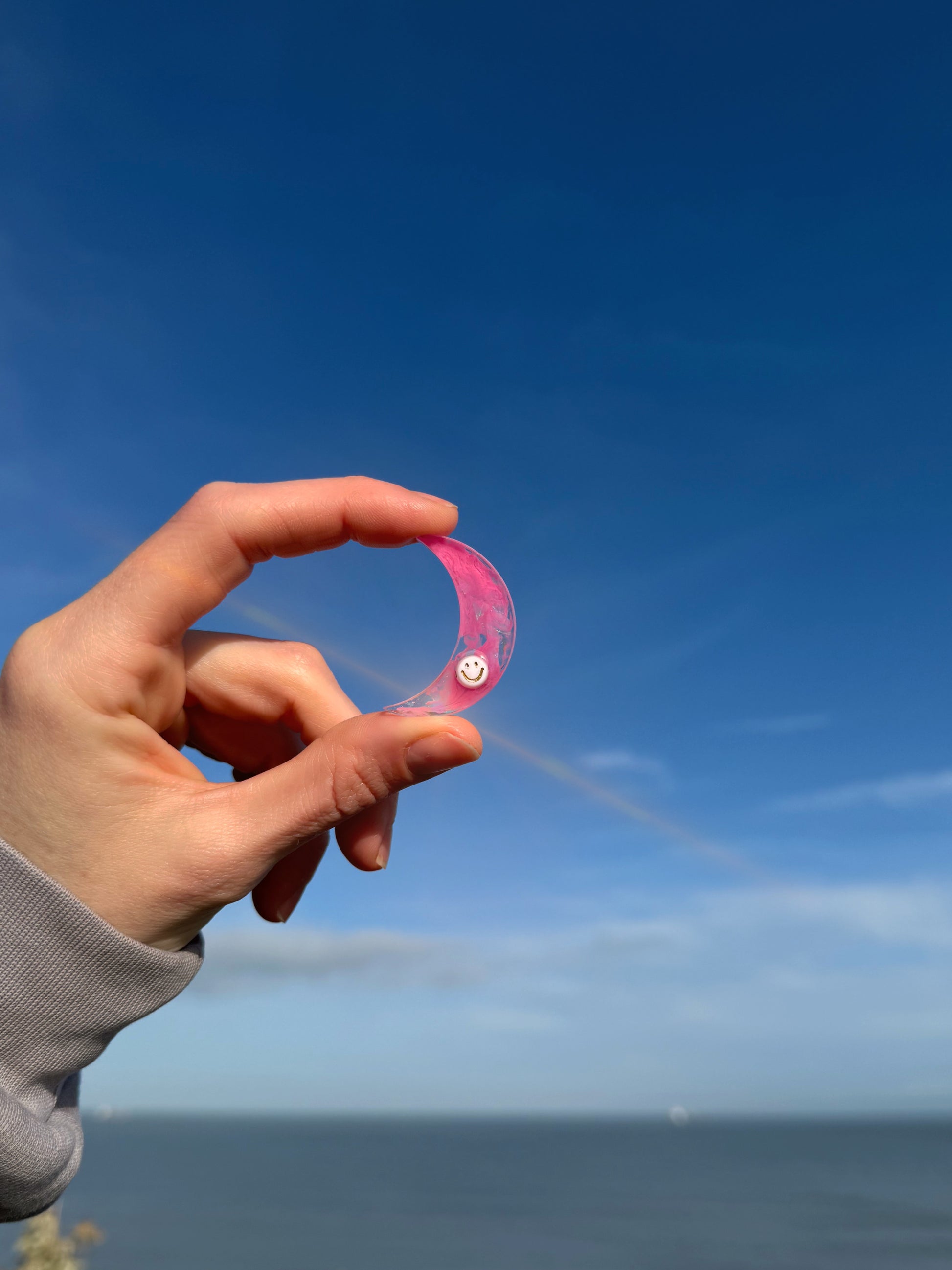 This gorgeous tiny worry moon has a pink clear and iridescent sparkle throughout, on top is a small white and gold smiley face, providing a small bump of texture in an otherwise smooth shape.