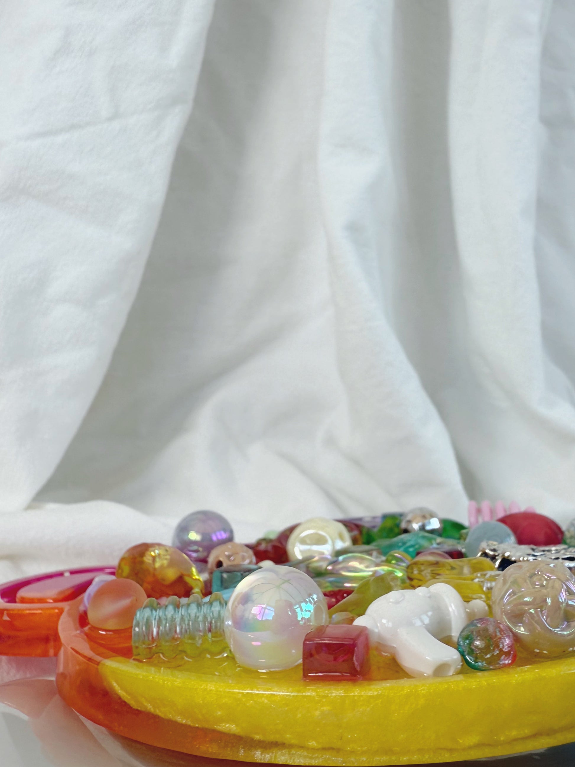 Our jazshouse bear mirrors are one of our biggest textured tools, a party piece for your shelf or unit, or a group tool this isn’t something that can be easily popped in a bag like our other items. With a coloured plate like base with a small rim around the outside keeping hundreds of different textured items ontop.