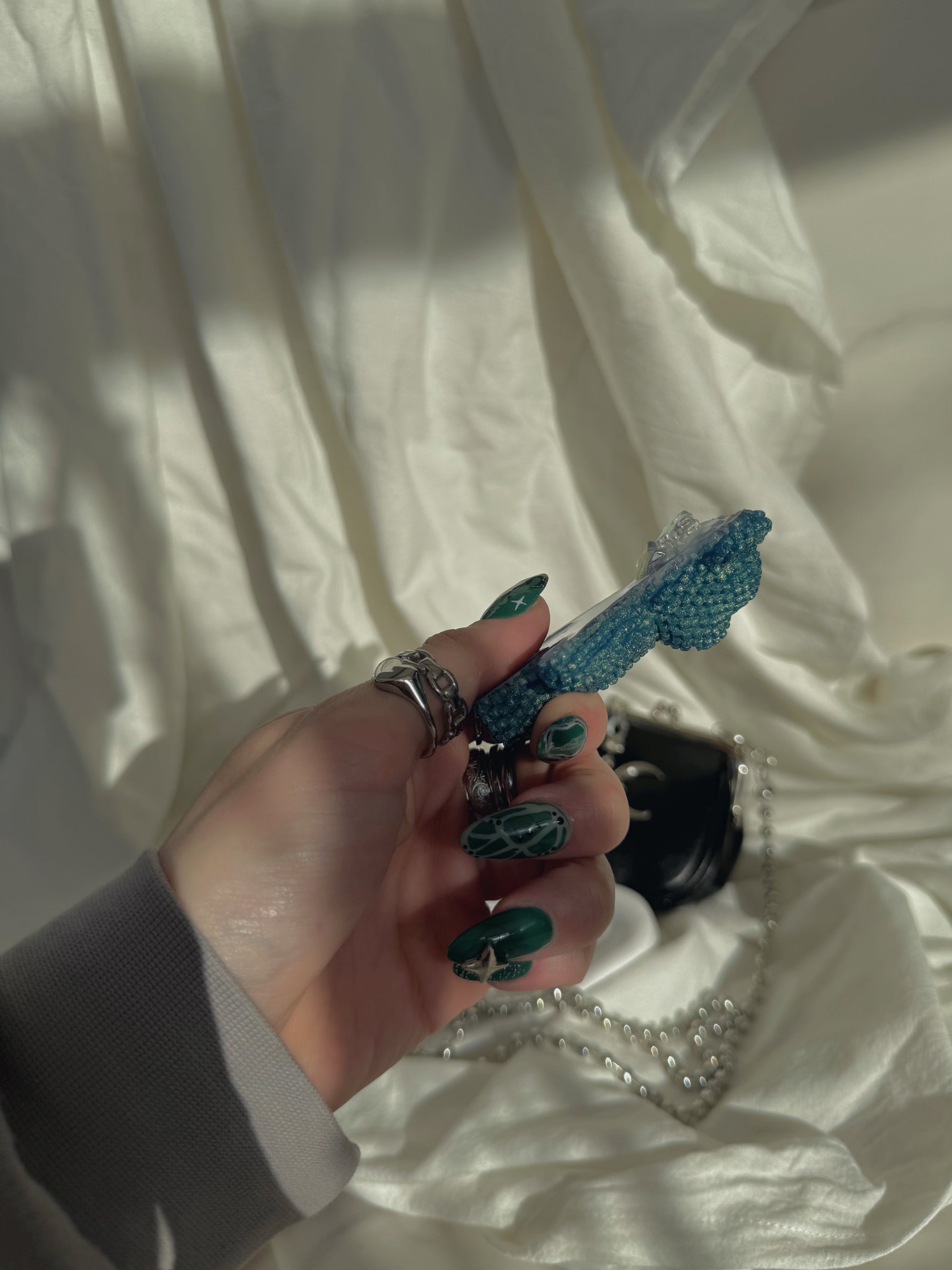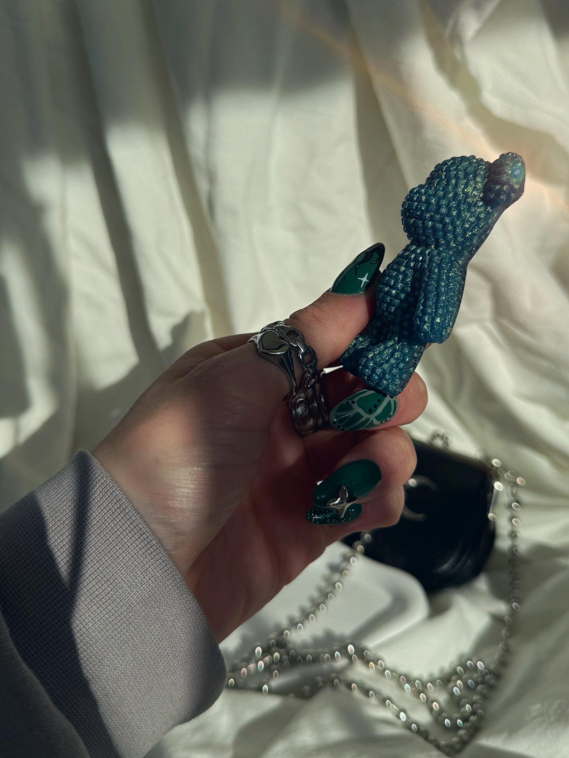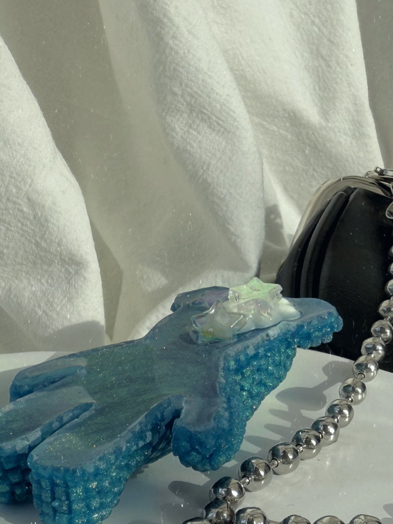 This double sided Jagger bear is a solid sparkle chameleon blue, its] shines slightly green in different lights, on the back there is a cloud and three irridecent stars, the stars are stacked on and around the cloud to give you a tiny corner of texture around the perfectly smooth back to give you the best of both worlds.
