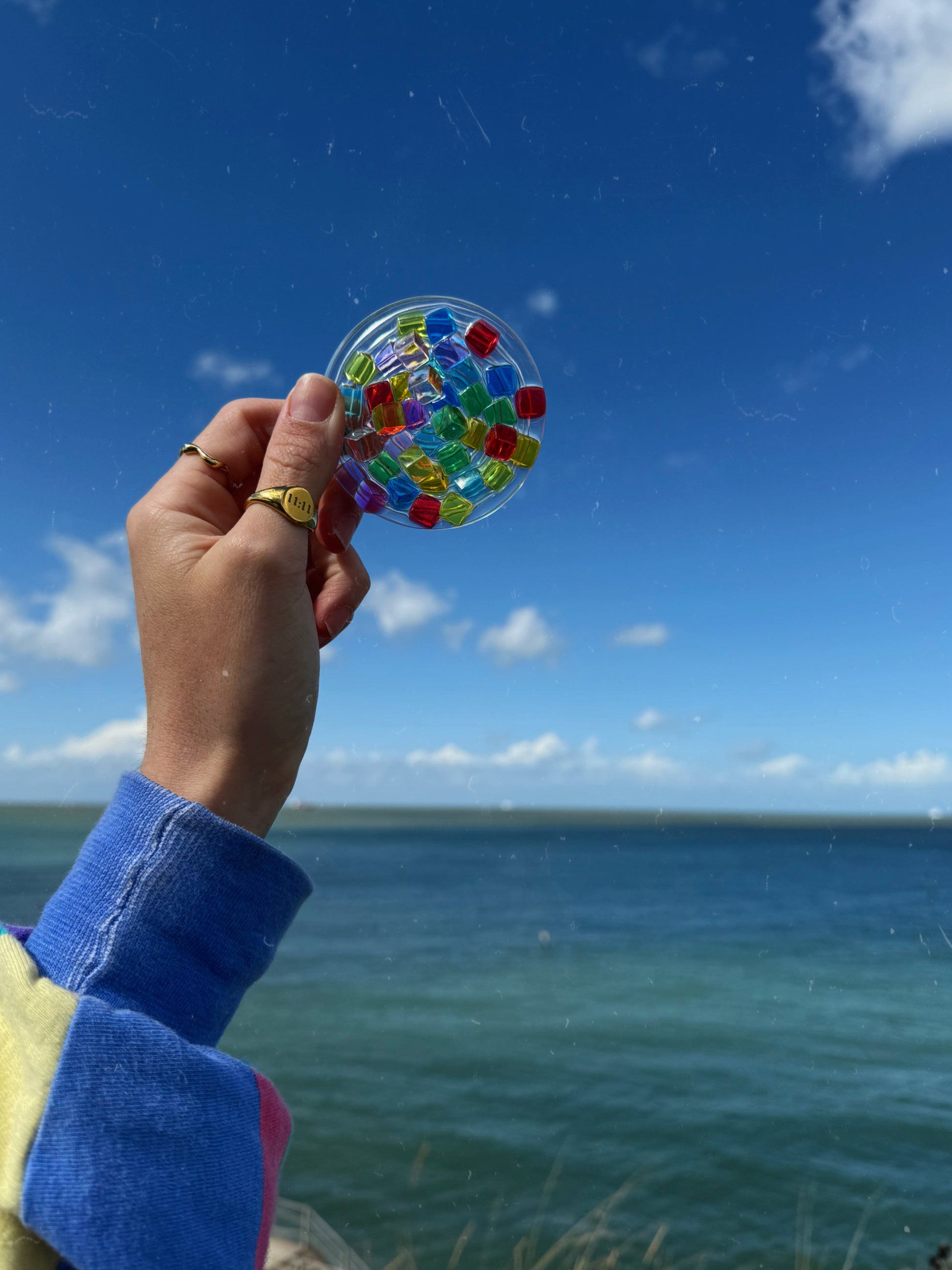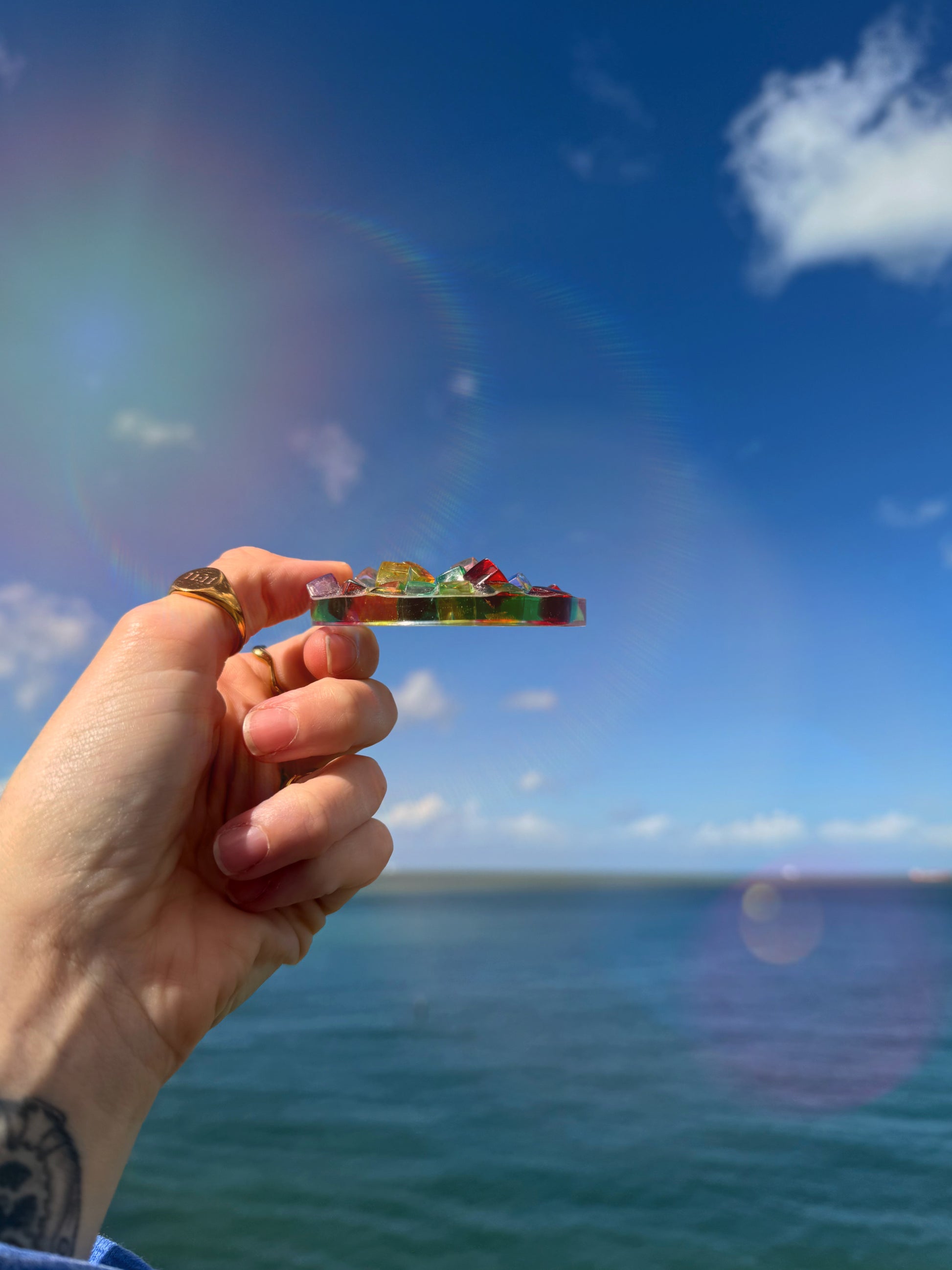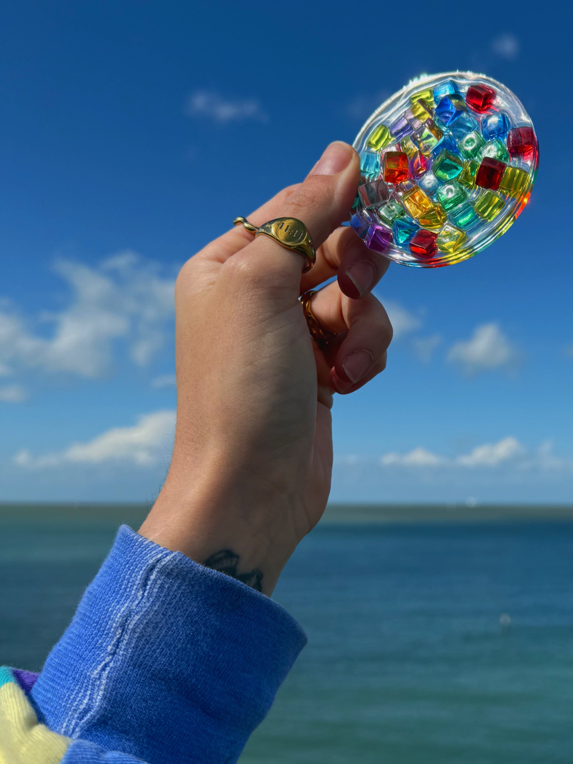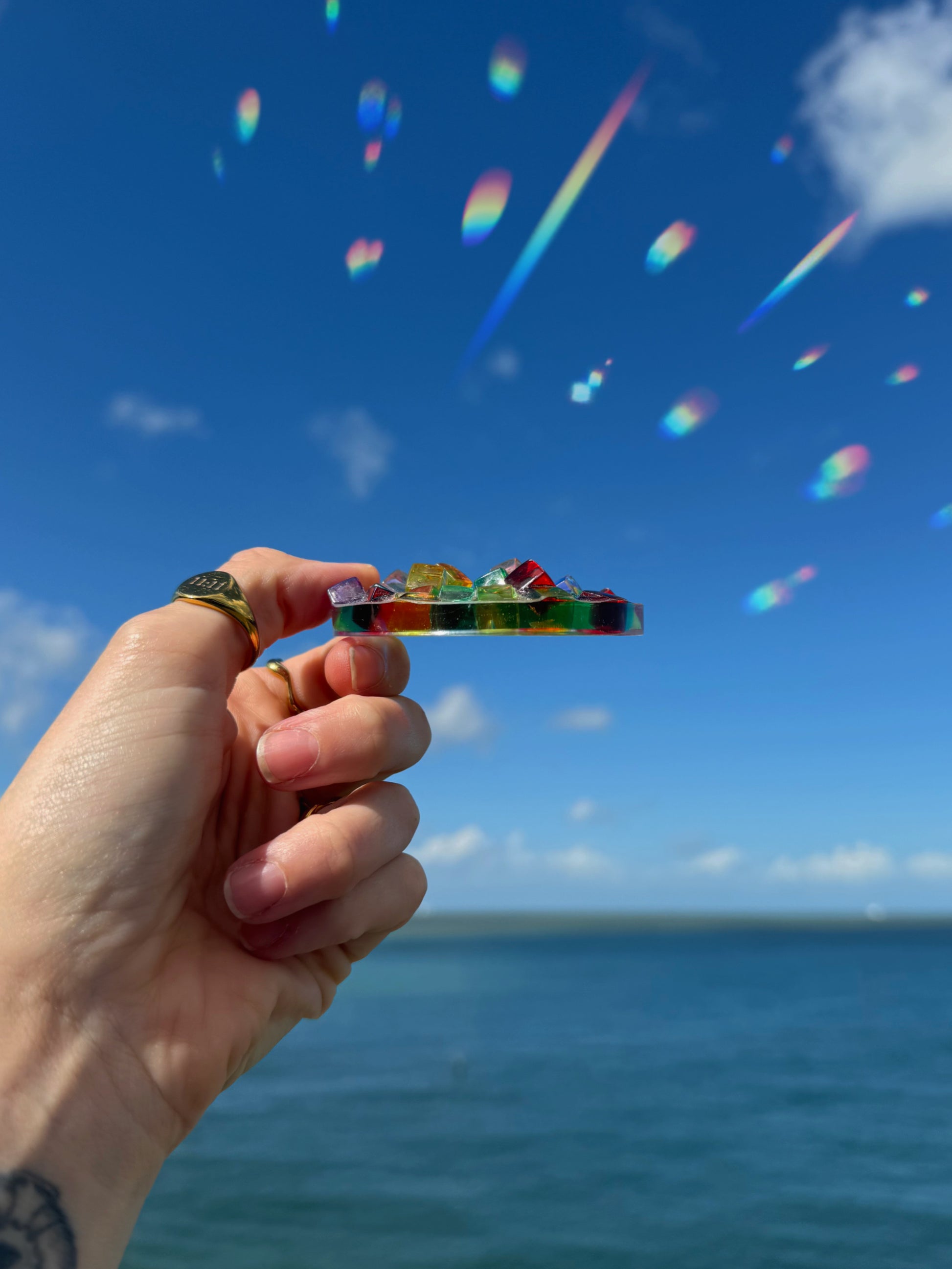 4 x the size of a micro ripple weighing in at 44 grams, our big small ripple is a handful. A crystal clear base with small transparent raj bow blocks on top.
