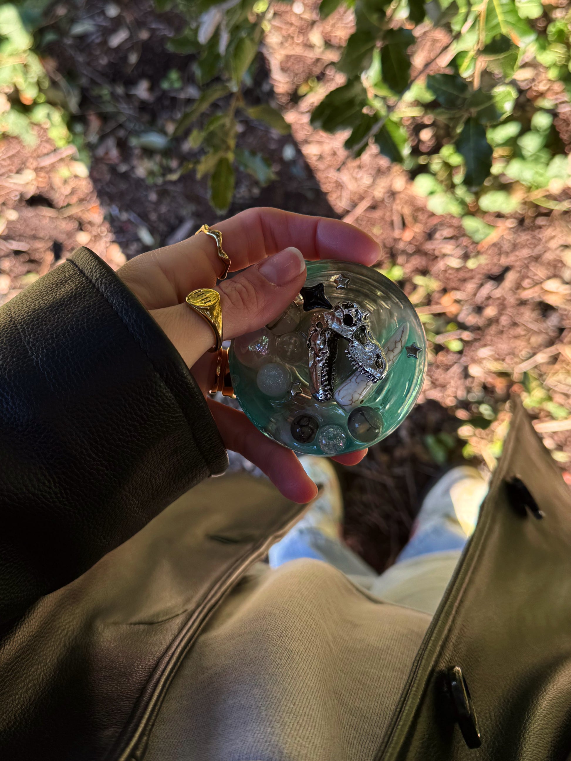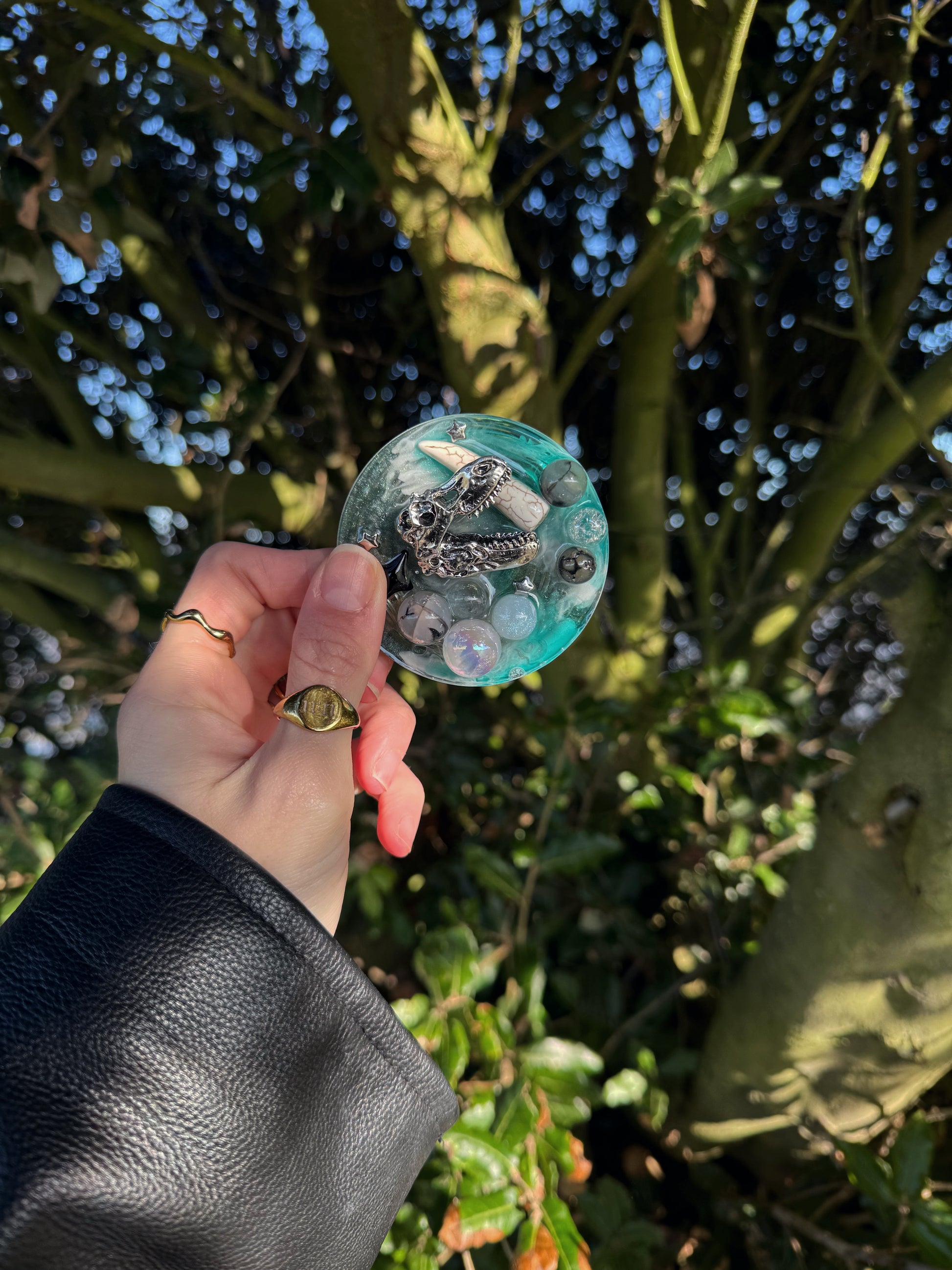 this dinosaur skull themed base of shiny green, grey and clear marbled together. On top is a mix of large glass, plastic and acrylic circle beads, a metal skull and a faux bone tooth.