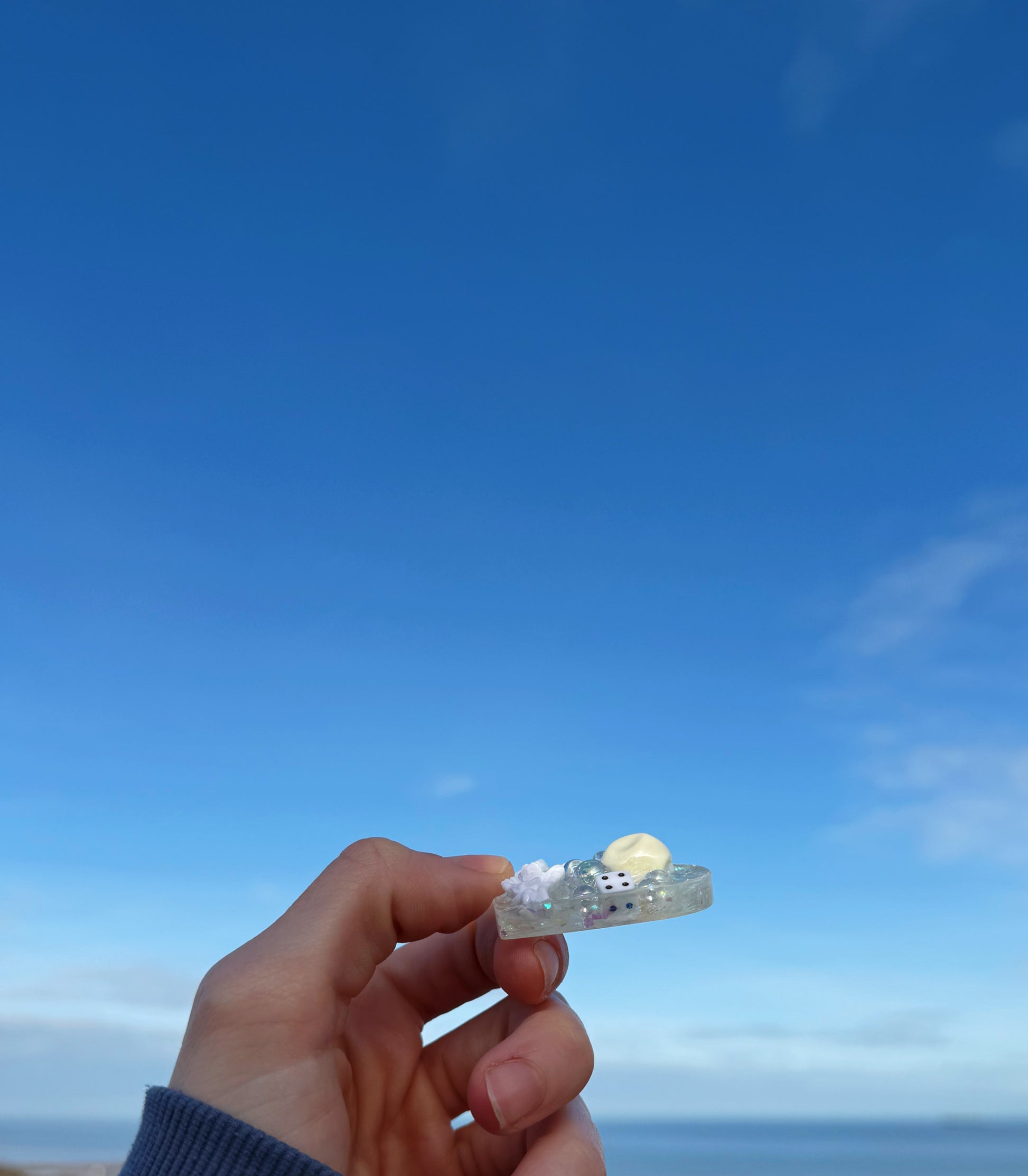 This chunky heart is a base packed full of chunky iridescent glitter shining with white and silver, in top is a mix of acrylic iridescent bubbles, a transparent feather and a white cherub as well as other small textured items.