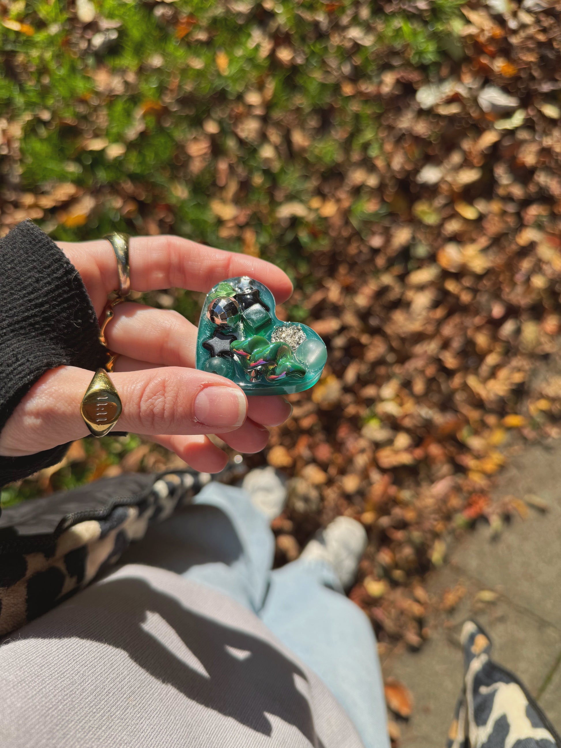 The stunning chunky heart is a forest green base with green themed treasure on top, marbled with streaks of silver throughout the hero of texture in this piece is the giant shiny green swirl on top, perfect for running your fingers over.