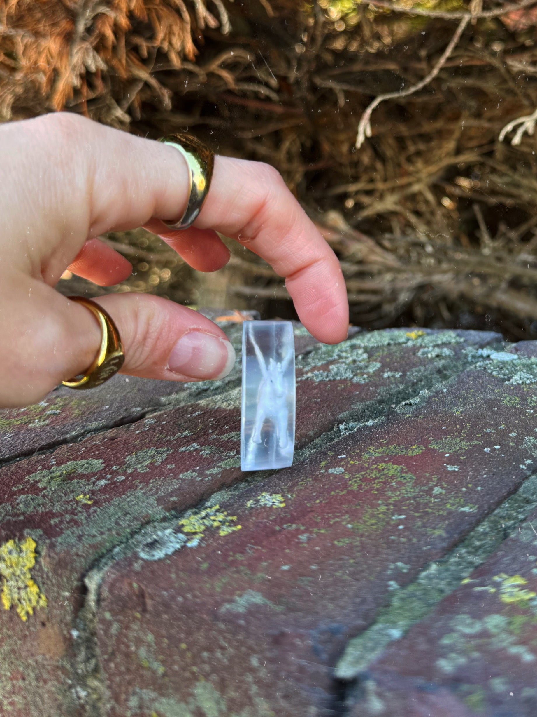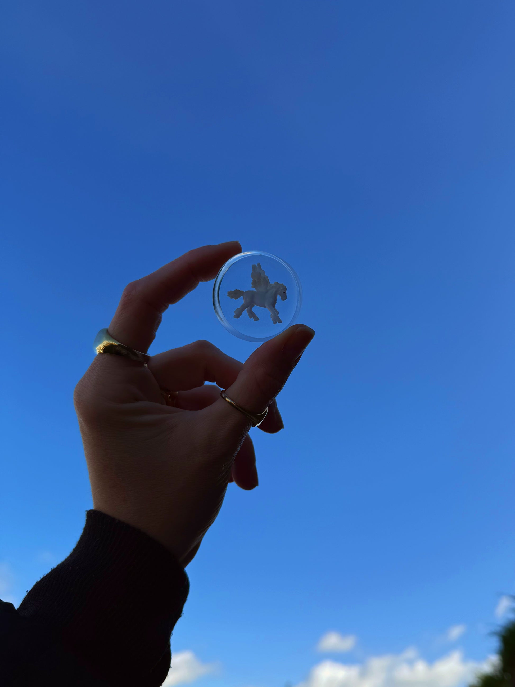 This chunky orb is a perfectly clear block with a mini Pegasus preserved inside. This has two smooth sides and is heavy in your hand.
