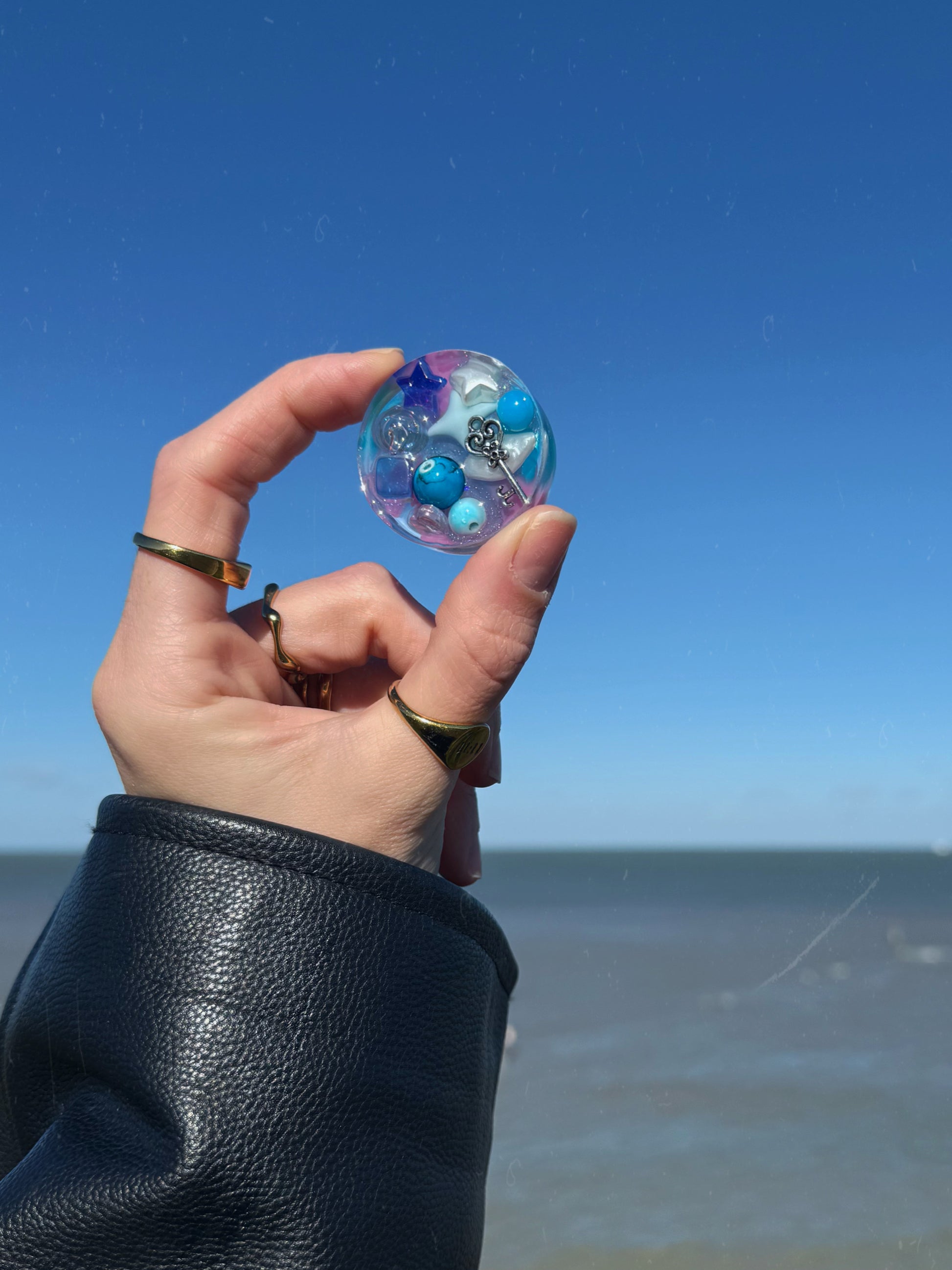 This chunky orb has a mermaid inspired pink and teal base marbled with glitter, on top the magic themed treasure includes ocean colours.