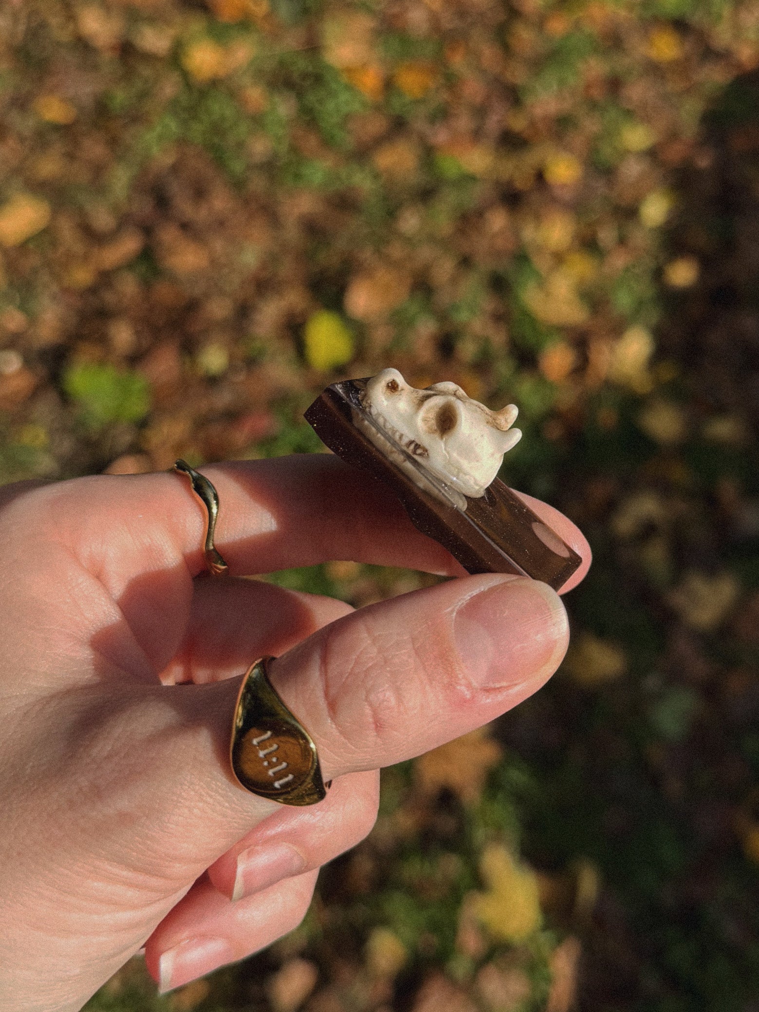This wave is a solid shiny chocolate brown base with a dragon skull bone on top on one side.