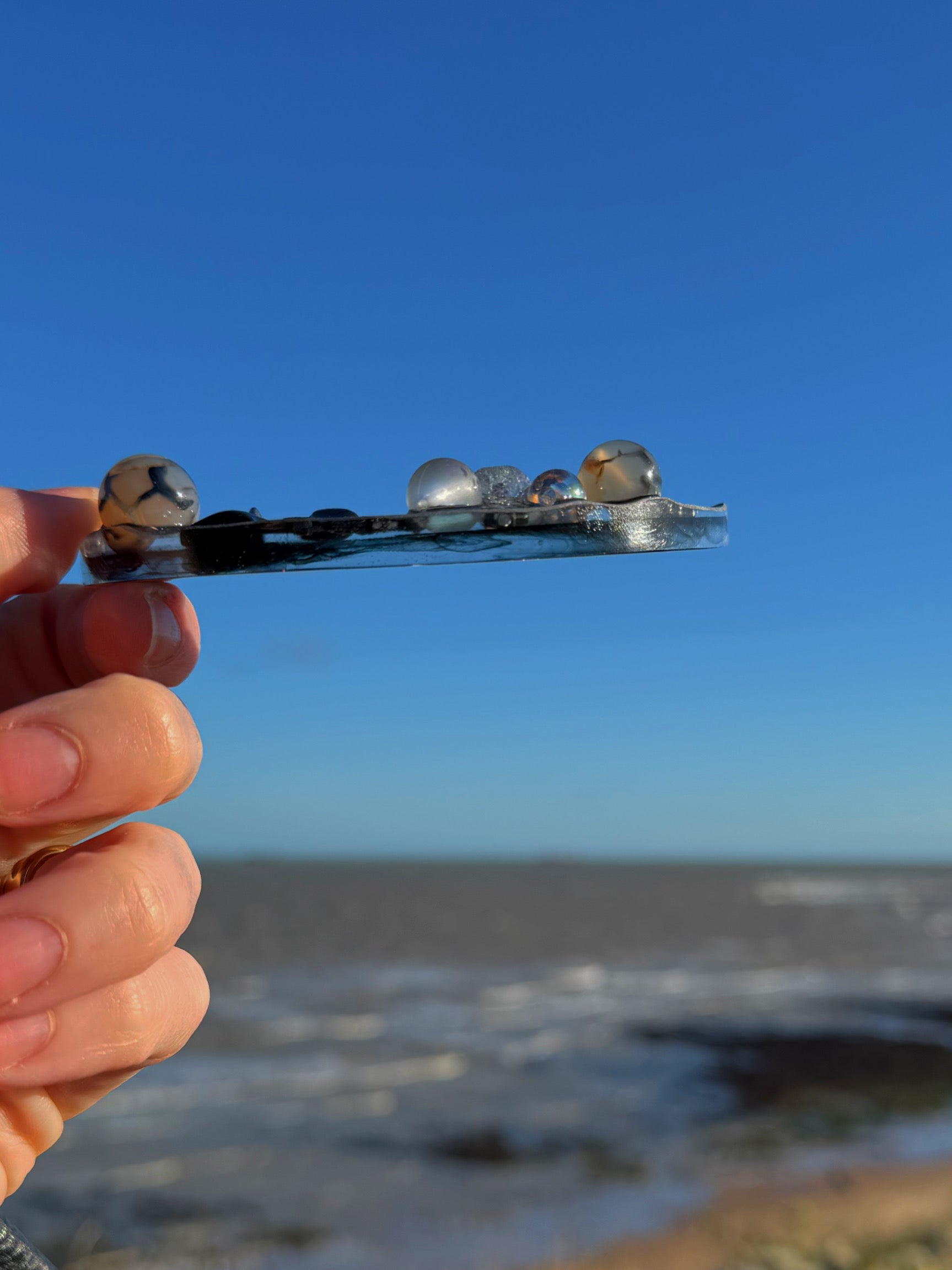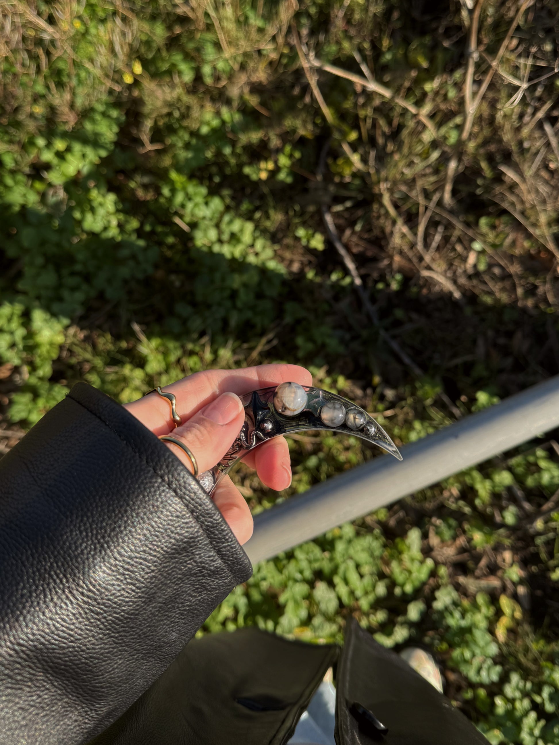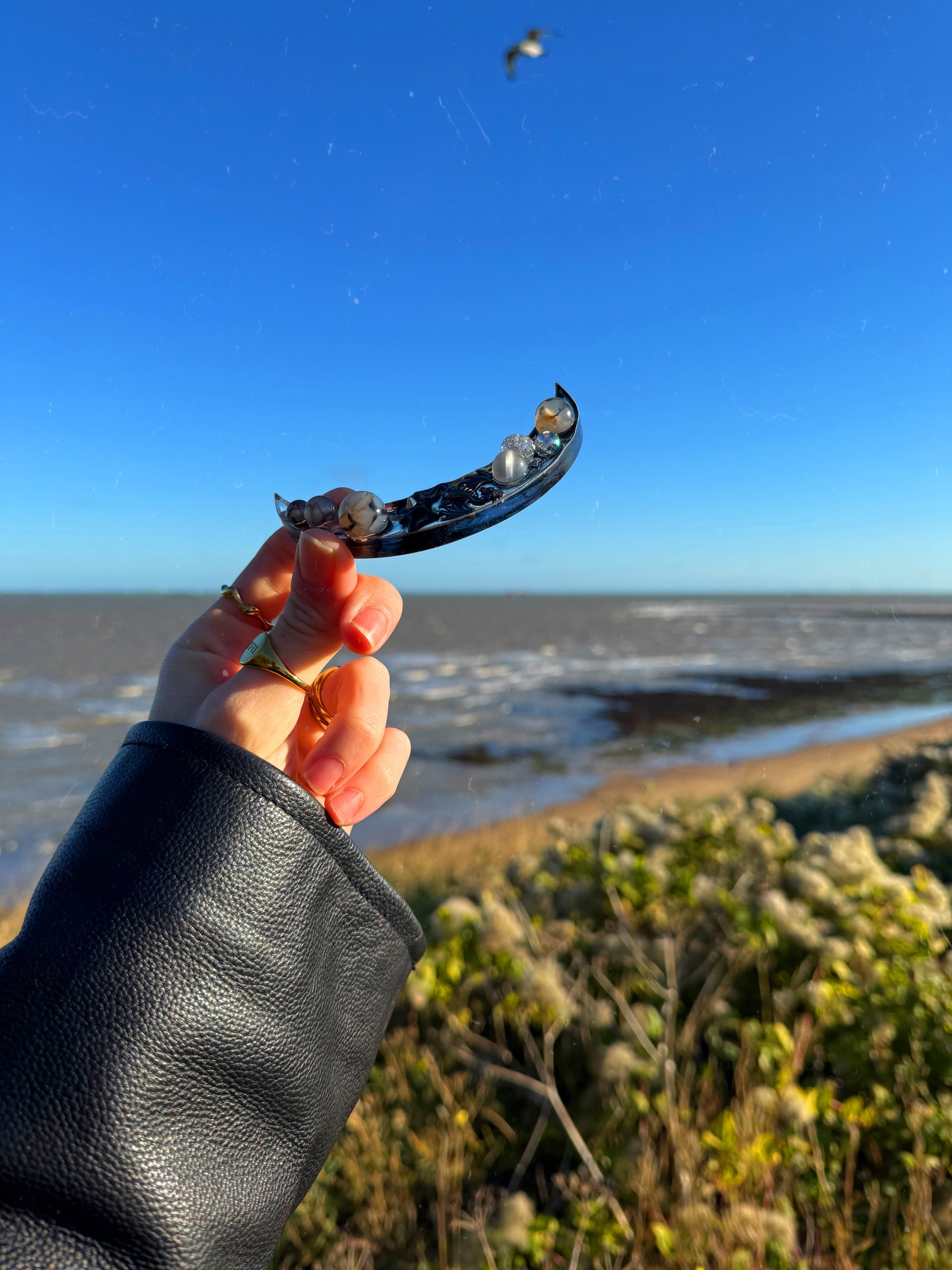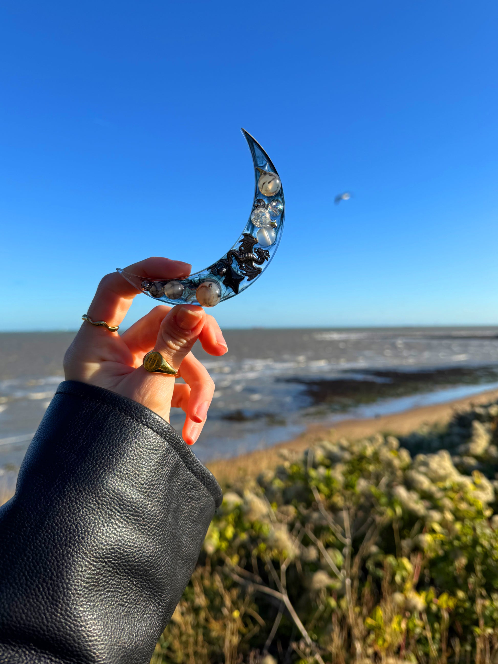 This mini Mildred moon a skinny grey and black themed crescent moon, with a smokey colour theme over two layers. This tinker has glass balls and a metallic dragon ontop.