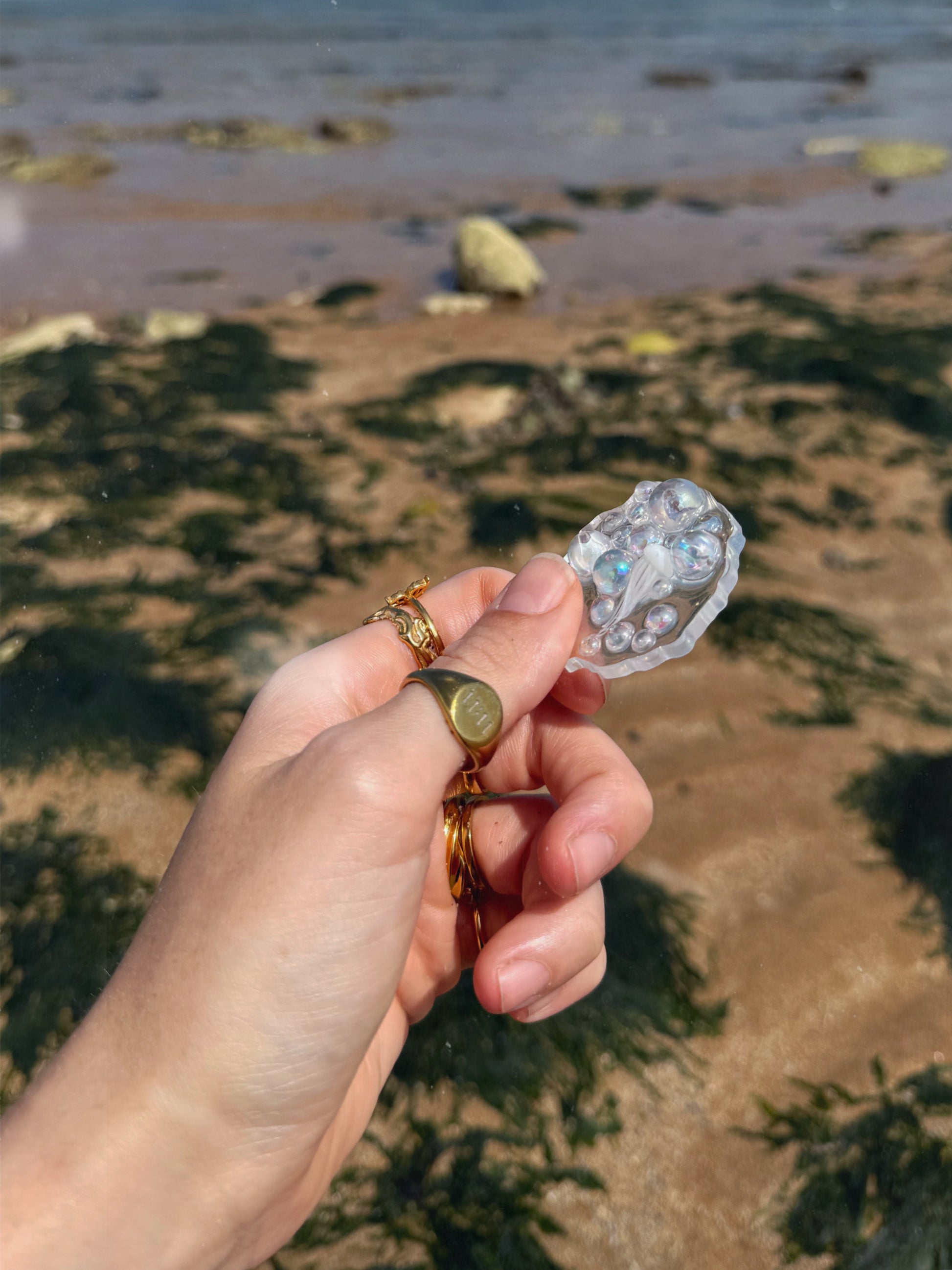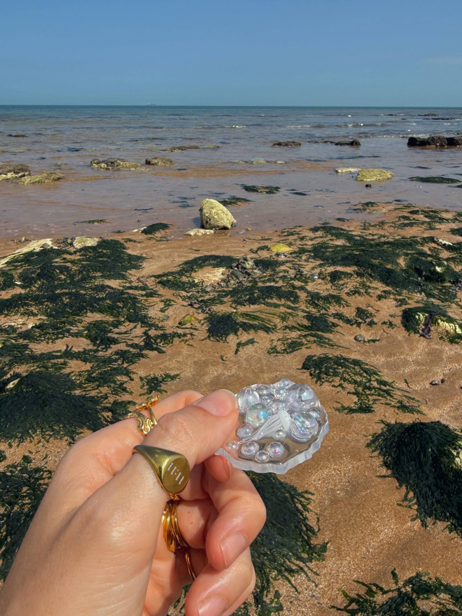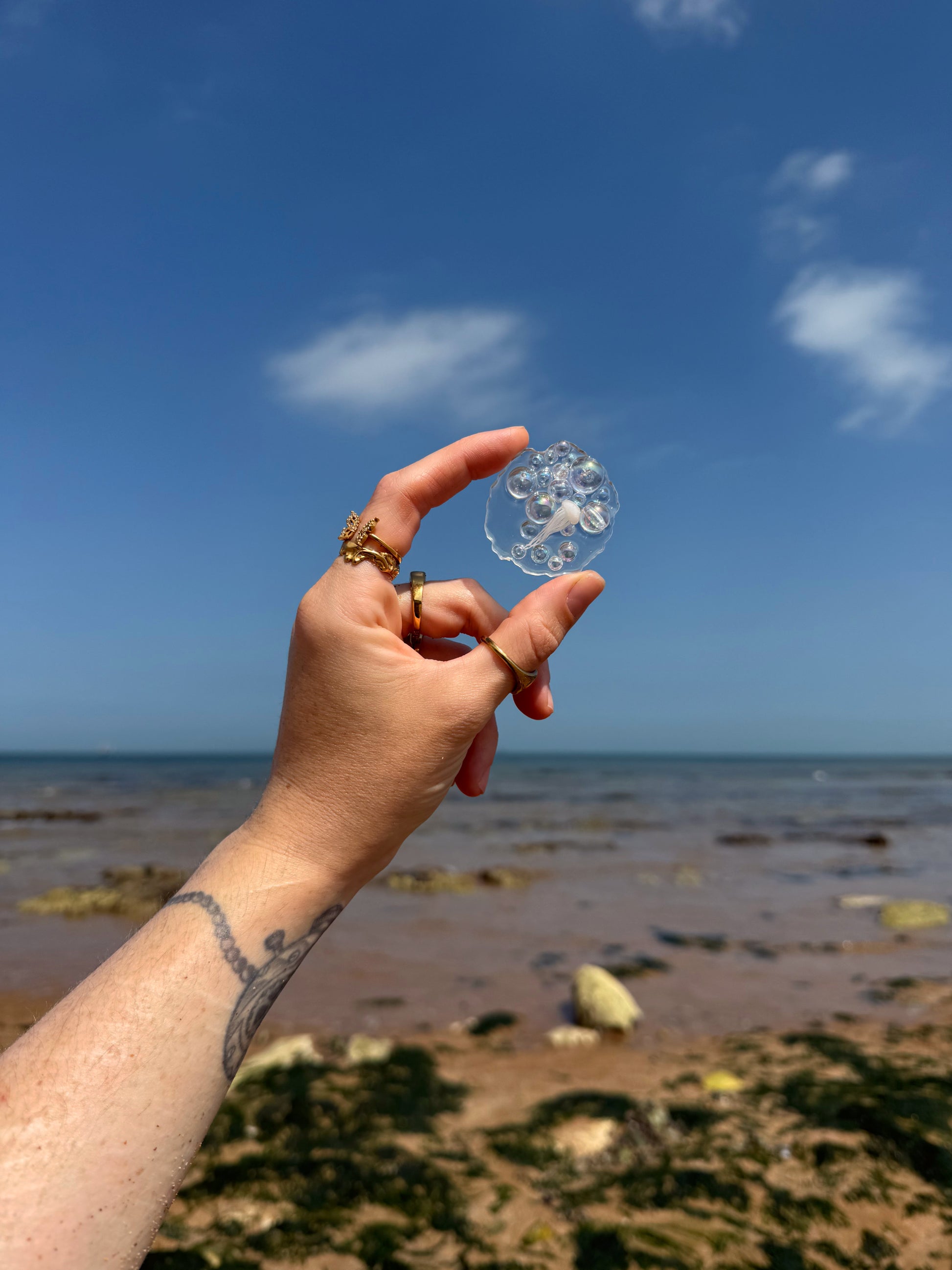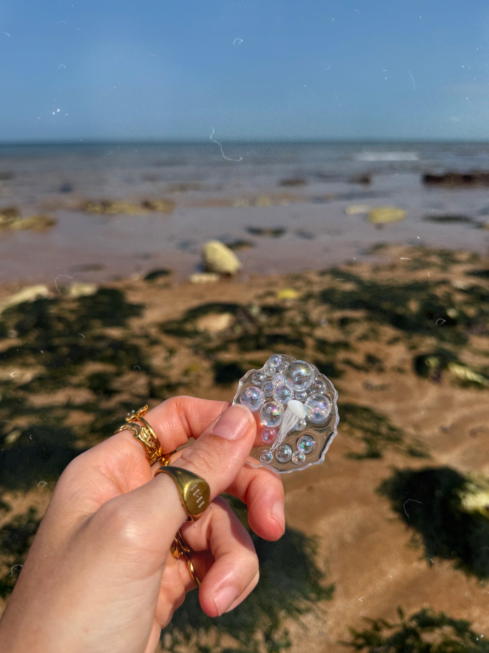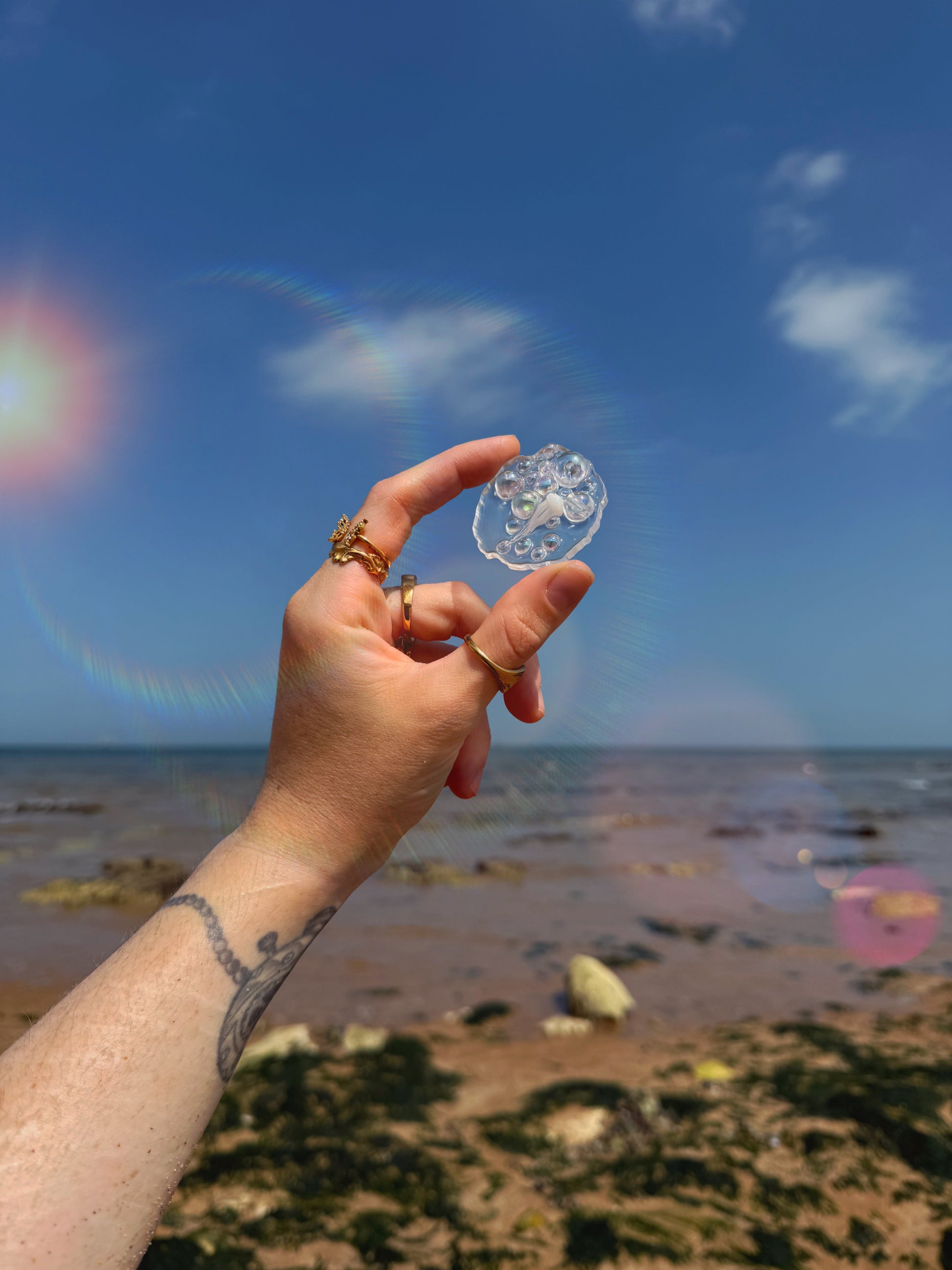 The geode orb has a perfectly bumpy edge all around the outside, this geode is a transparent base she’s then full of iridescent acrylic bubbles in a mix of all different sizes, hidden amongst the bubbles is a tiny white jelly fish. Each one of these geode orbs is slightly different, the one you receive may not look identical to this one.