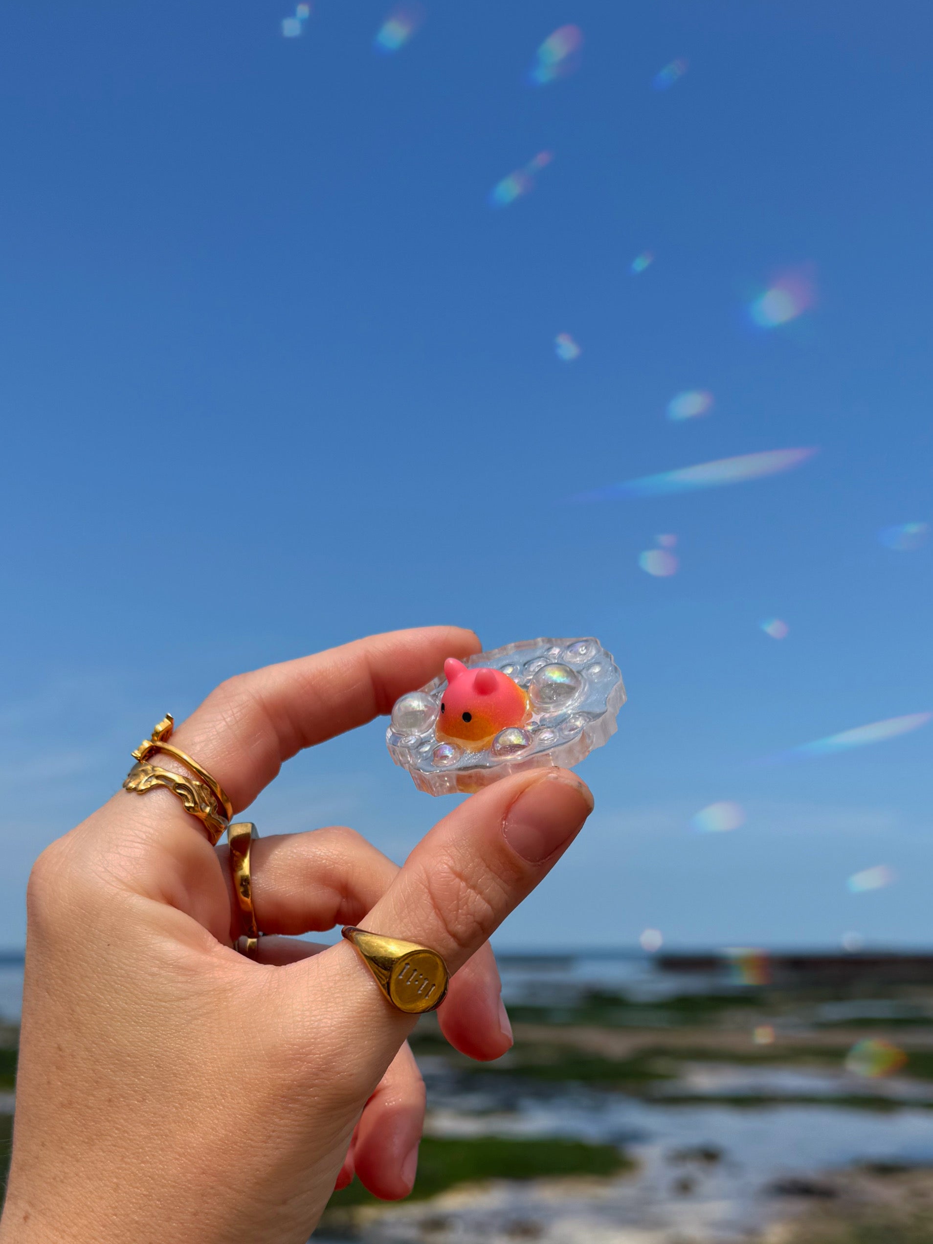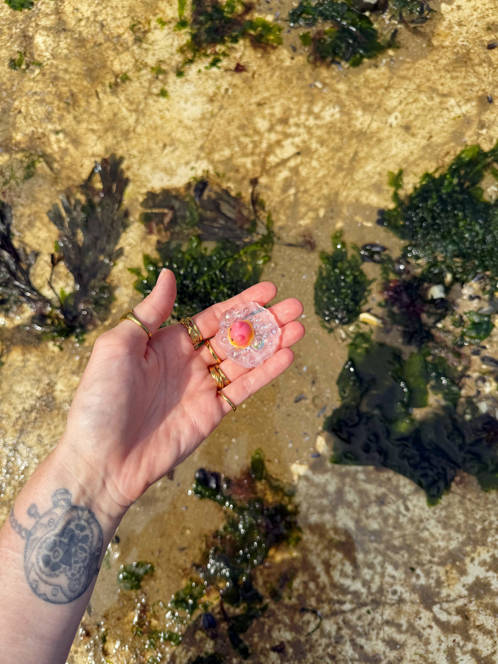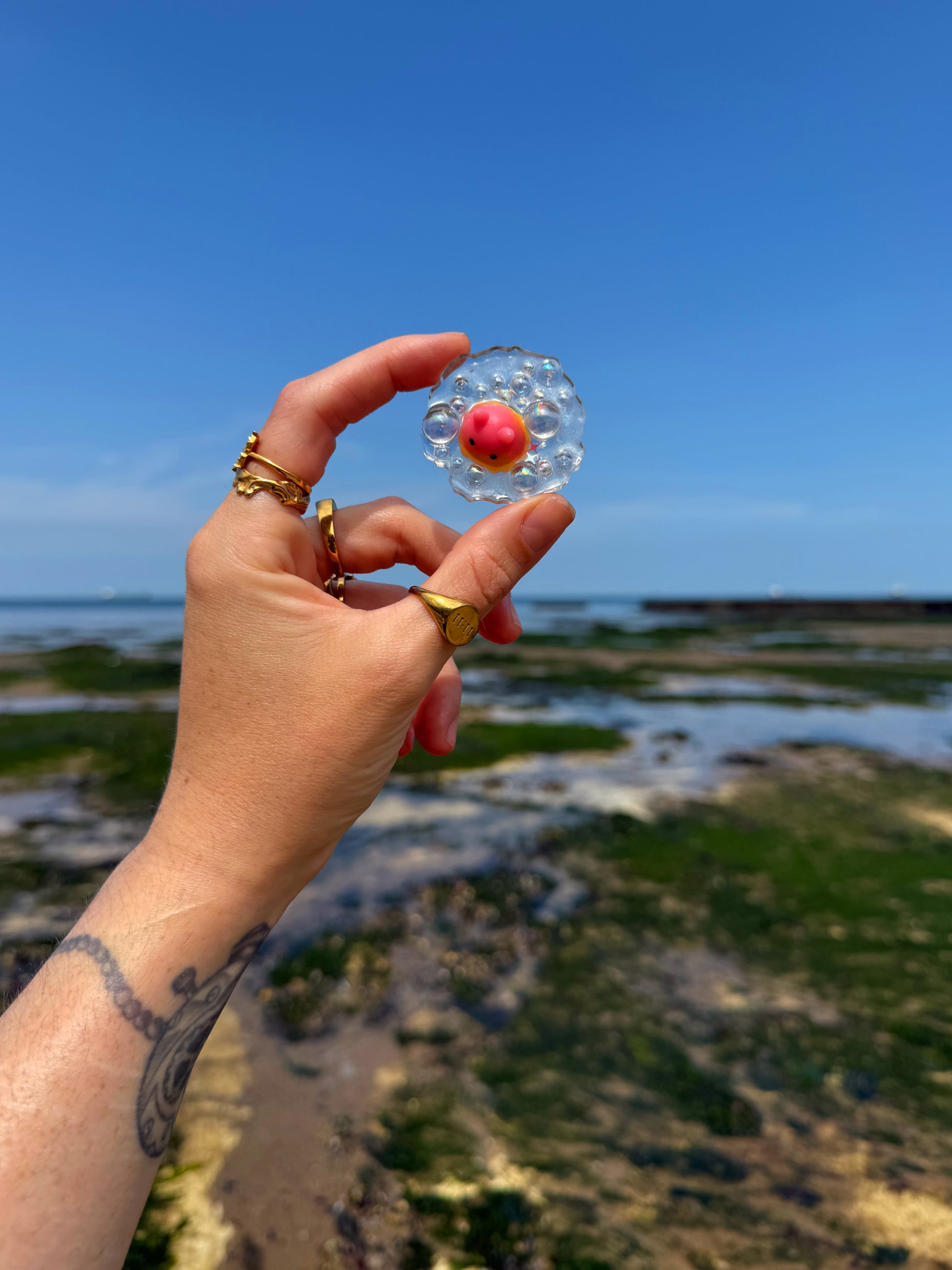 The geode orb has a perfectly bumpy edge all around the outside, this geode is a transparent base instead of being full of lots of small pieces to provide texture this geode has 1 mini orange jelly fish with iridescent acrylic bubbles around her.