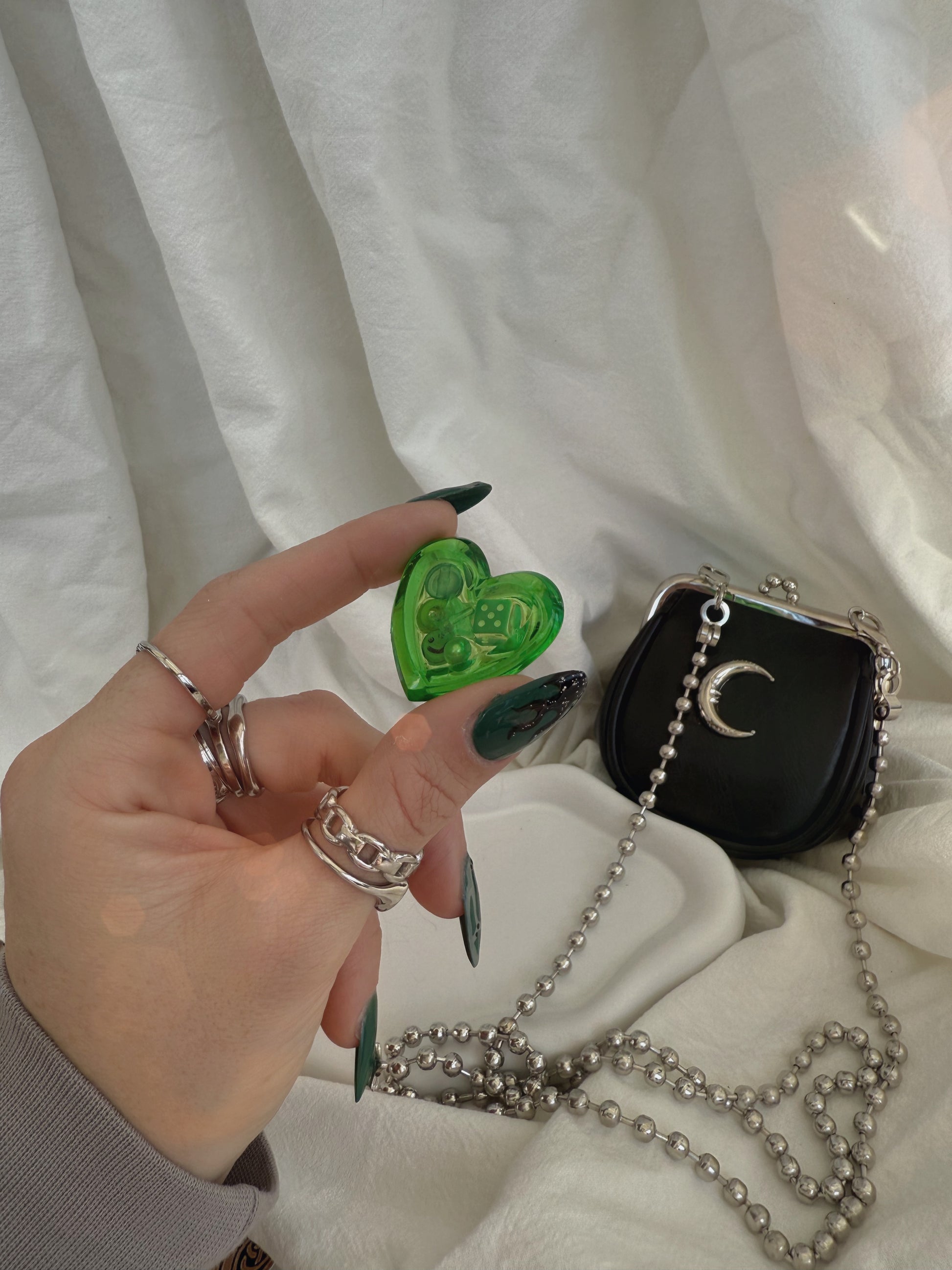 This limited edition giant green gem with small green themed treasure hidden inside. One side is smooth and one side is textured.