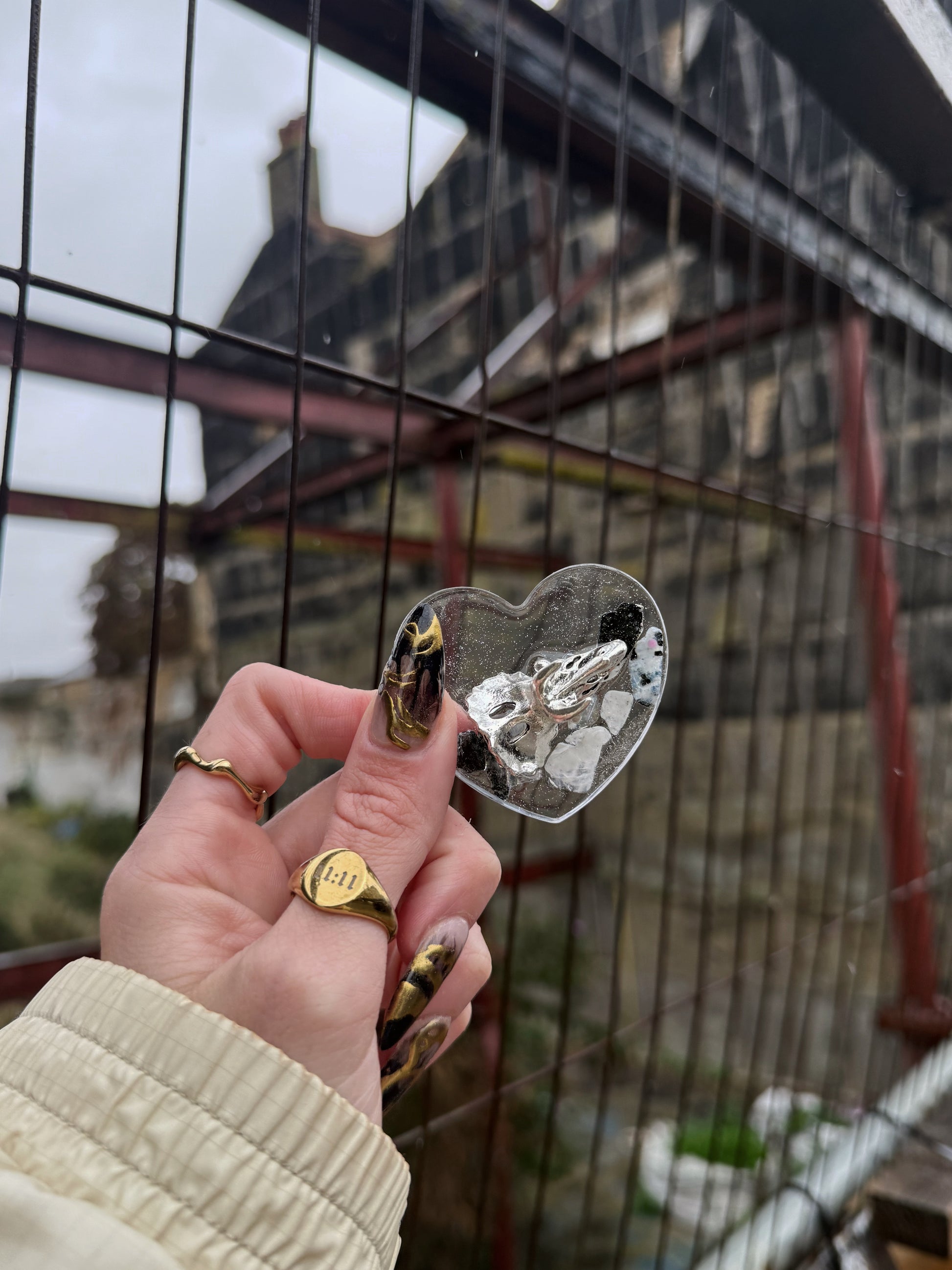 This heavier heart orb is a crystal clear base with a subtle silver sparkle throughout in the bottom third there is scattered dalmatian Jasper chips which is the type of gemstone, on top of the stones is a heavy metal silver triceratops skull. He has two pointy horns on the top of his head that stand over 2 cm tall from the base. They’re perfect for running over your skin gently.
