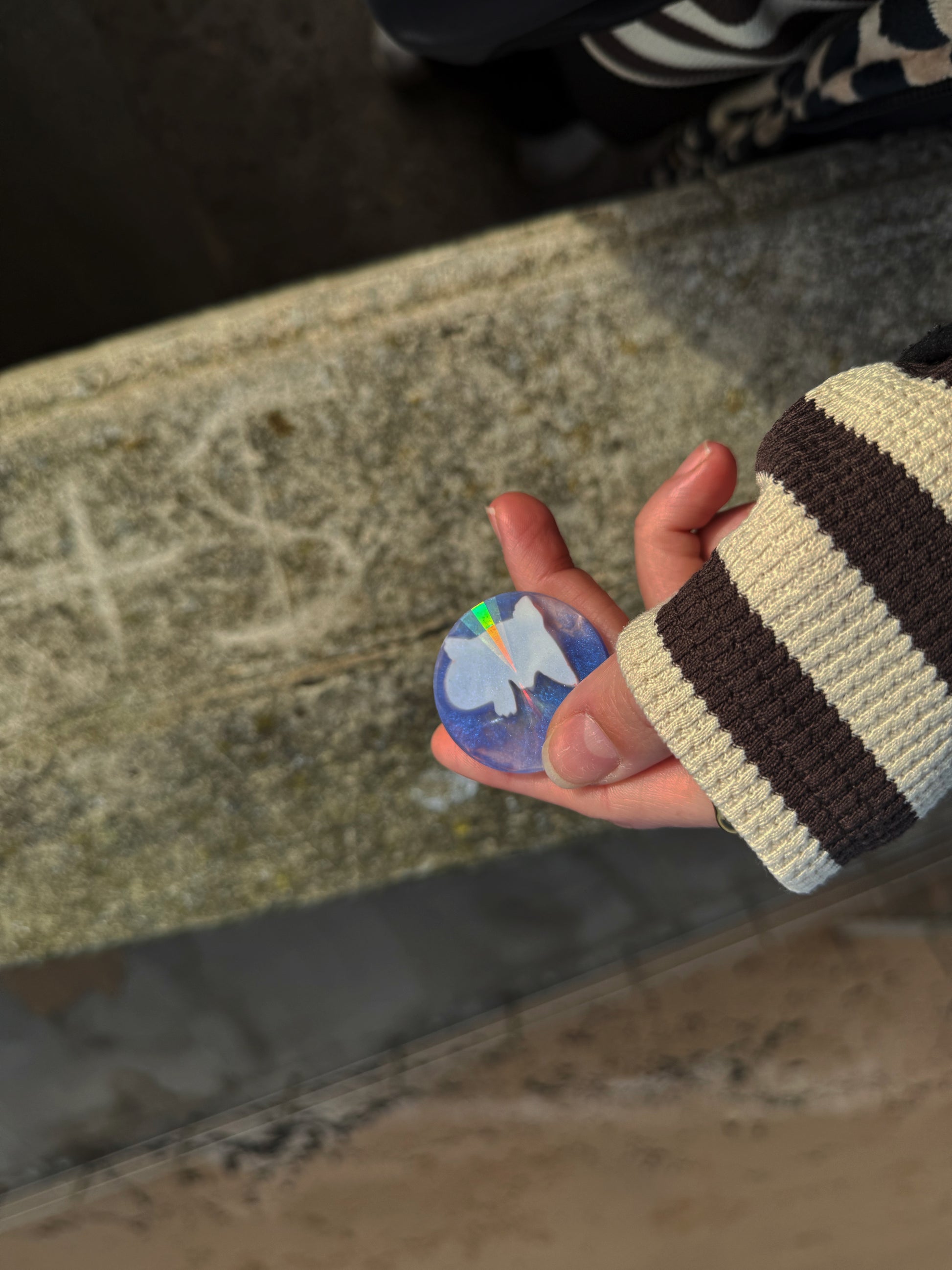 Our holographic orbs mix together tactile texture and visual stimming with holographic rainbows on the back when you catch the light, this can be used outdoors in the sunlight or inside in artificial light.