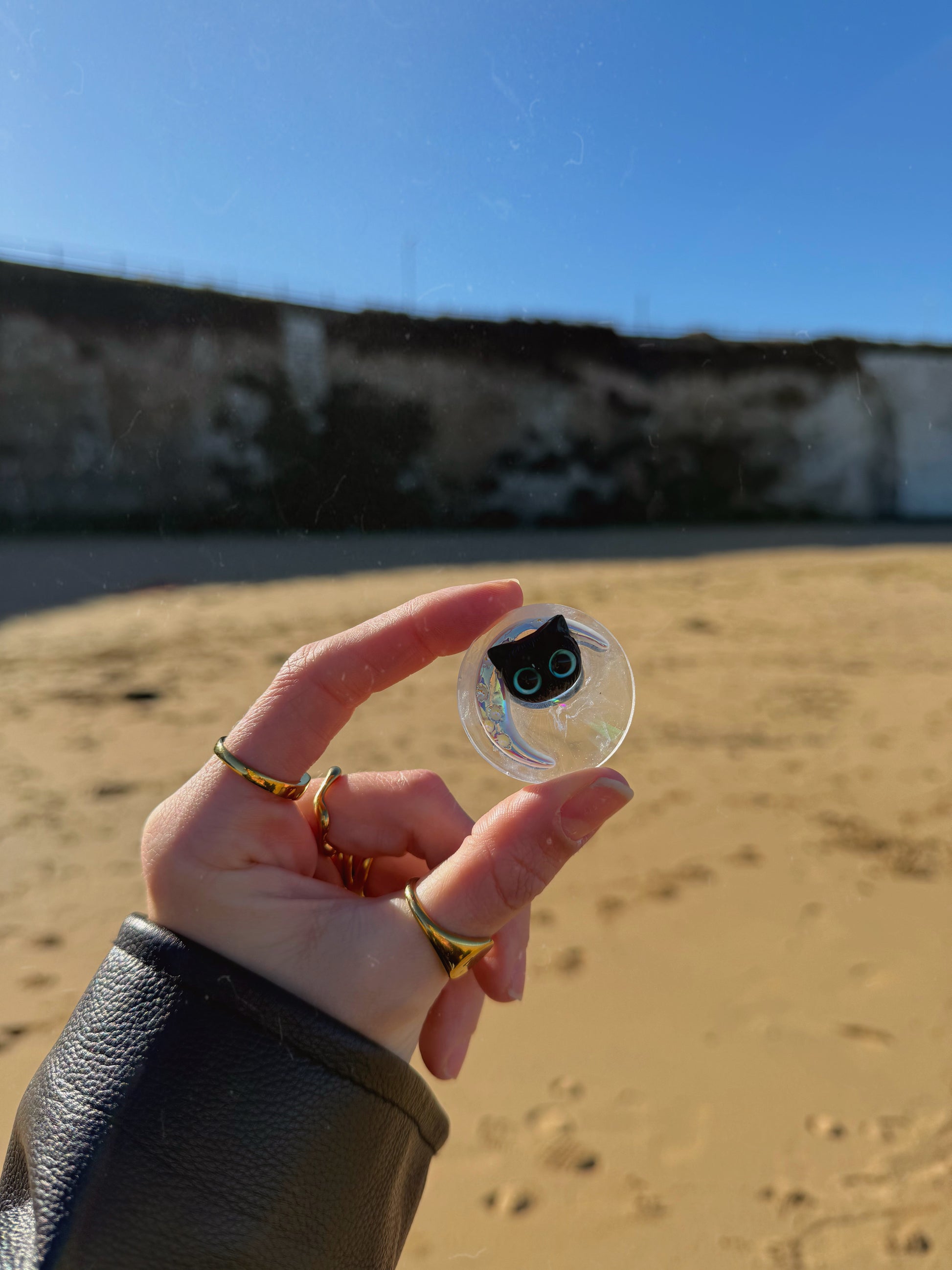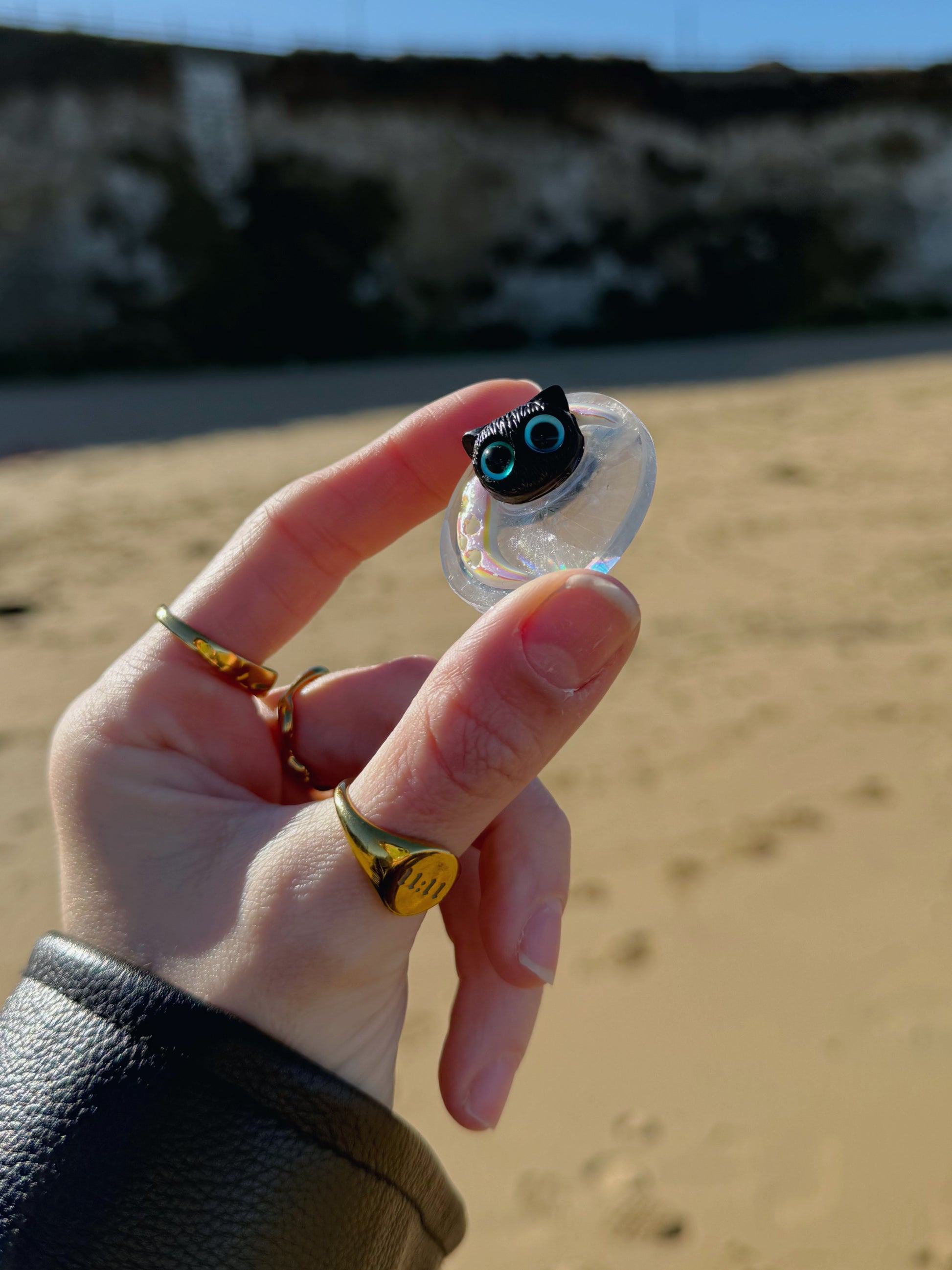 this holographic orb is a base of silver ink with a white iridescent textured crescent moon along one edge and a black cat head sat against the moon.