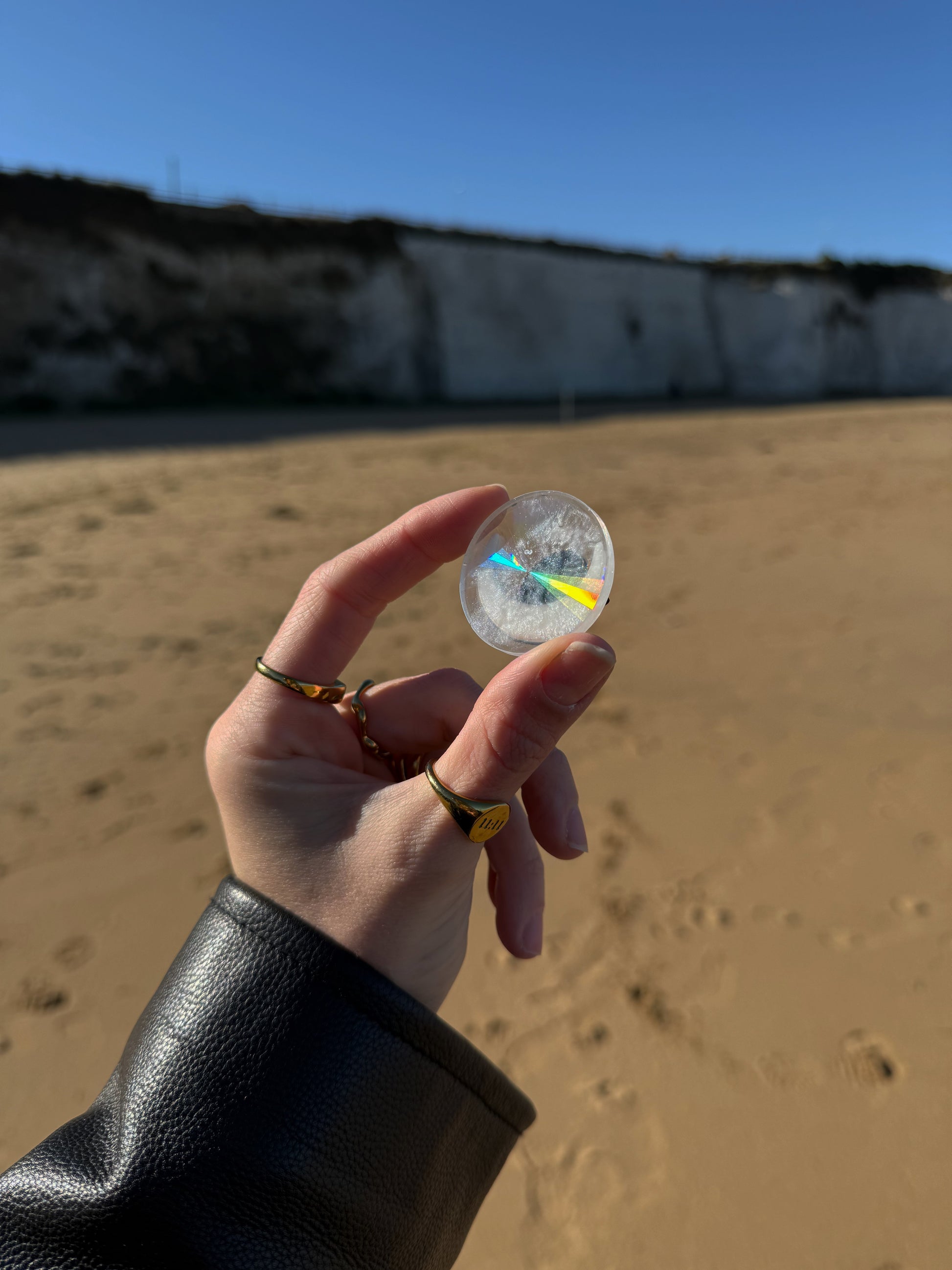 Our holographic orbs mix together tactile texture and visual stimming with holographic rainbows on the back when you catch the light, this can be used outdoors in the sunlight or inside in artificial light.