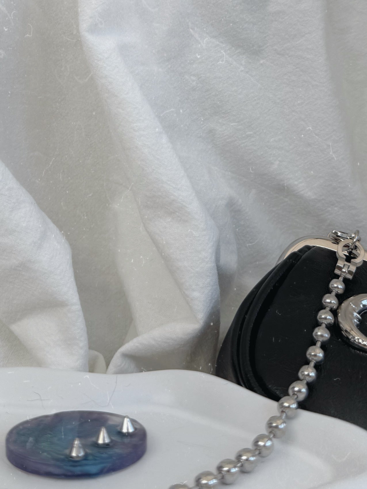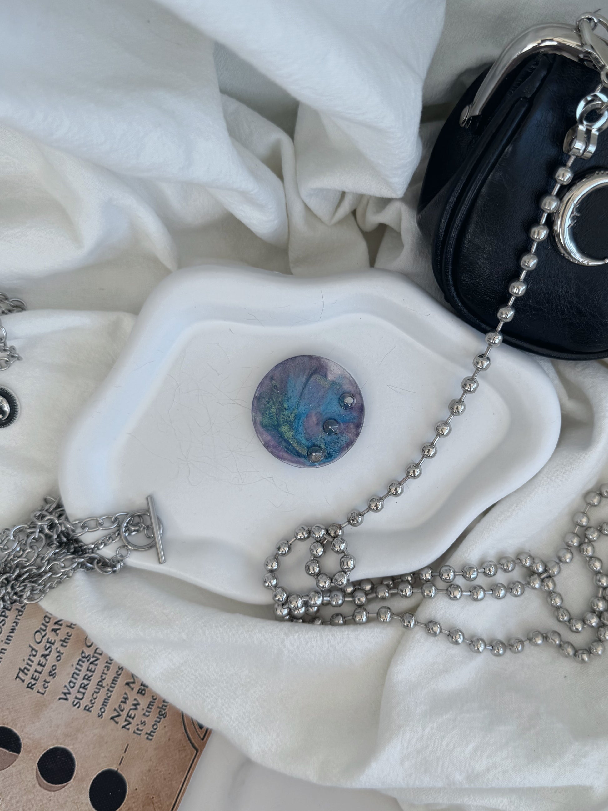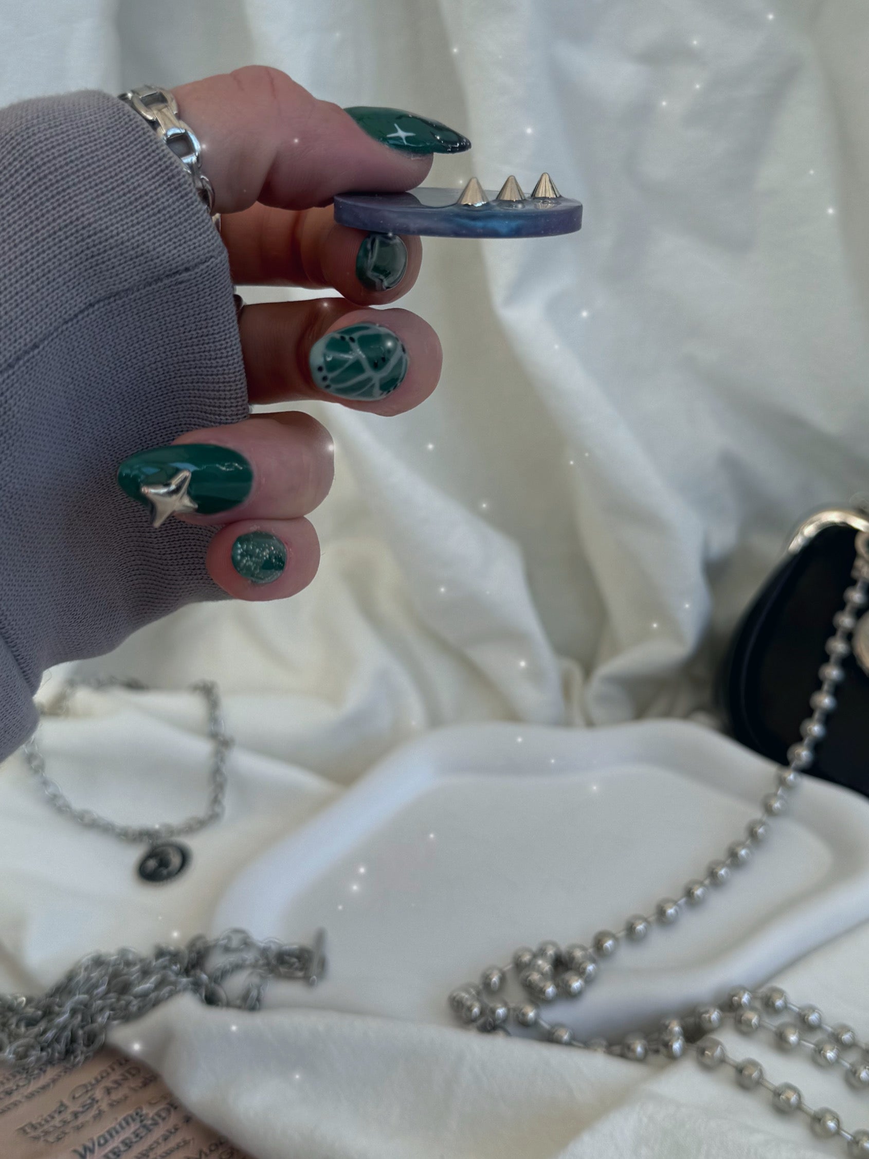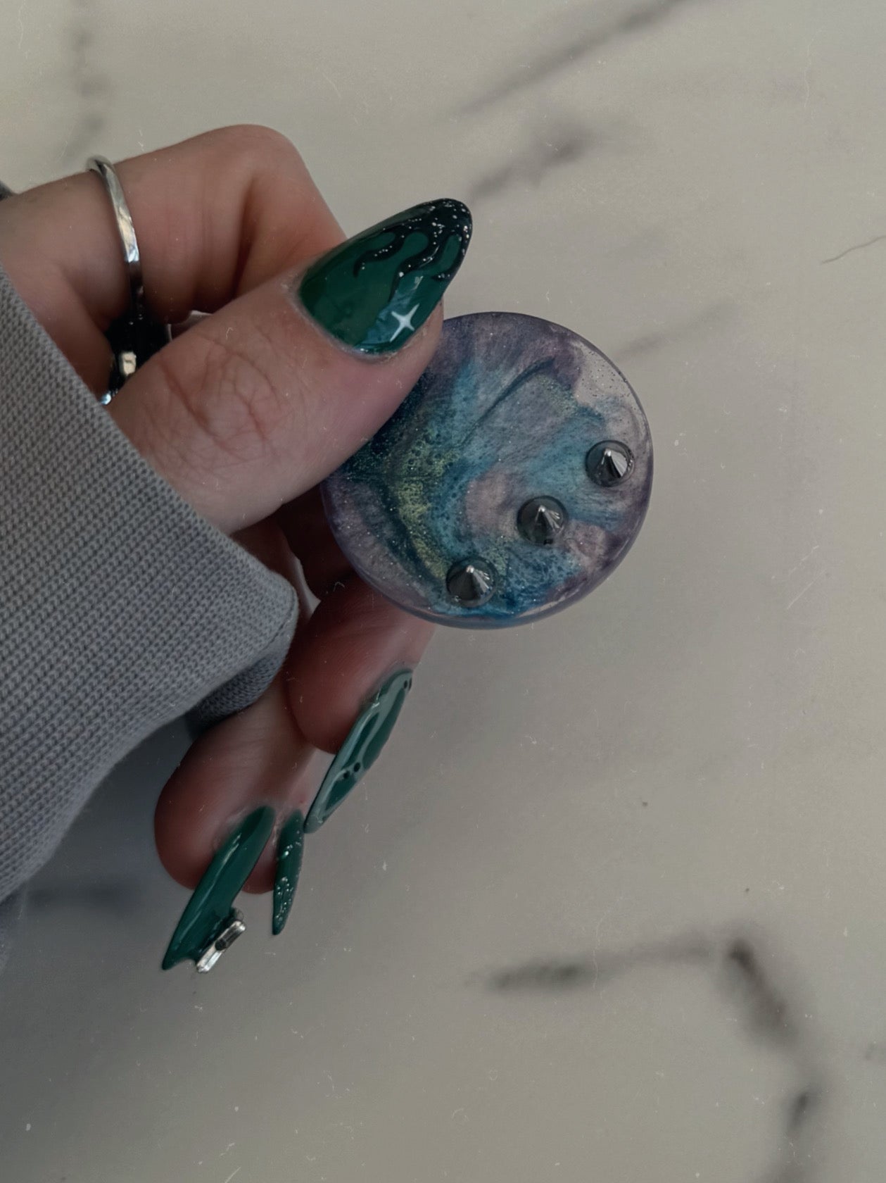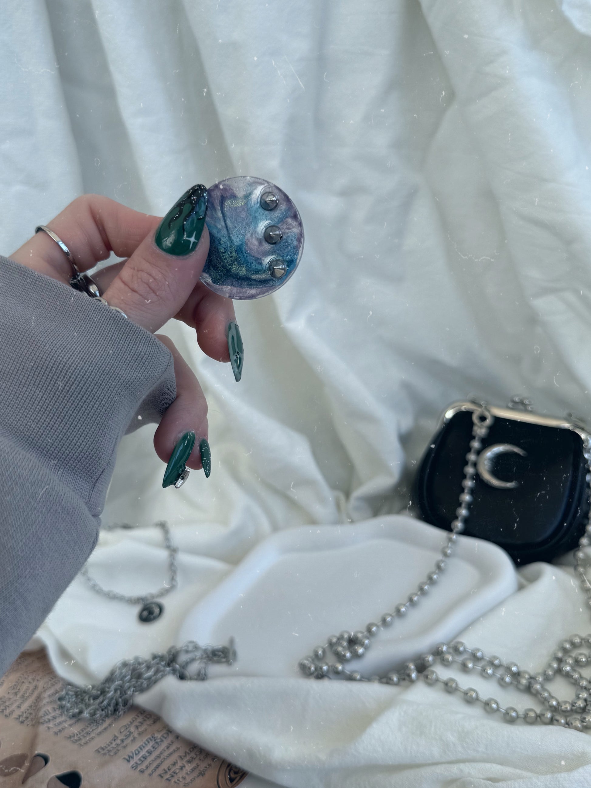 This holographic orb is shiny blue and purple marbled base, on top is our jazshouse safe spike, a small metal stud with a rounded end, designed to dent your skin but not break the skin.