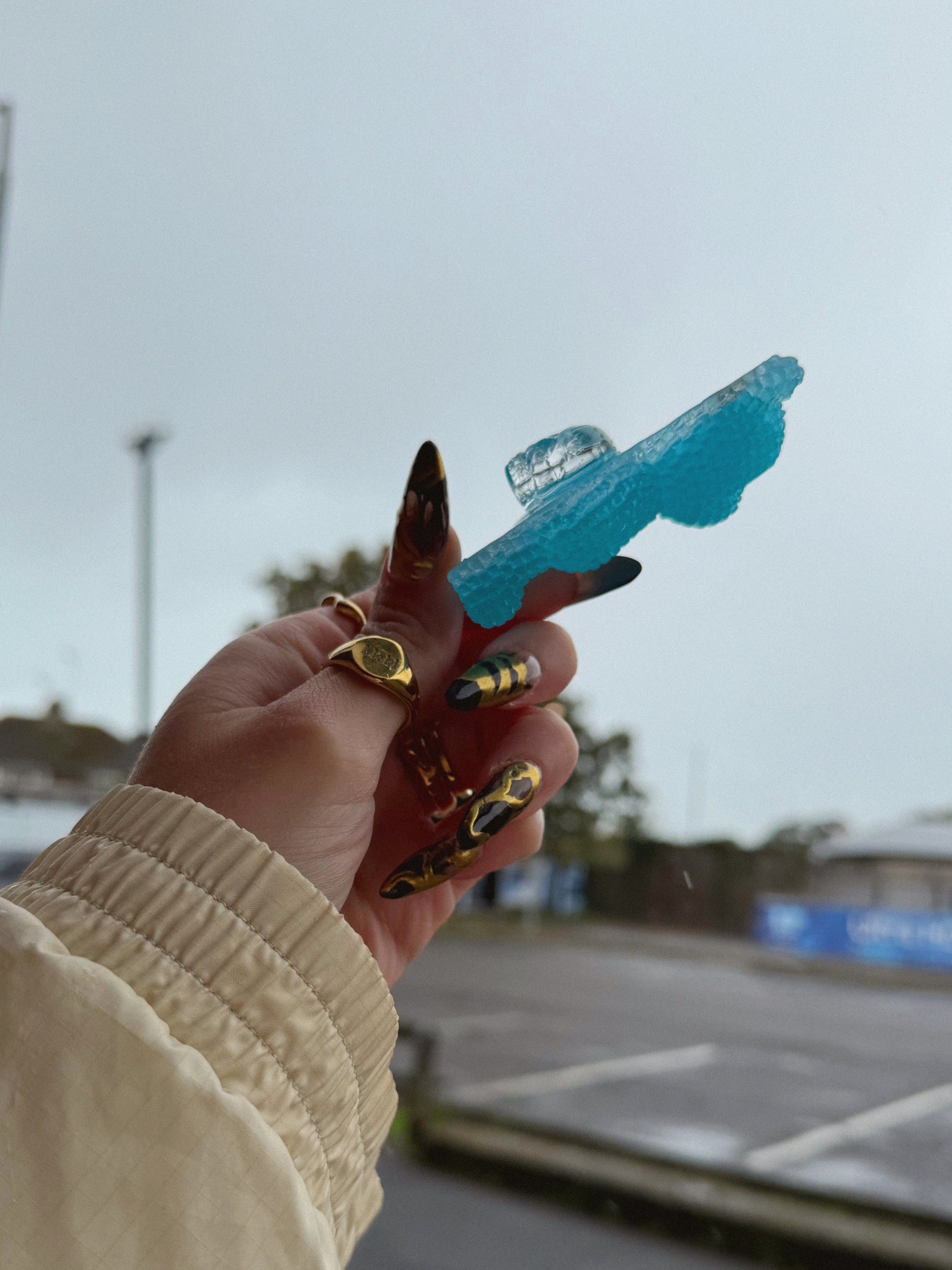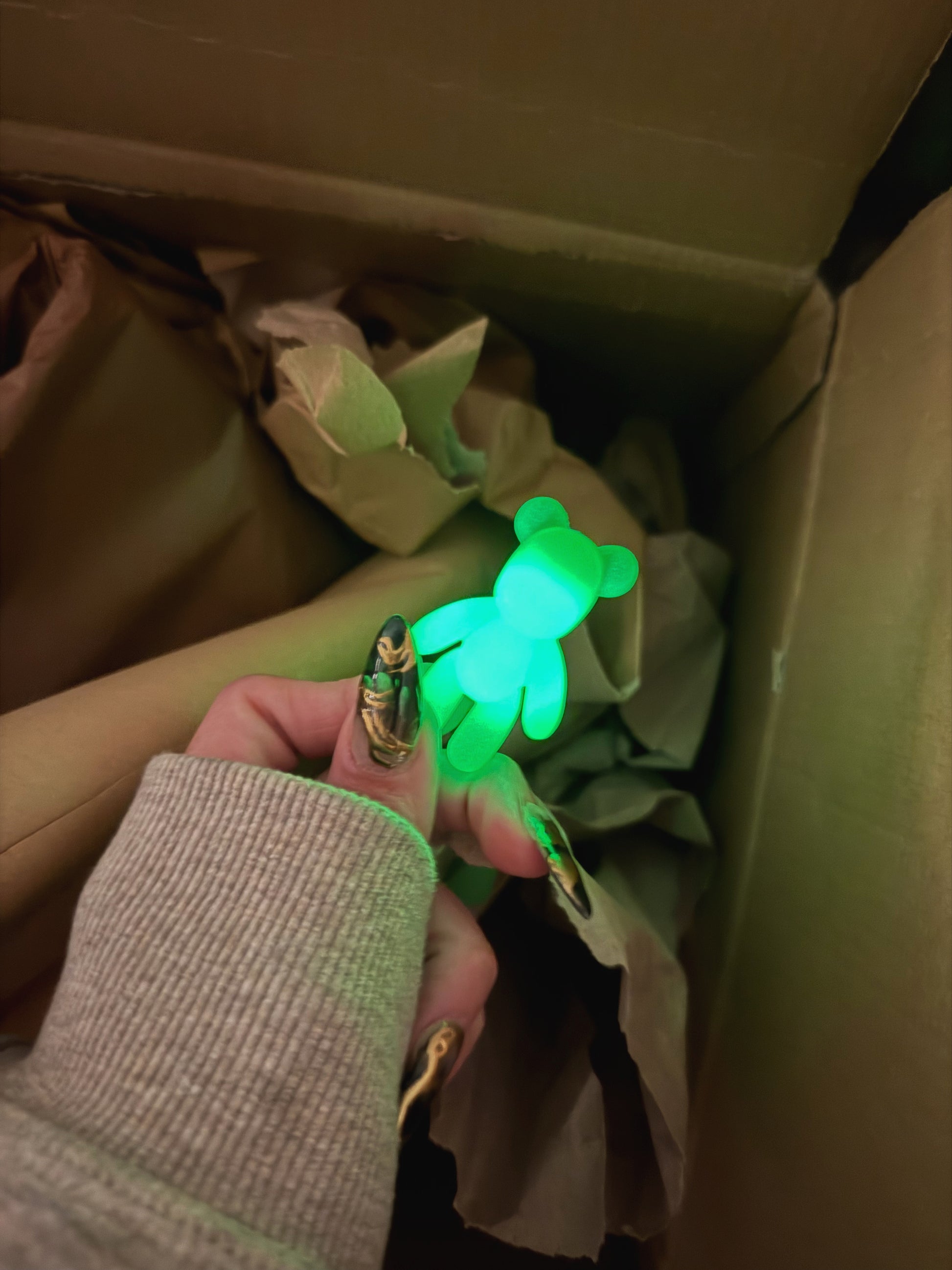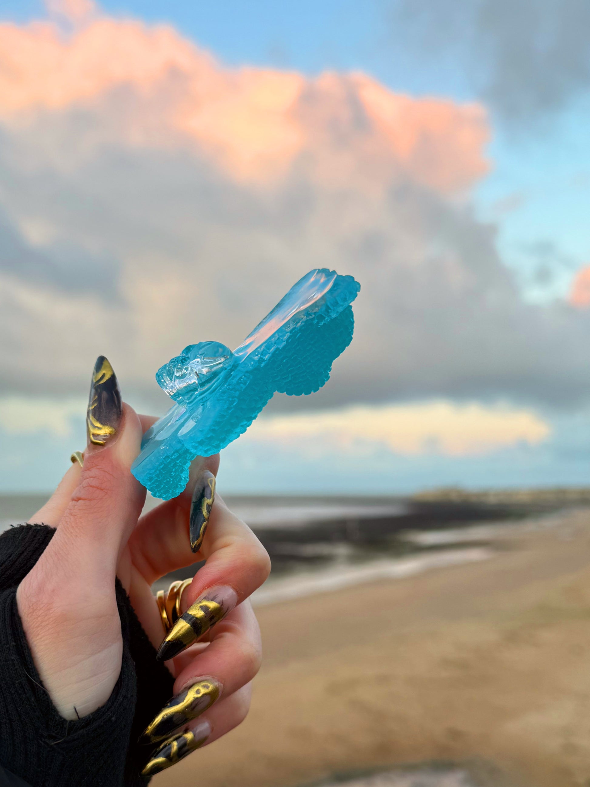 The double sided Jagger bear is full of bright blue glow in the dark powder, he looks almost translucent and glows brightly when charged either in the sunlight on a windowsill or outside or with the UV light taking seconds. Our classic Jazz’s house spiky Jagger bear front when turned over has a perfectly clear acrylic skull on his back, heroing negative space and smoothness this Jagger bear has a perfectly smooth back of head with a silver moon hidden inside the resin, smooth arms and smooth feet. The texture in this one comes just from the front and the back skull.