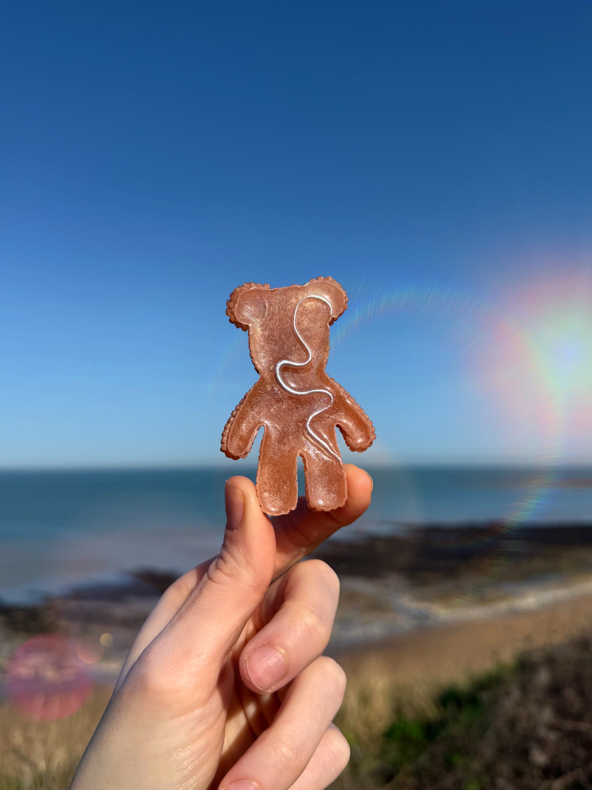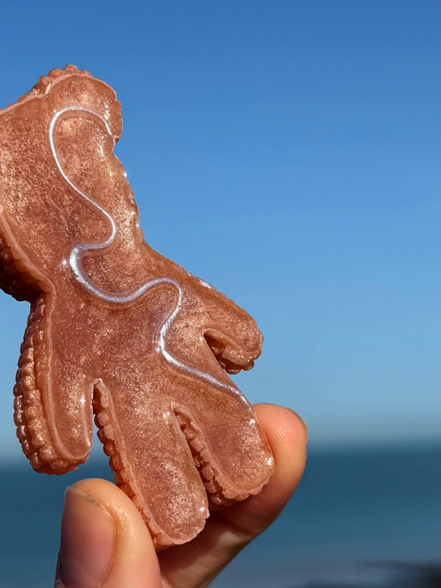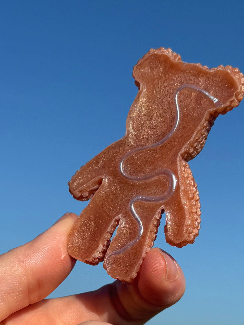 This double sided Jagger bear is a shimmering nude, designed after clean girl baddie nails these jaggers have a hand sculpted wiggle on their back, that wiggle was then hand painted, and then topped with a layer of food safe resin on top. This jagger has a small lip around the edge on the back that you can pass your finger tips over. The wiggle is 3D, each Jagger has a slightly different shaped wiggle on its back, it is thinner and thicker in different places, this new design is good for either tracing your finger tips over the wiggle or tracing your finger tip back and forth over the bumps.