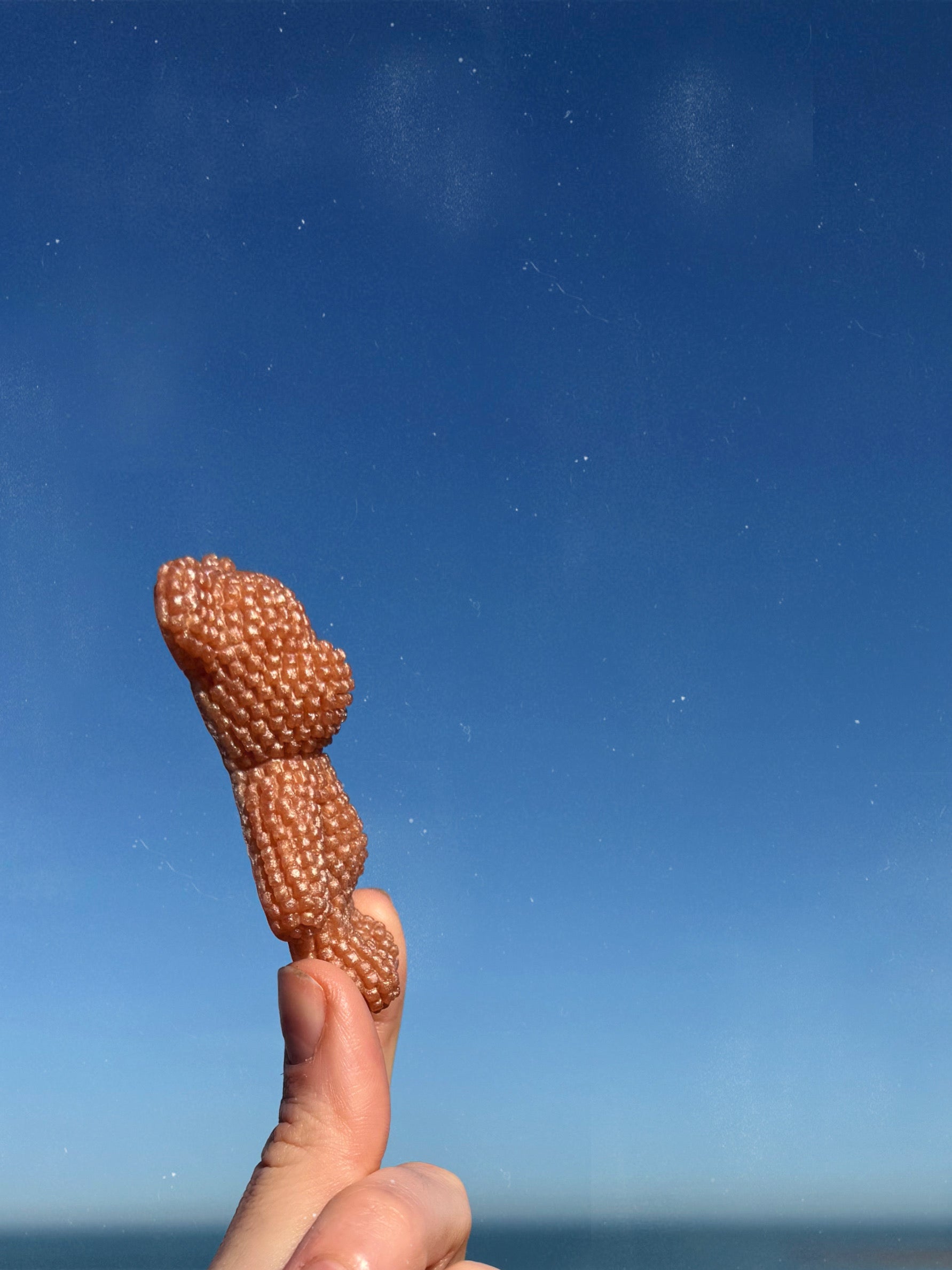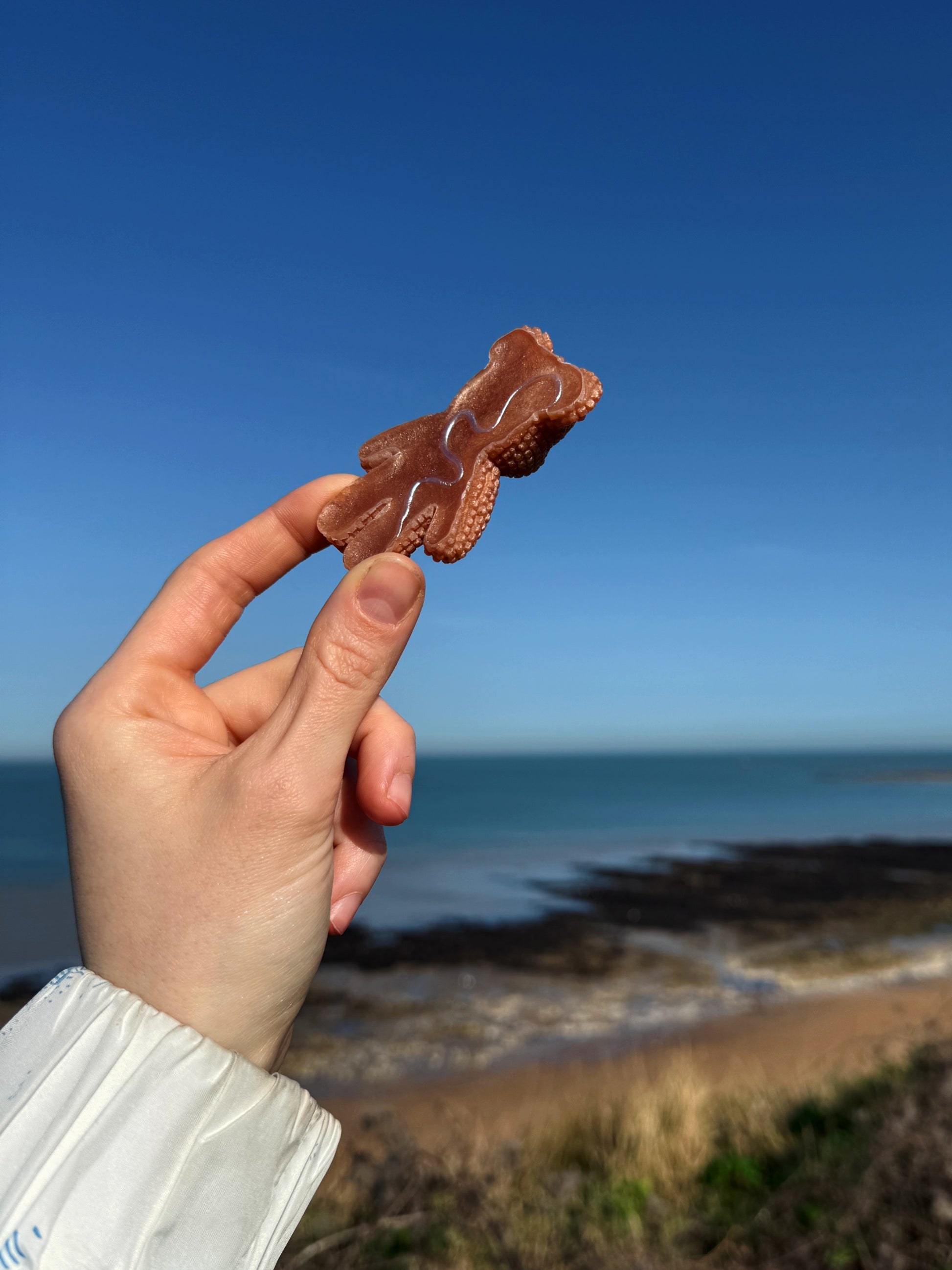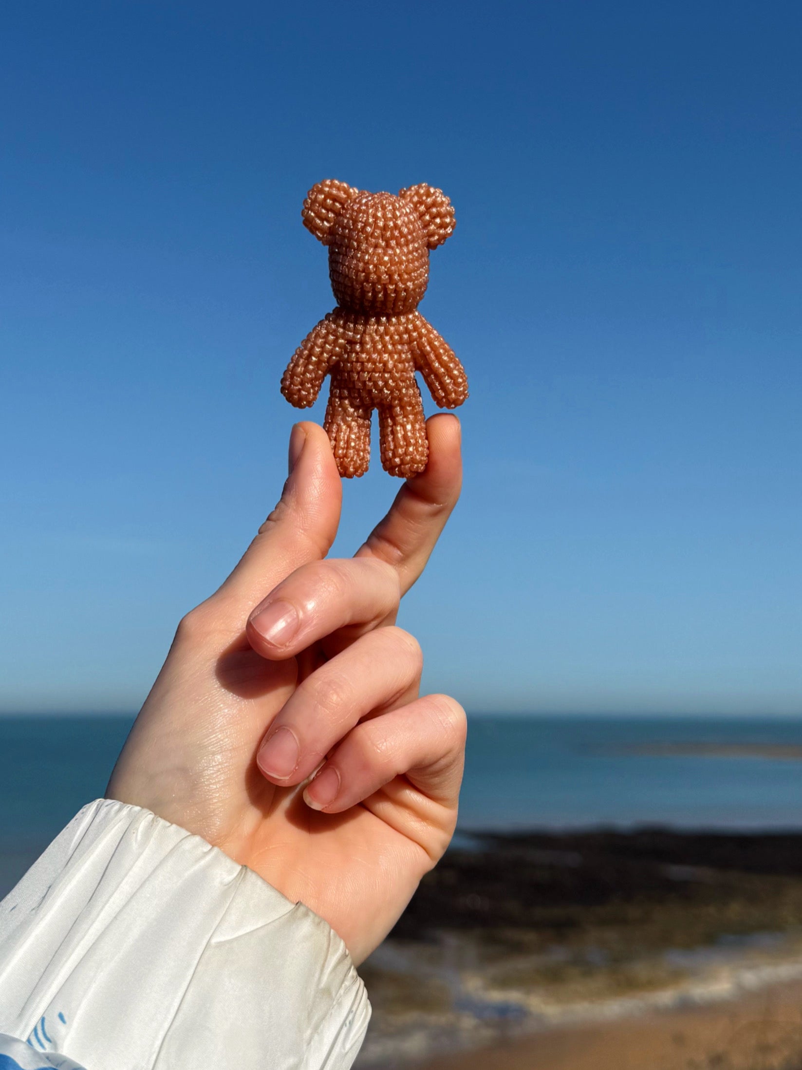 This double sided Jagger bear is a shimmering nude, designed after clean girl baddie nails these jaggers have a hand sculpted wiggle on their back, that wiggle was then hand painted, and then topped with a layer of food safe resin on top. This jagger has a small lip around the edge on the back that you can pass your finger tips over. The wiggle is 3D, each Jagger has a slightly different shaped wiggle on its back, it is thinner and thicker in different places, this new design is good for either tracing your finger tips over the wiggle or tracing your finger tip back and forth over the bumps.