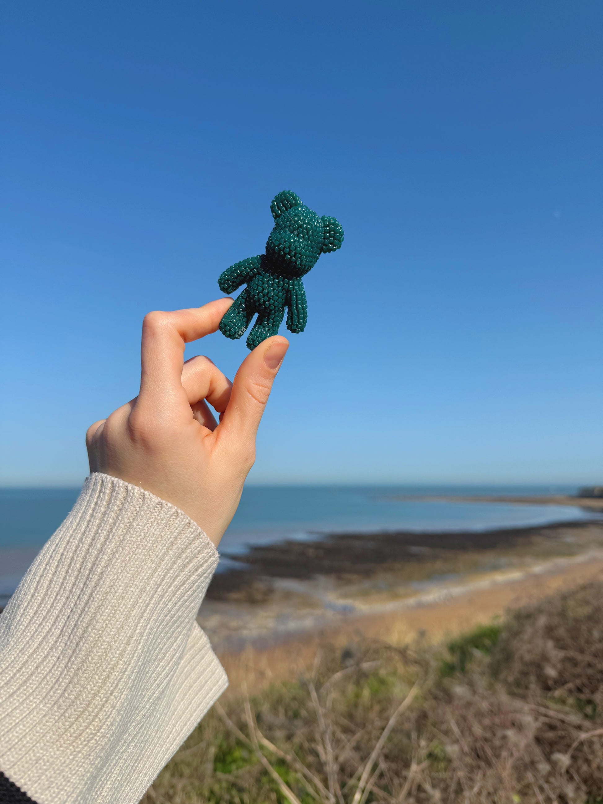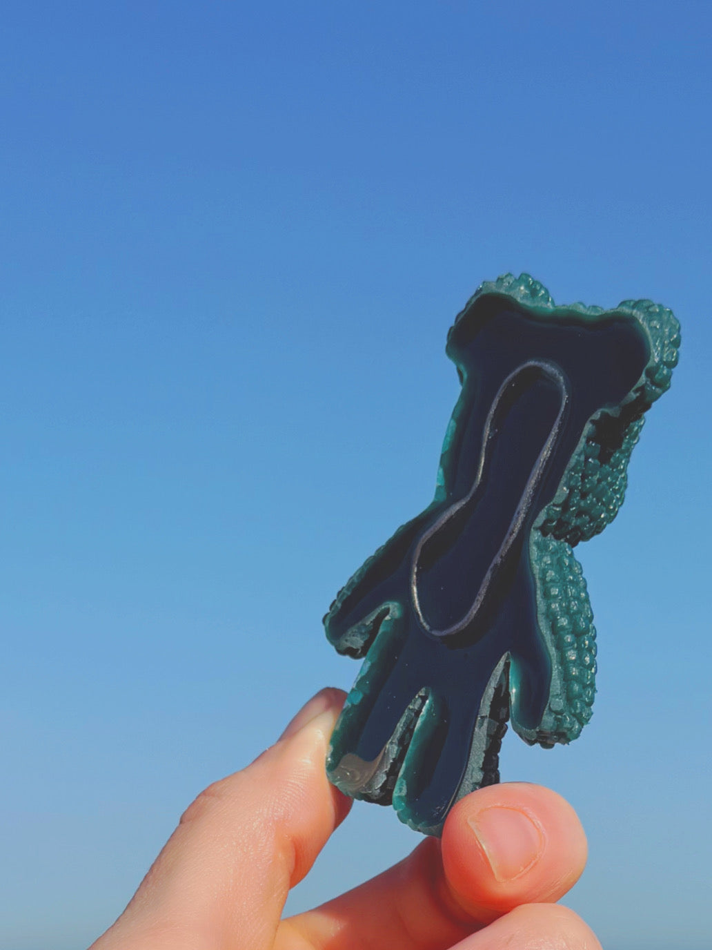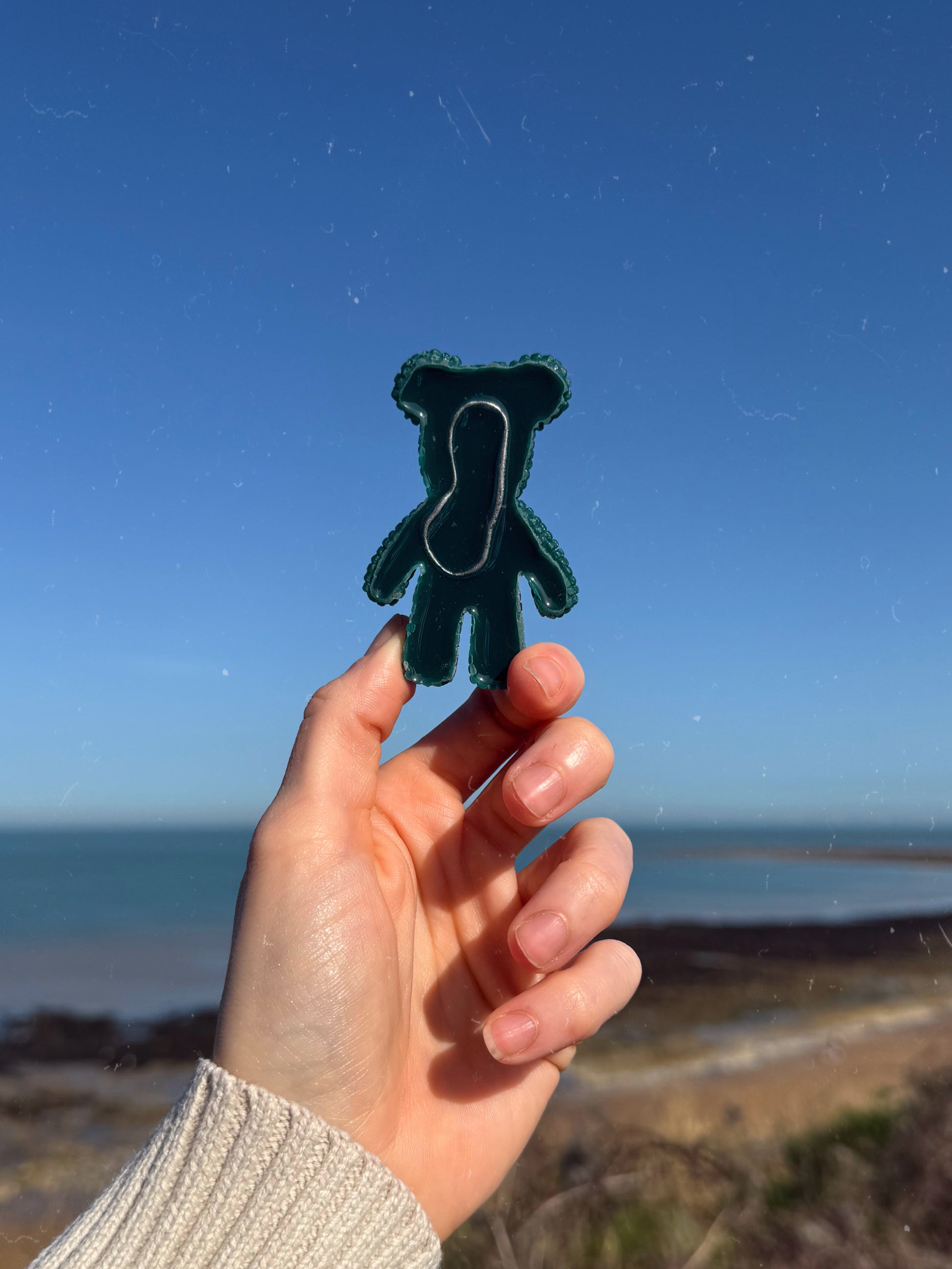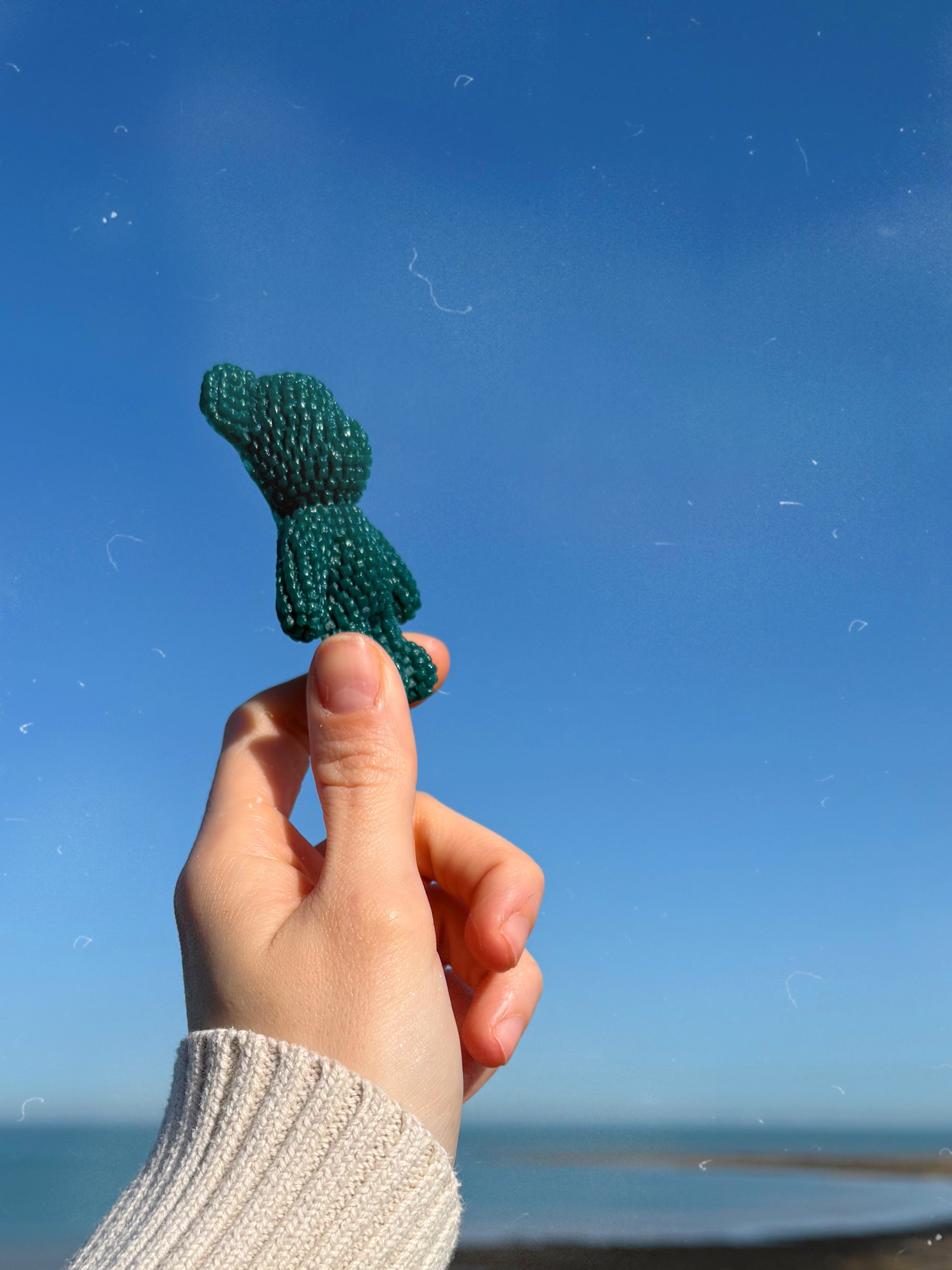 This double sided Jagger bear is a deep green, designed after baddie nails these jaggers have a hand sculpted wiggle on their back, that wiggle was then hand painted, and then topped with a layer of food safe resin on top. This jagger has a high lip around the edge on the back that you can pass your finger tips over. The wiggle is 3D, each Jagger has a slightly different shaped wiggle on its back, it is thinner and thicker in different places, this new design is good for either tracing your finger tips over the wiggle or tracing your finger tip back and forth over the bumps. The wiggle is chunky in some bits and easily feelable and barely there in other bits.