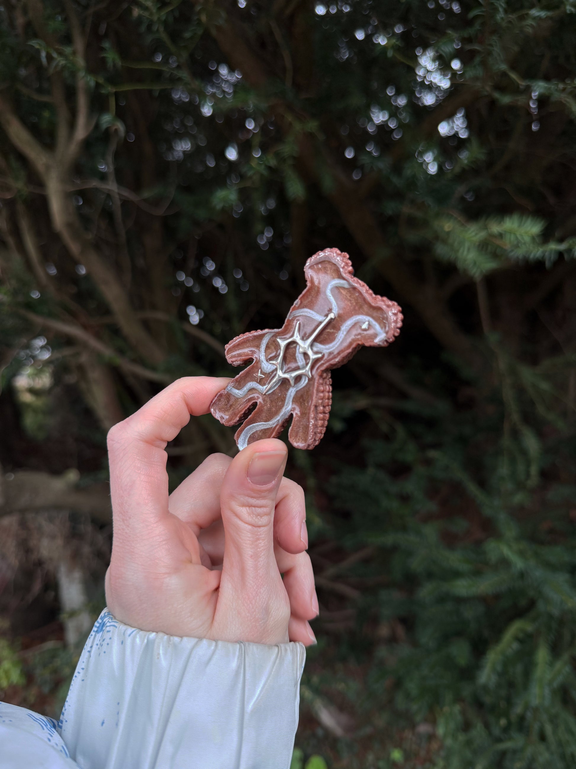 This double sided Jagger bear is a shimmering chocolate brown, on the back are hand painted silver wiggles on top is a silver metal heart charm, the inside of the heart inverts in, for your thumb to follow the pattern inside not external. You can then trace the outside of the shape.