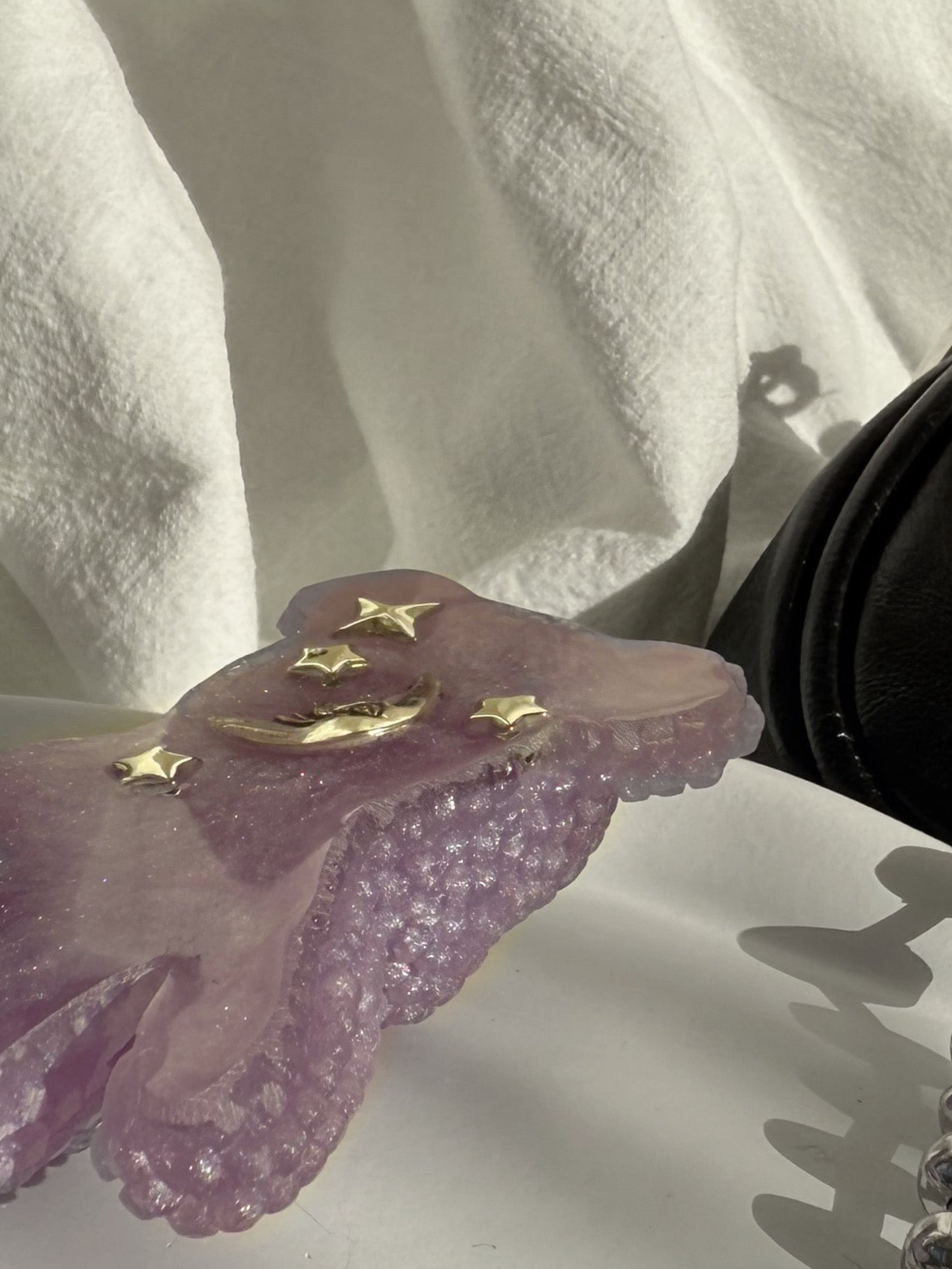 This double sided Jagger bear is a solid lilac sparkle, unlike our other jagger bear back textures, this is one of our barely there textures, inside of it being super textured the moon and stars are set just into the back layer of resin and the subtle textured can be felt under your fingers tips.