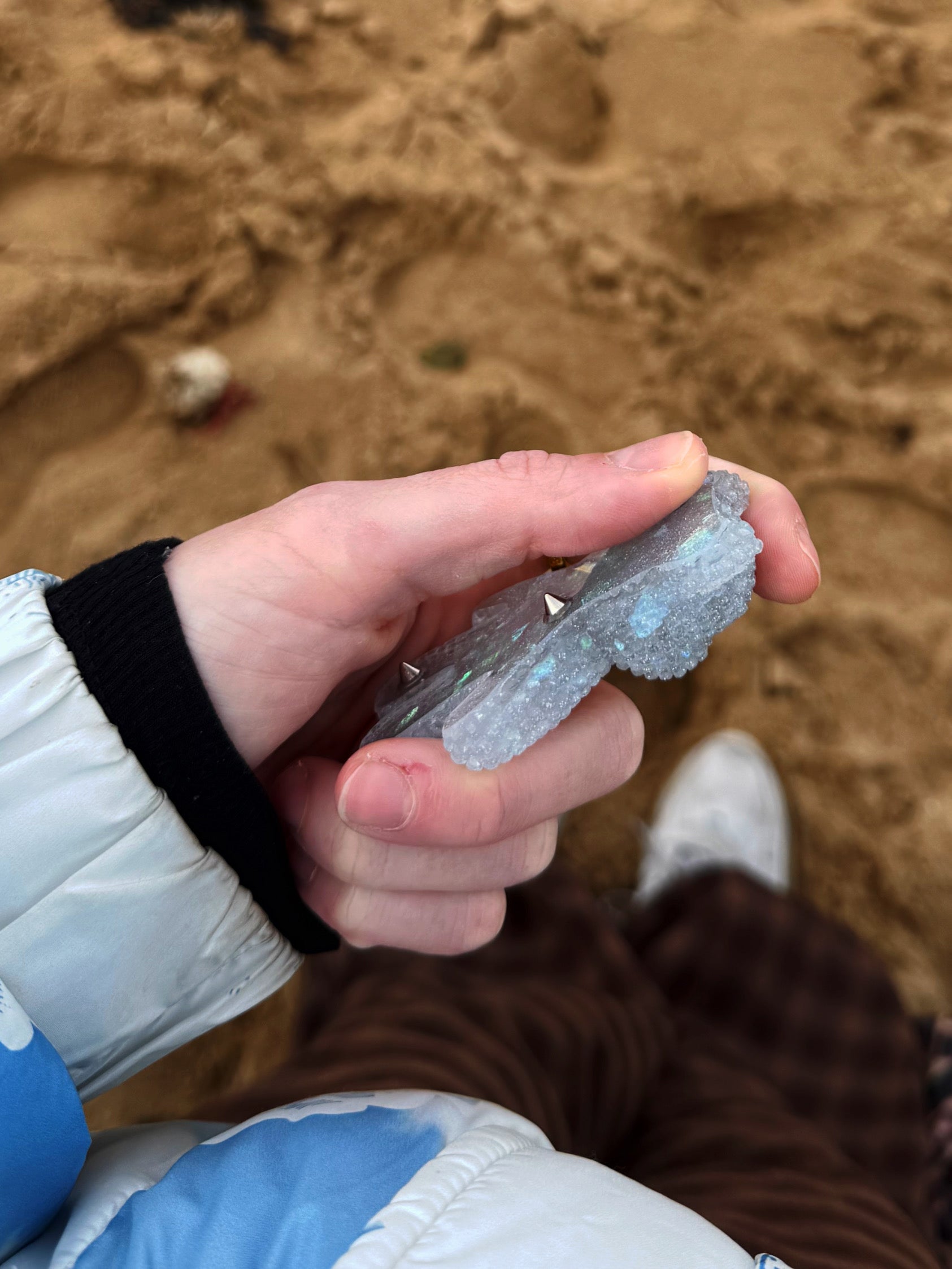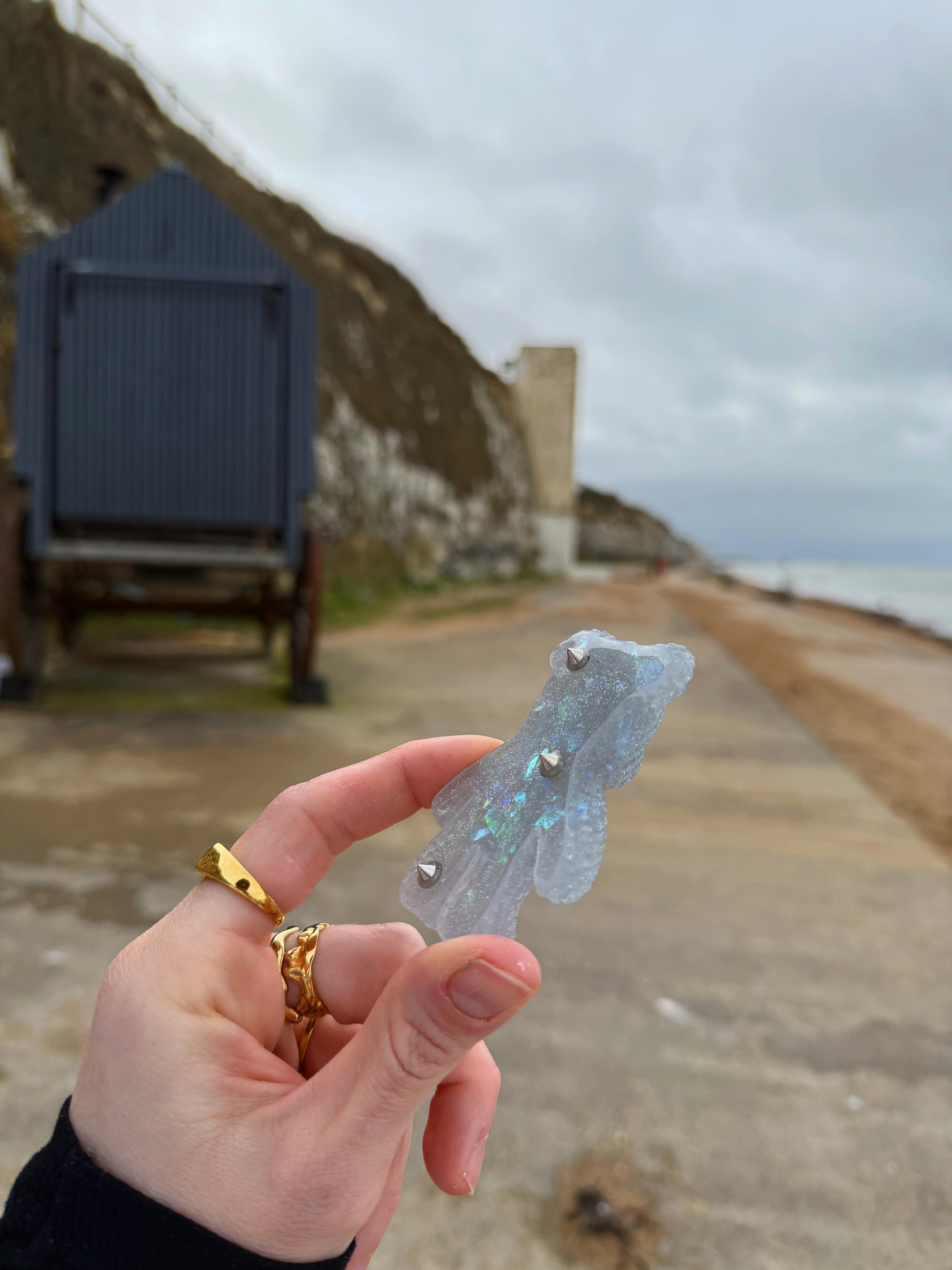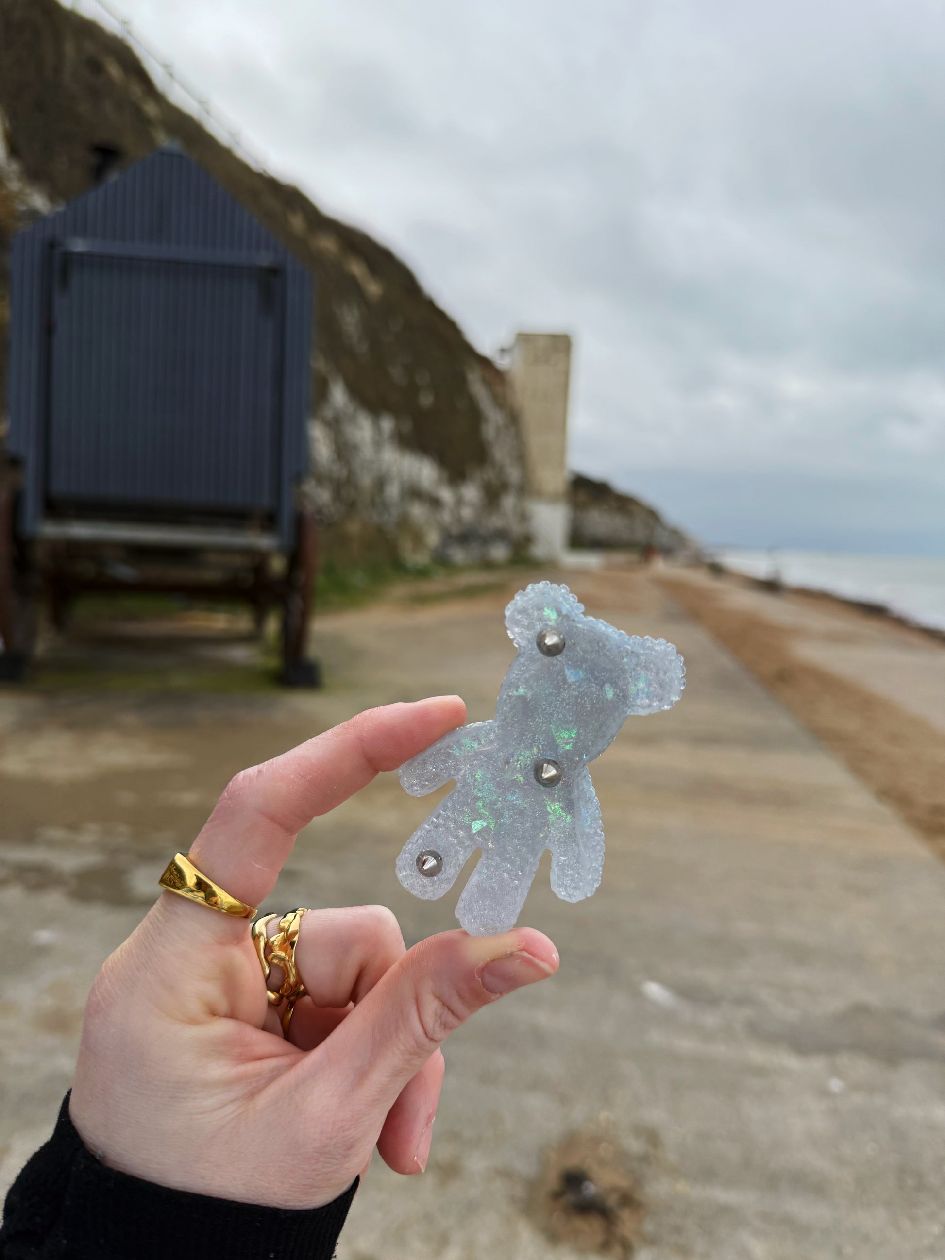 This double sided Jagger bear is a solid silver sparkle with mixed textured inside, sporting both fine, thick and chunky glitters this base shimmers in all lights, on the back there are 3 individual safe spikes spread out over the entire bear, one in the ear, one in the centre and one on the leg. Our safe spikes are designed to be gently pressed against the skin for people who need pain stimming tools.