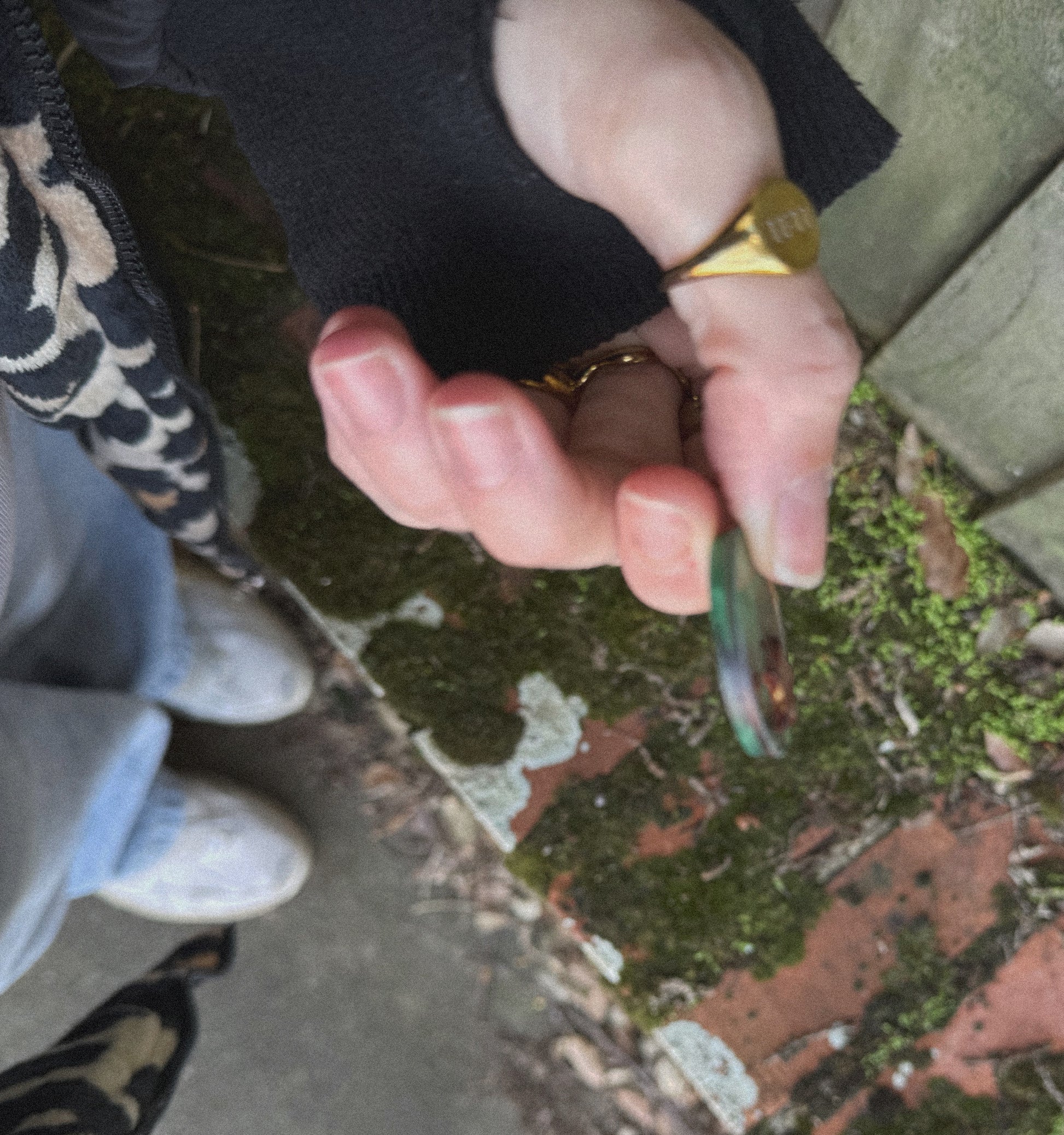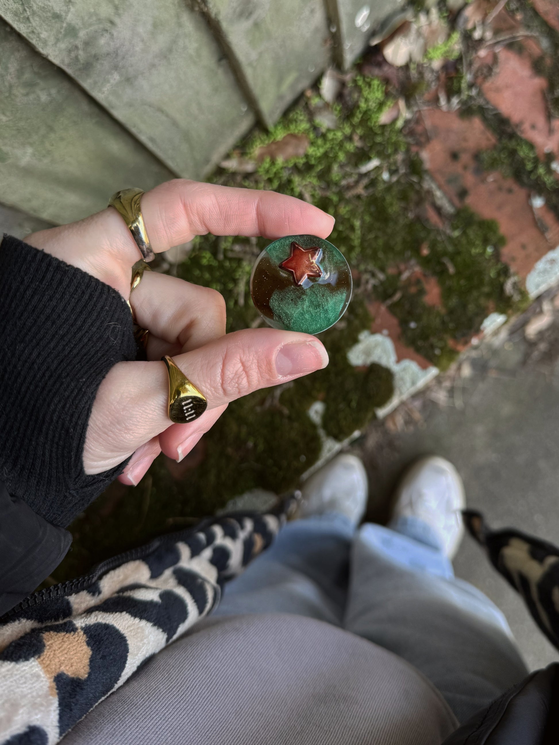 This gorgeous micro orb is fairy garden inspired base of greens and browns with a natural star on top to give you a bump of texture under your finger tips. The smooth resin and the textured moon provide two different temperatures as your thumb circles round the tiny disc.