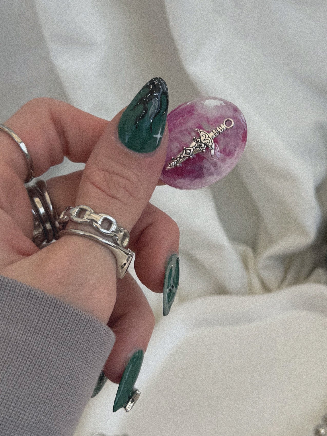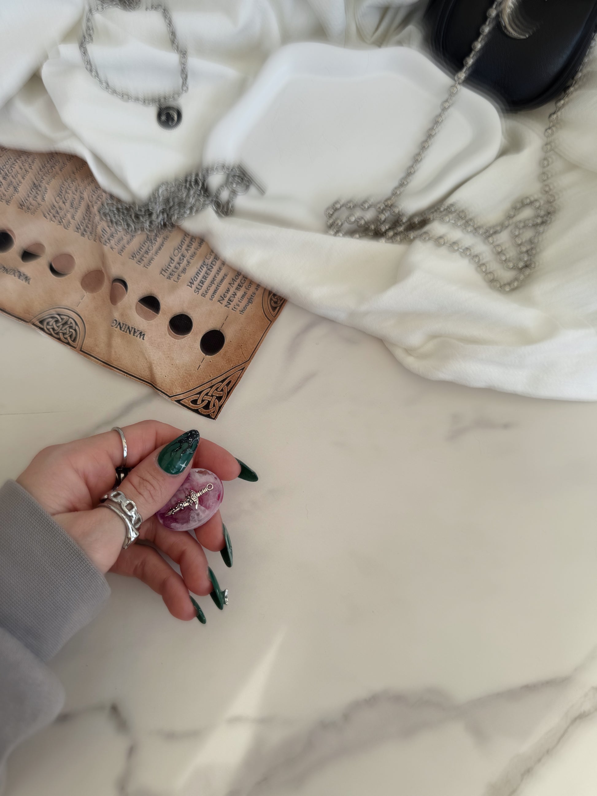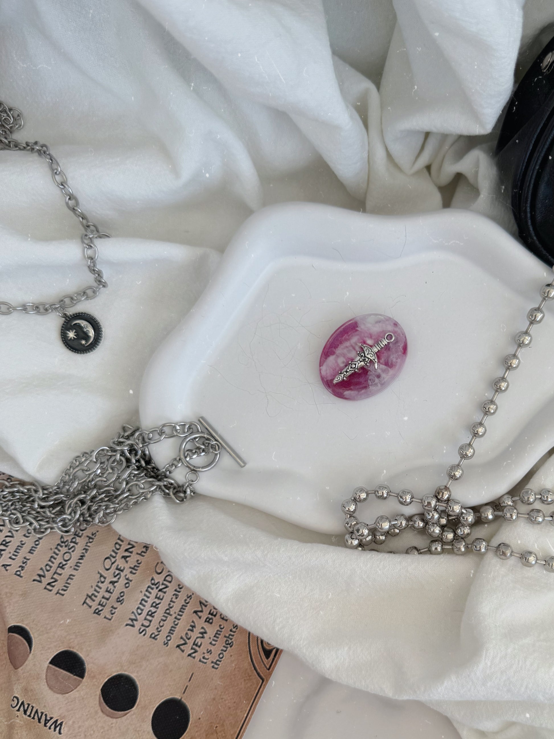 Hello new baby, fresh for November 2025 this tiny oval girl is the perfect addition to your pocket. This gorgeous oval is a pink and white marbled base with a subtle sparkle base with a miniature silver coloured dagger on top. The dagger is layered ontop of the pink instead of inside giving you a subtle hard texture to rub your thumb over on top.