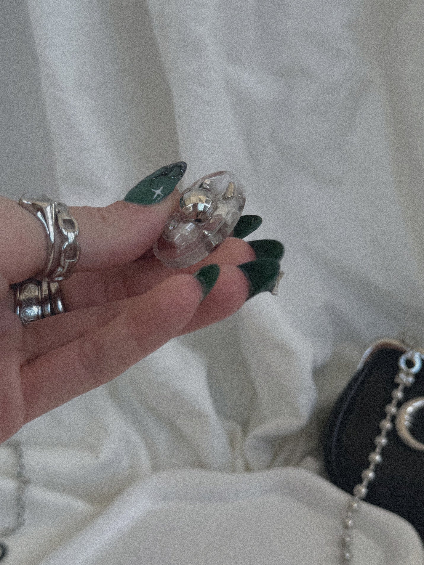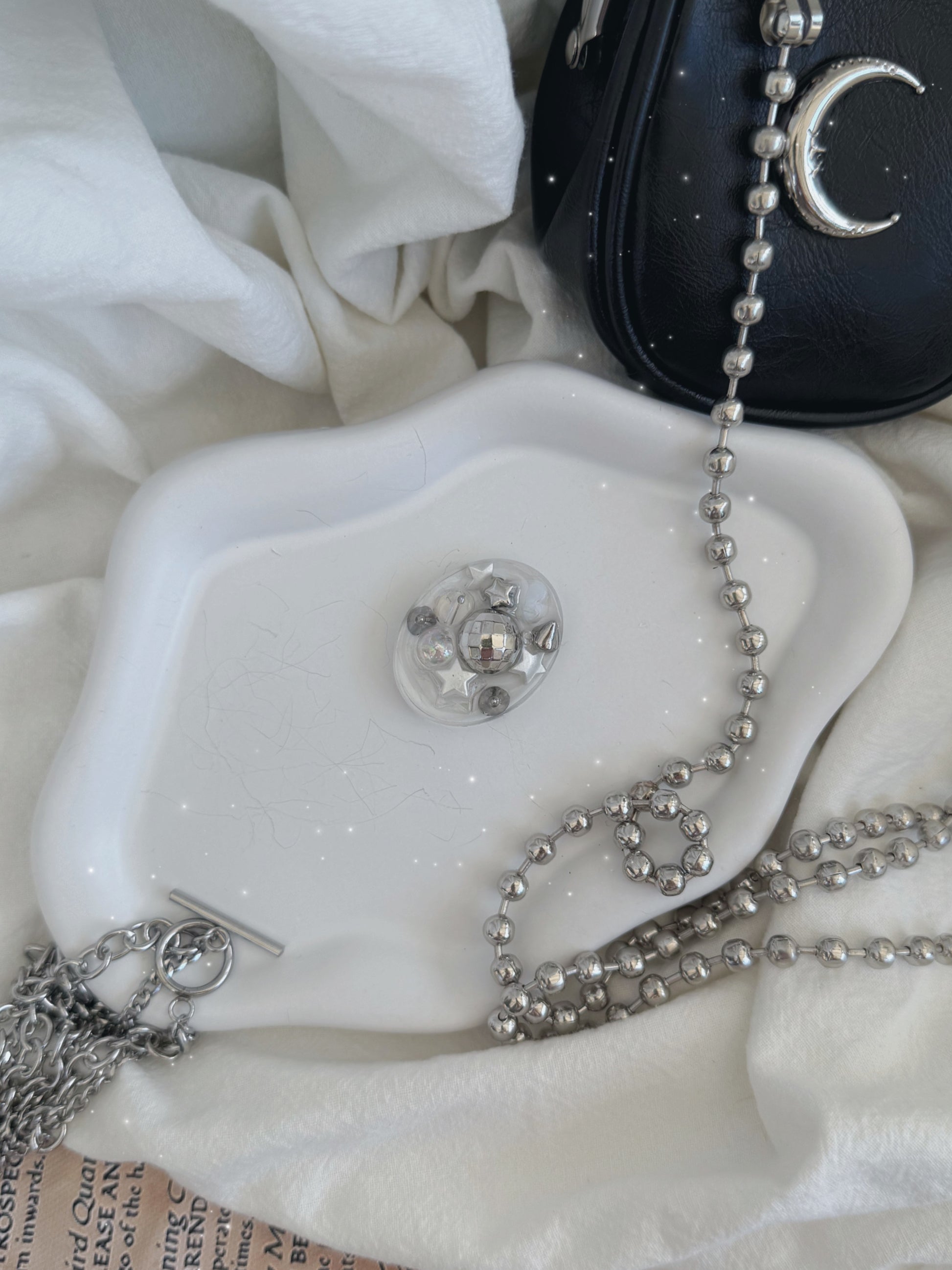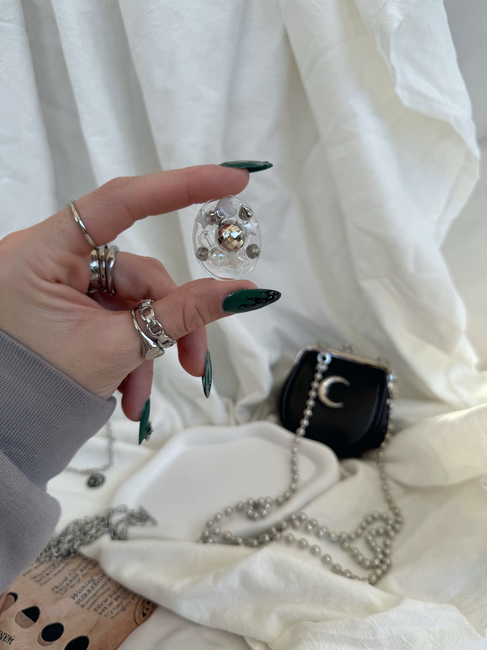 Hello new baby, fresh for November 2025 this tiny oval girl is the perfect addition to your pocket. This gorgeous oval is a transparent base with white and silver treasure on top, the main visual focus of this piece is a tiny silver disco ball.